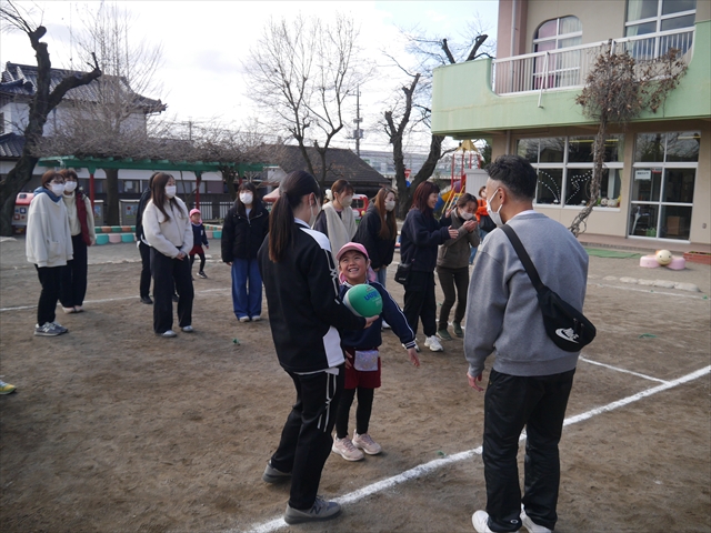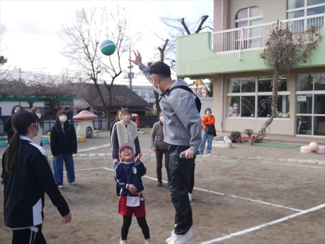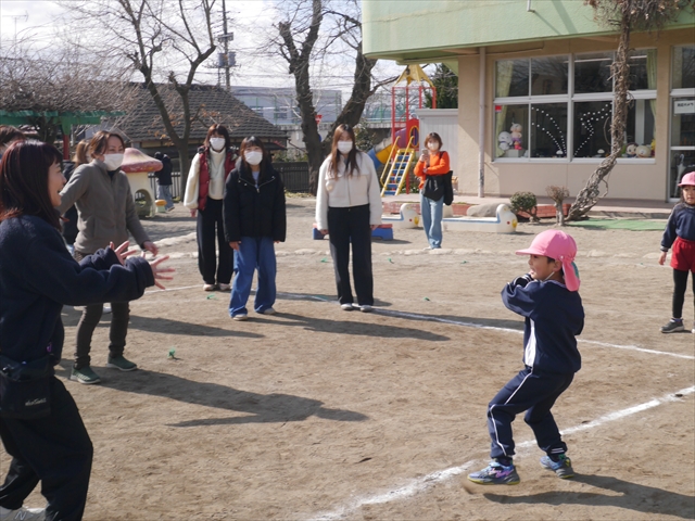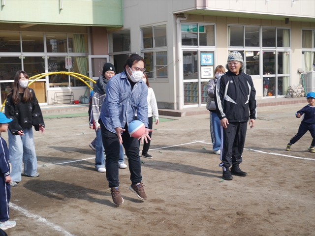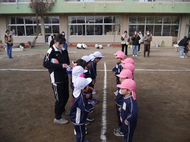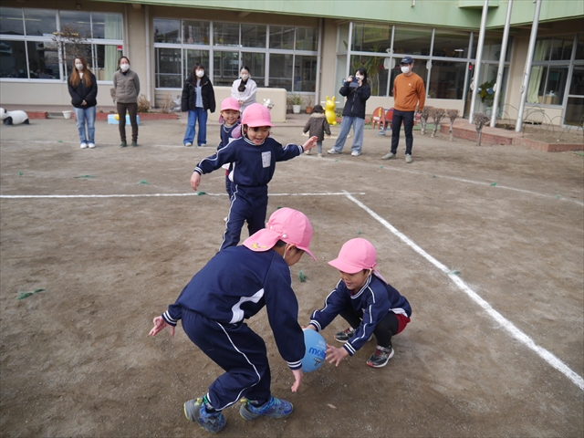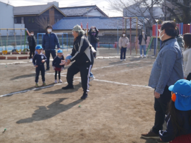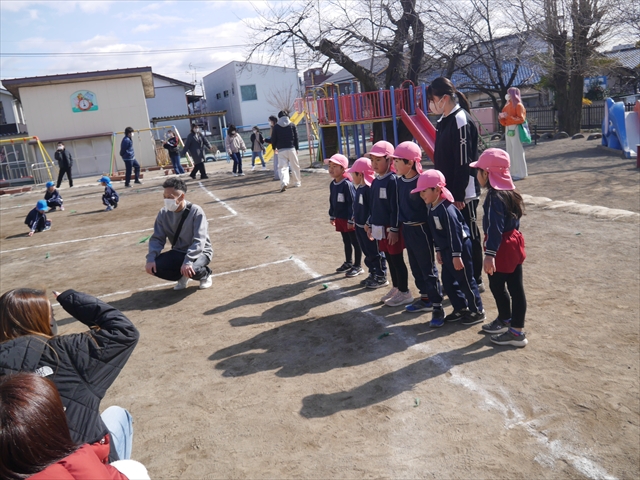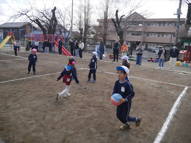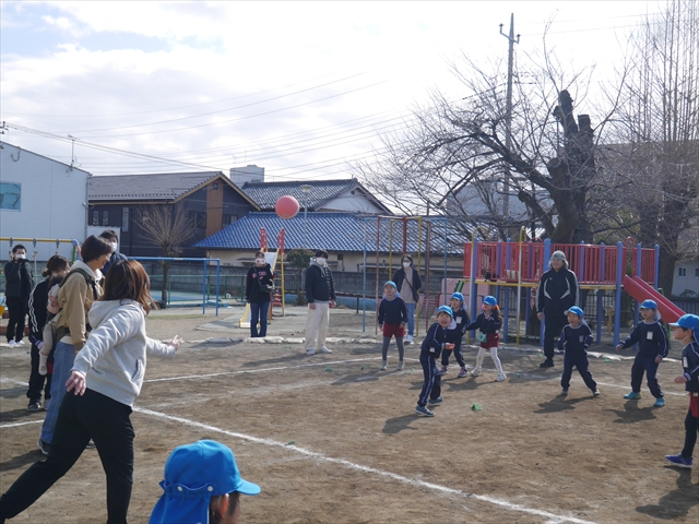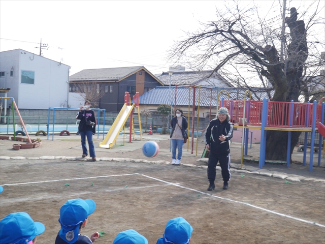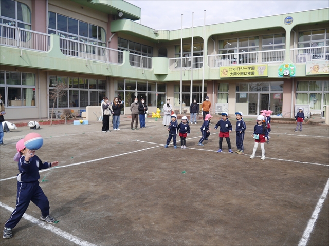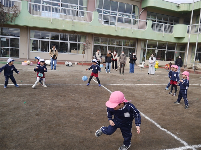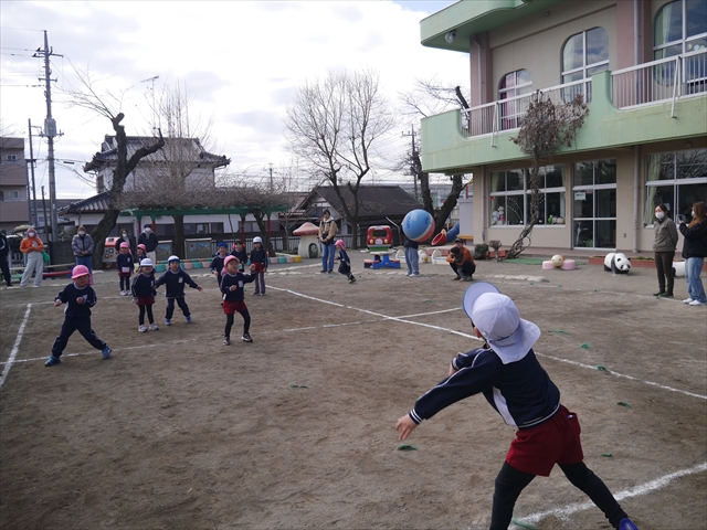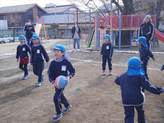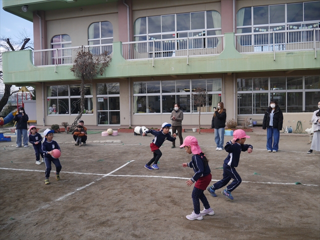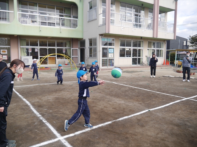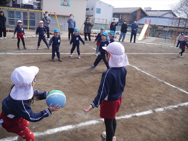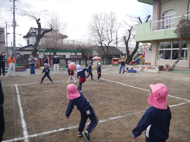 今日の年長組保育参観は「ドッジボール大会」でした。最初はうみ組VSたいよう組で子どもたちの戦う姿を保護者の方に見ていただきました。如何だったでしょうか?昨年2月から始めたドッジボール教室の成果が少しは出ていましたでしょうか?年中児の今頃ドッジボール教室を始めたのですが、身体も小さかったですし、体力も無かったので、とにかくハプニング続きで大変な状況でした。投げられない、取れない、逃げられない、ルールが全く理解できない、味方にボールを当ててしまう(^_^;)・・・等々悲惨な状態でした。(-_-;) しかし、1年間指導していく中で、練習したり、試合したりして、楽しみながらドッジボールをやっていくうちに、今日のような一応ドッジボール大会らしい試合ができるようになりました。特にボールから逃げるのが上手になったと思いませんか!(^_^;) おそらくどこの小学校1年生でも、今日のように子どもたち全員がドッジボールの楽しさを味わいながら試合ができるようにはならないのではないかと思います。まだ相手までボールが届かない子どもたちもおりますが、投げるファームが分かっていますので、小学校へ入り身体が大きくなり、体力もつけば、みんな相手までボールが届き、当てられるようになると思います。とにかくみんなドッジボールの楽しさを知り、ルールが分かり、取るのも投げるのも逃げるのも1年前に比べると上手になりました。子どもたちの成長は本当に素晴らしいと思いますし、改めて「教え育む、教育」って、大切なんだなあと思います。(*^_^*)