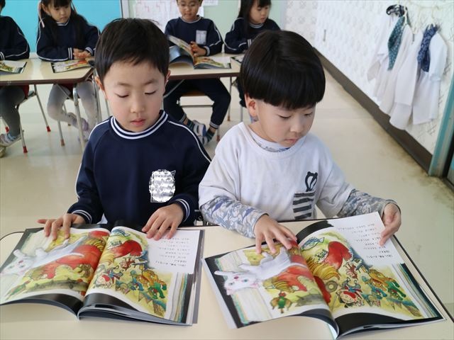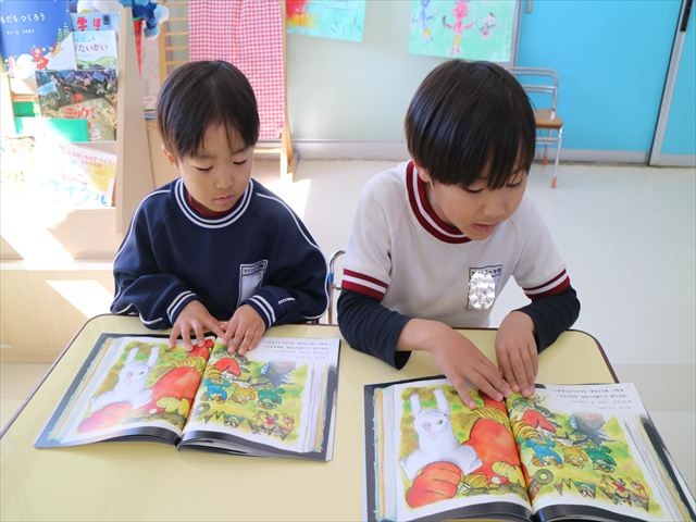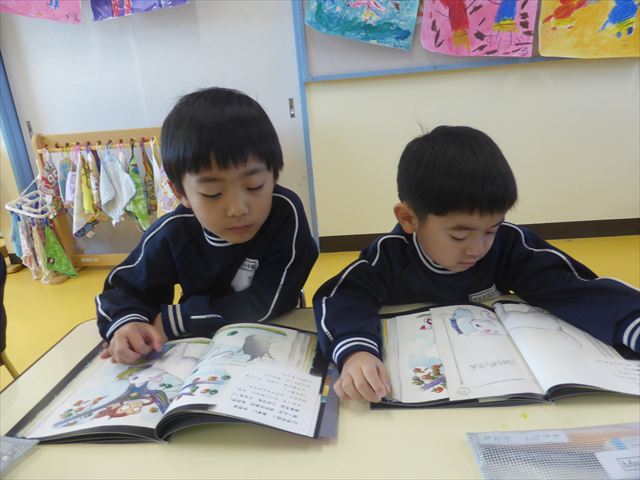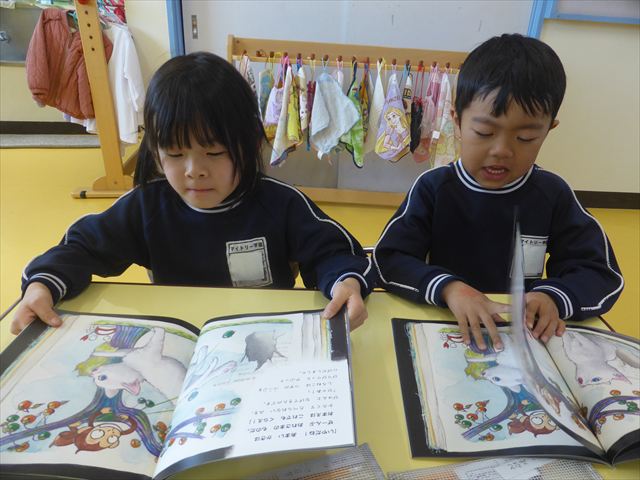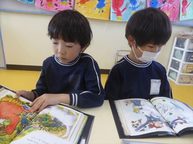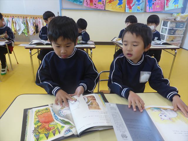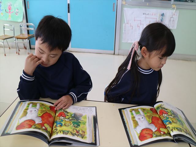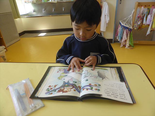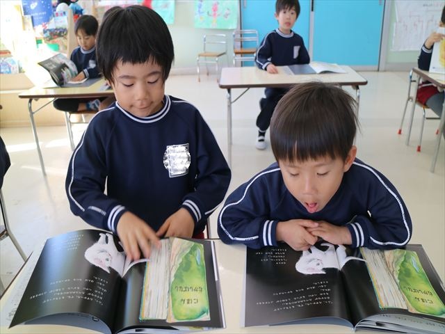 国語の時間では月刊誌を読みました。今回は白ネコが昔話の世界に行くお話でした!みんなが知っている昔話だったので興味を持って読むことが出来ました!また先生と一緒に文字を指で追いながら読むのも上手になりました!
