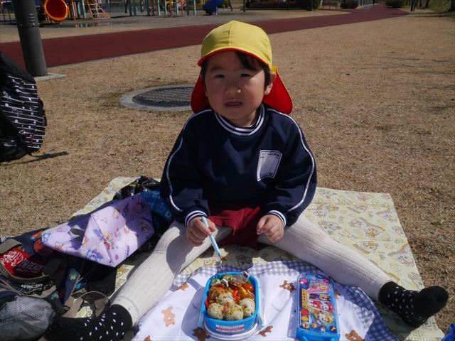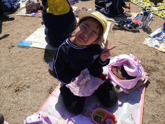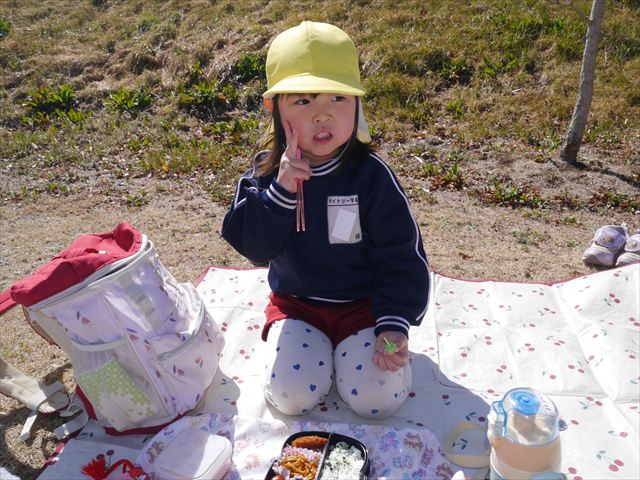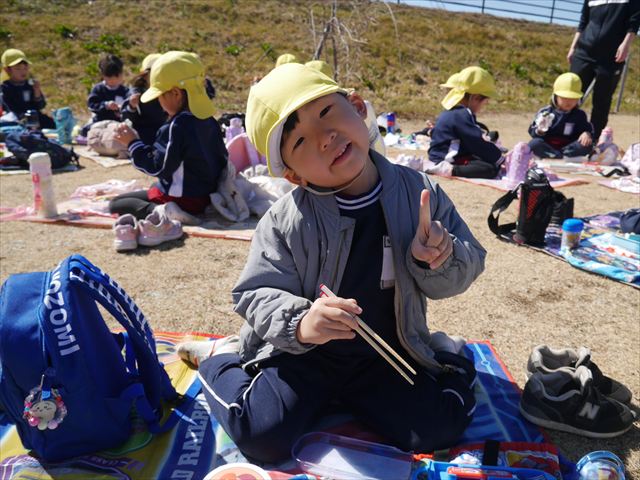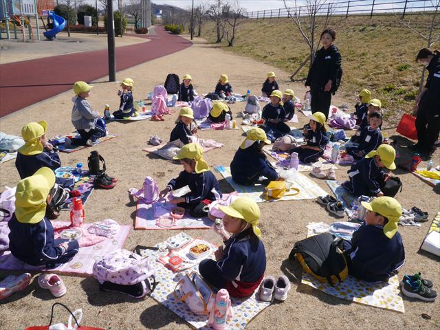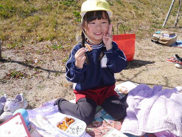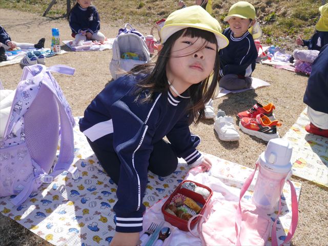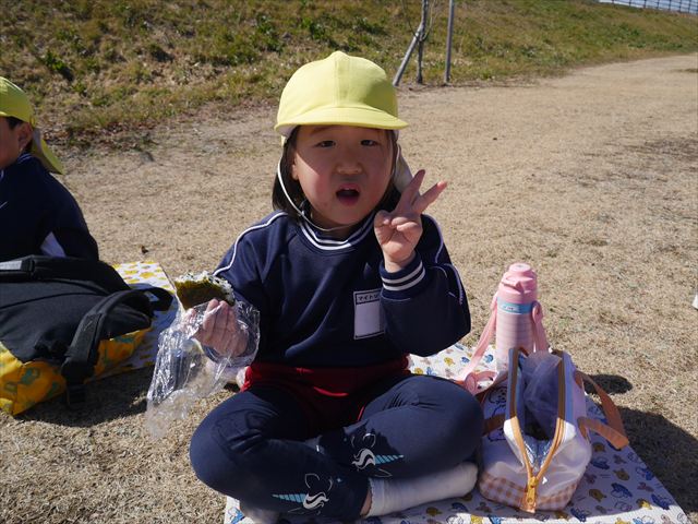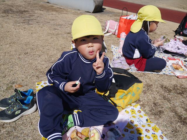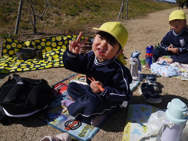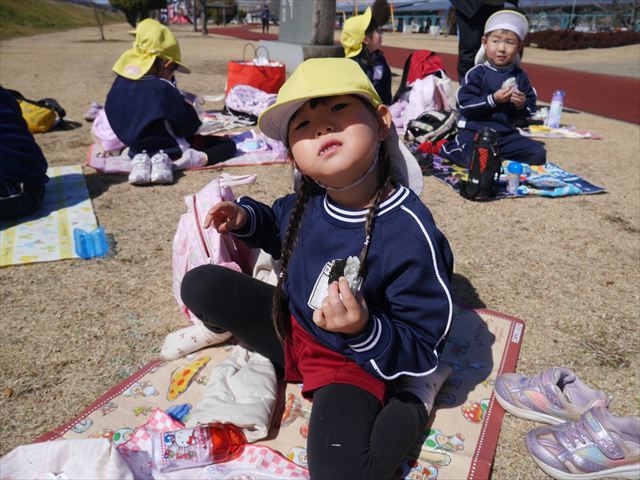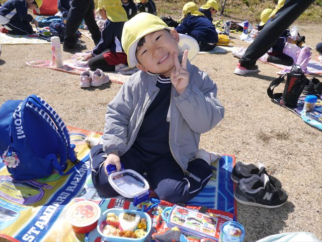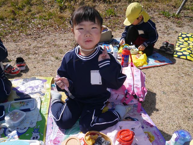 お昼ごはんの頃は、少し風吹き始めましたが風も止み背中がポカポカするような暖かい陽気の中、お家の人が愛情を込めて作ってくれたお弁当をみんな気持ちよく「おいしい!おいしい!」と喜んで食べていました。良かったね!(^