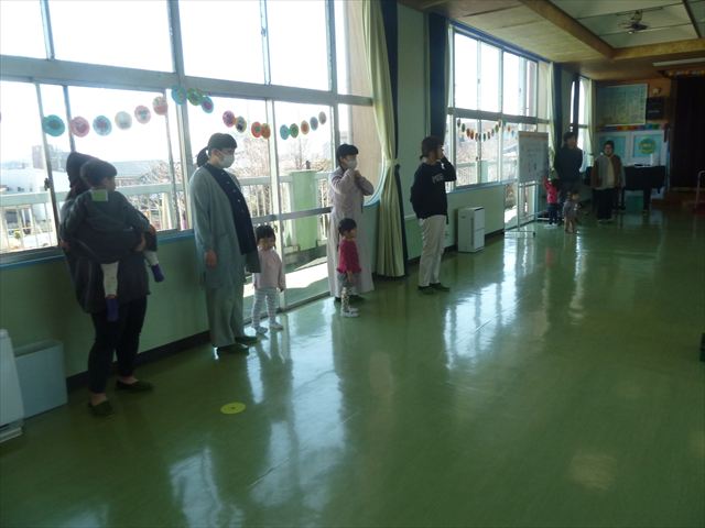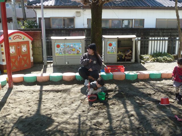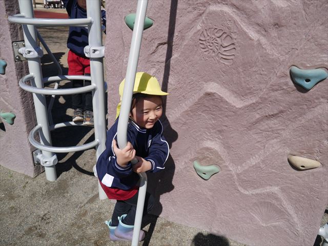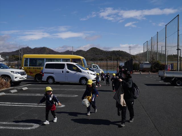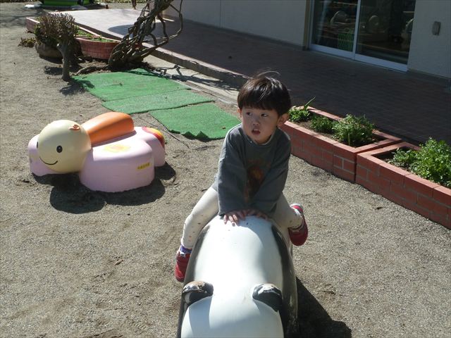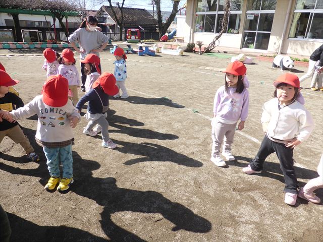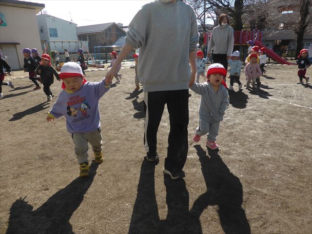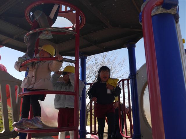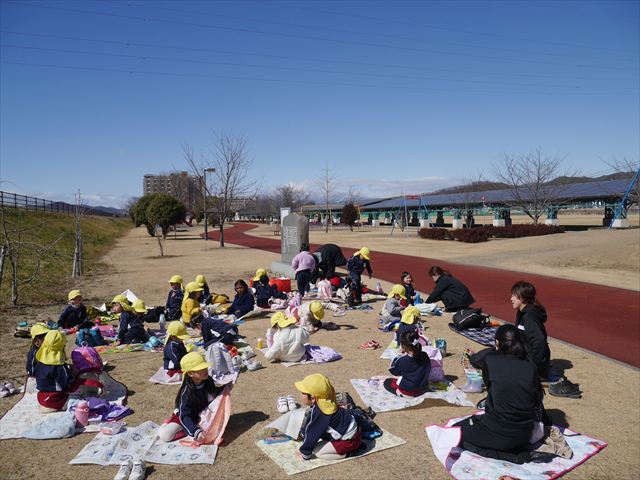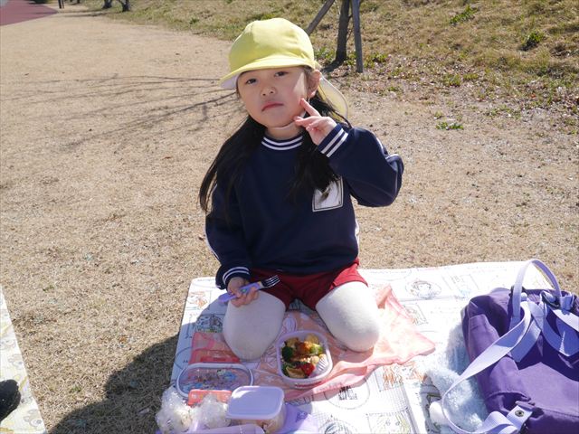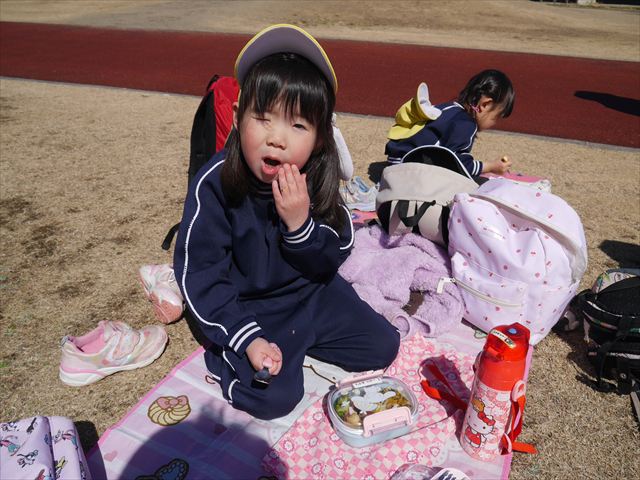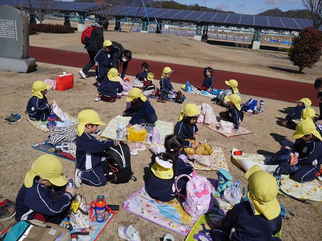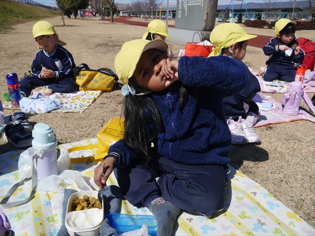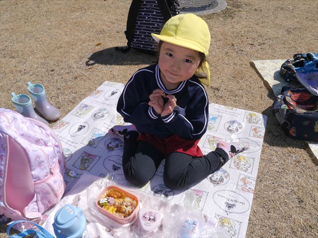 お昼ごはんの頃は、少し風吹き始めましたが風も止み背中がポカポカするような暖かい陽気の中、お家の人が愛情を込めて作ってくれたお弁当をみんな気持ちよく「おいしい!おいしい!」と喜んで食べていました。良かったね!(^