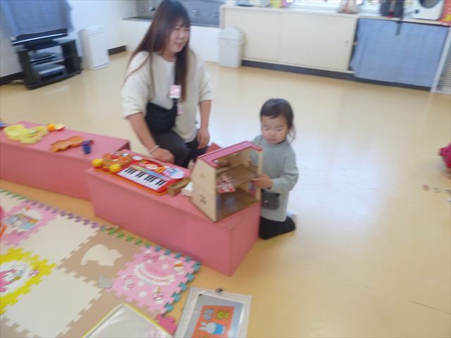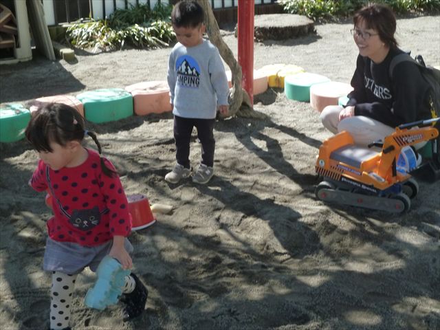 今日は、満2・3歳児さんみんなで戸外遊びをしました!満3歳児さんが満2歳児さんに「こっちおいで~」「これどーぞ!」と優しく声をかける姿や、満2歳児さんが満3歳児さんのまねっこをして一緒に遊ぶ姿など、楽しそうな様子がたくさん見られました(^^♪