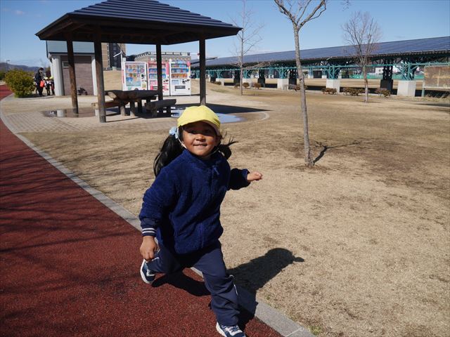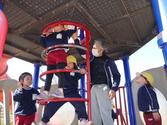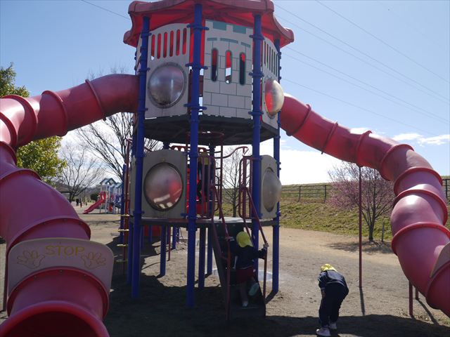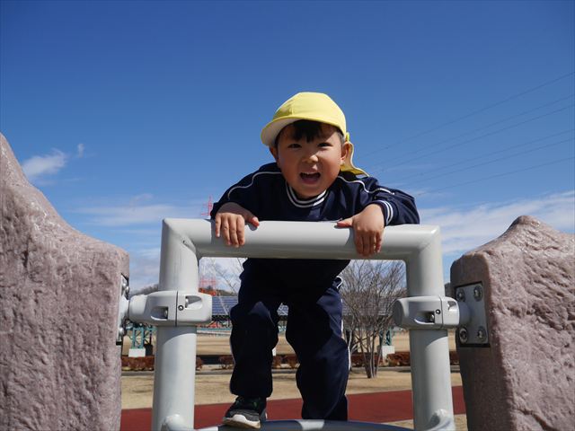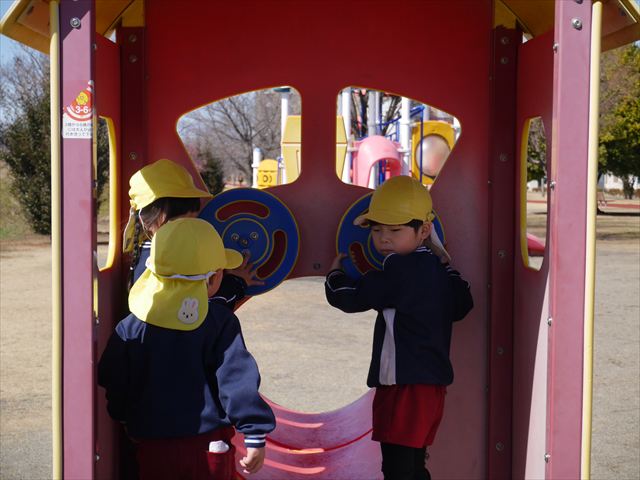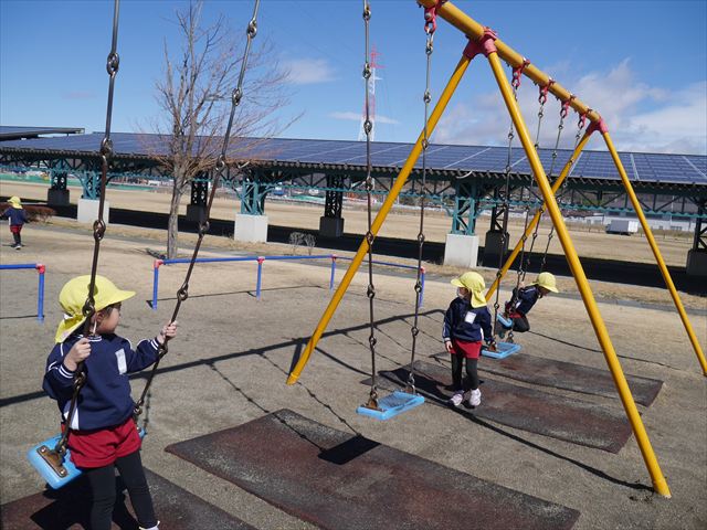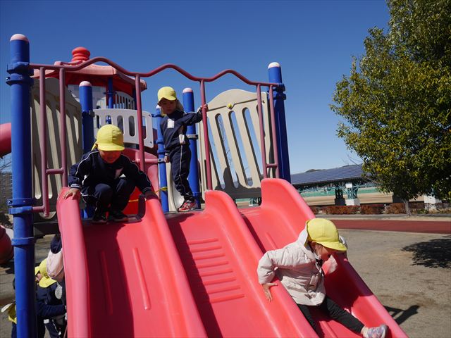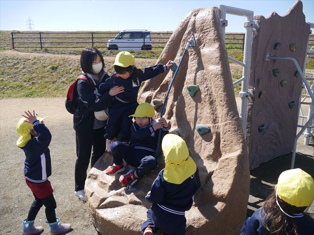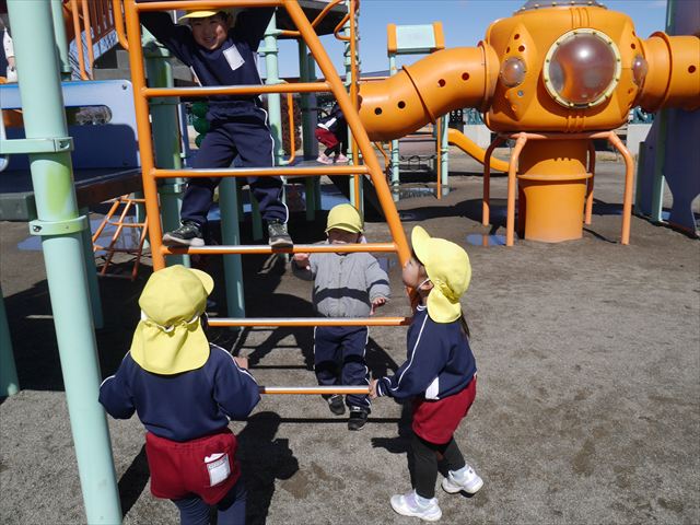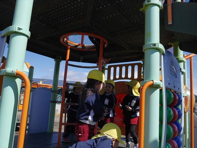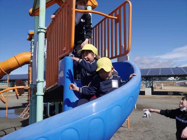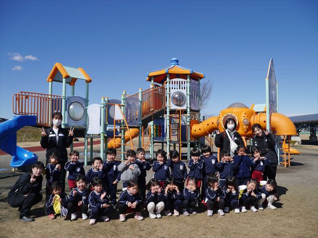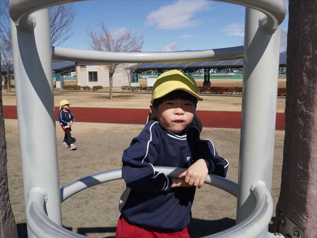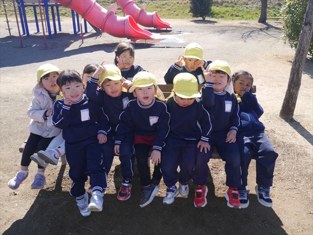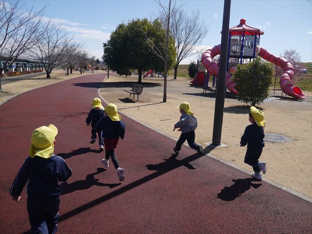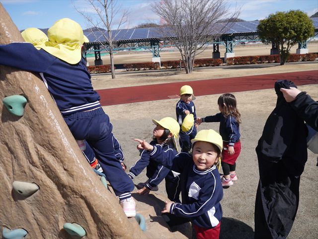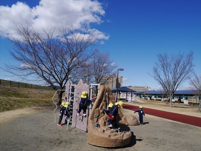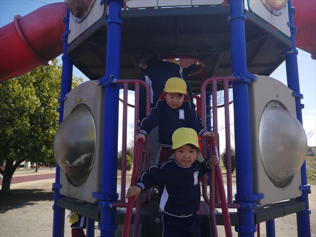 今日の年少さんたちは、待ちに待った「お別れ遠足」は、「大室公園」へ行く予定でいたが、トイレが使えないことや前日の雨が心配だったことで場所を変更して「足利ガスふれあい公園(五十部運動公園)に行ってきました。暖かい絶好の遠足日和となりました! (^_^)bただ、昨日の雨で水たまりがあり遊び辛い部分もありましたが遊具も多く公園につくとすぐに遊びたくてそわそわしている年少さんでした(^^♪色々な複合遊具でお友だちと一緒にたくさん遊ぶことができました。