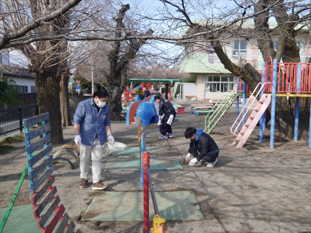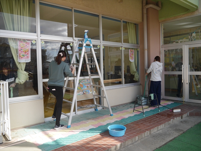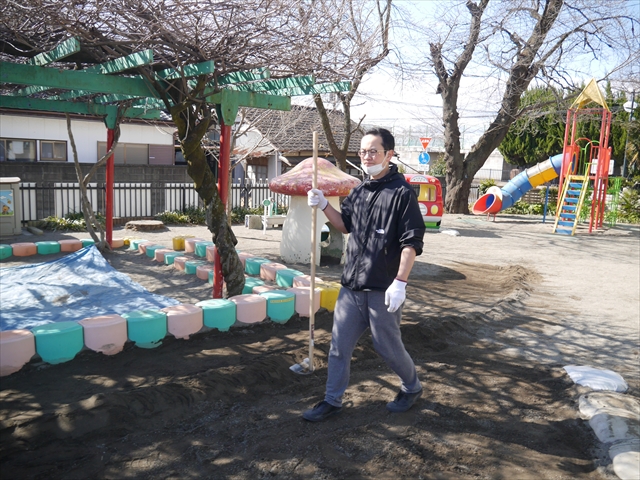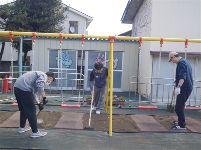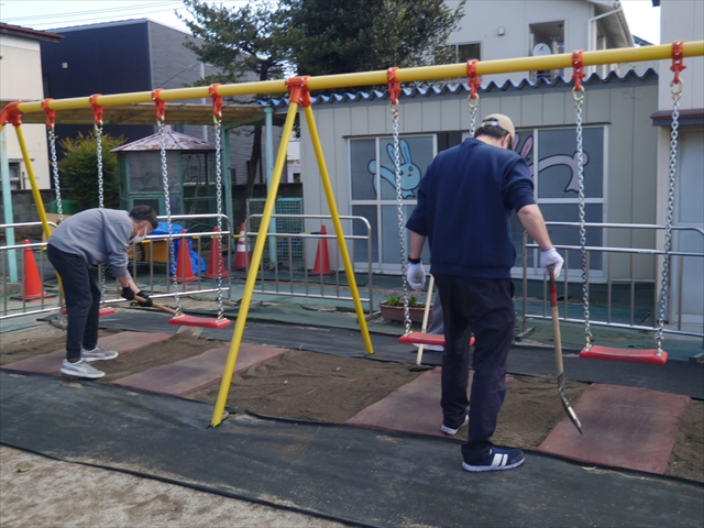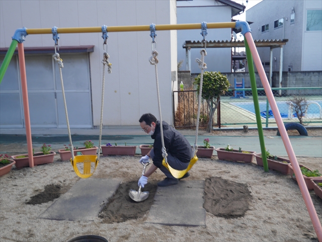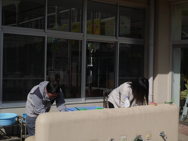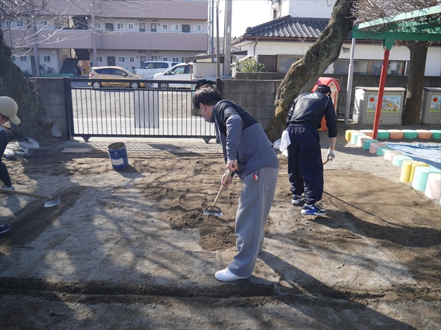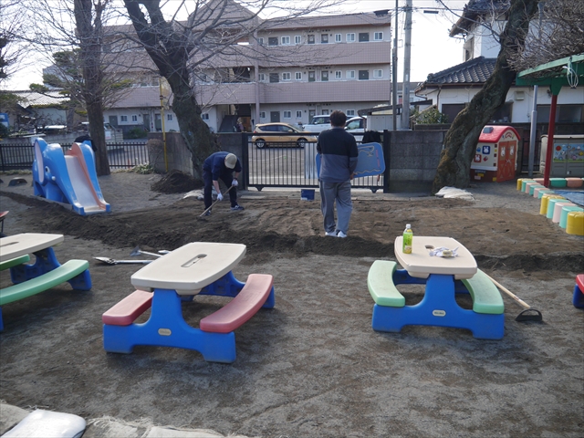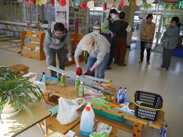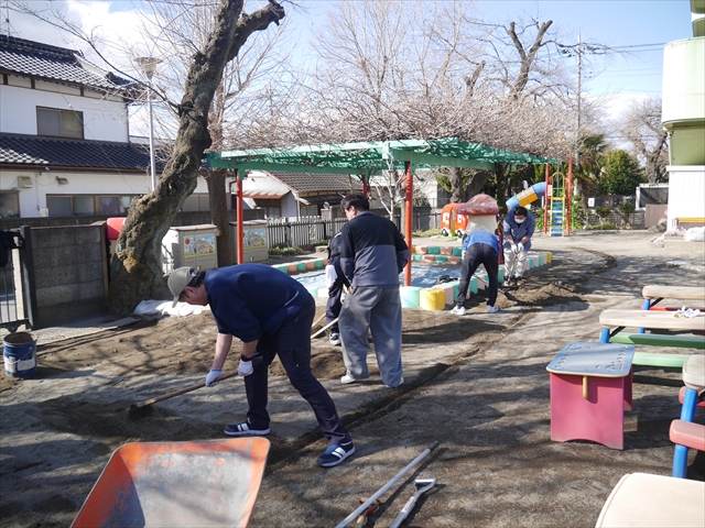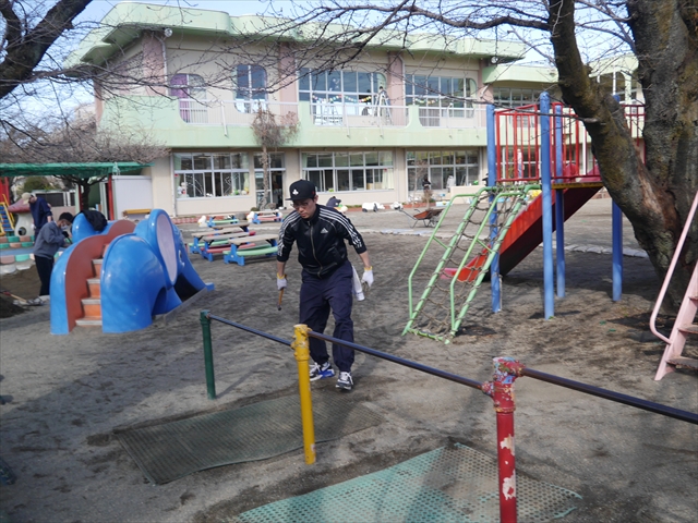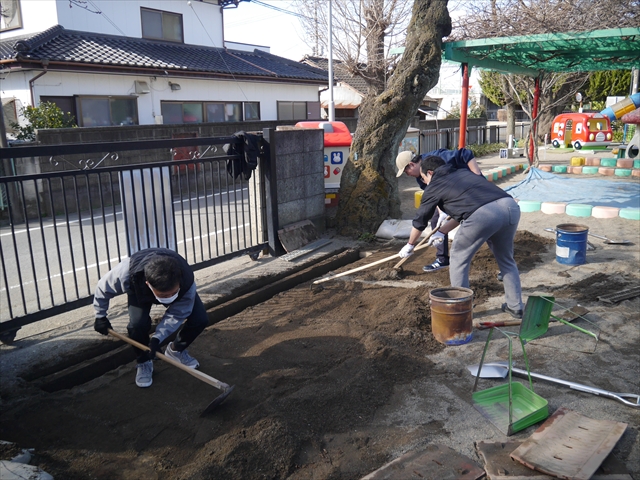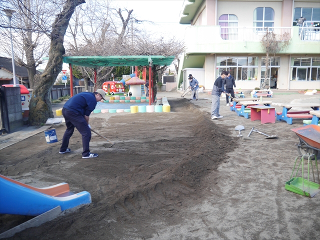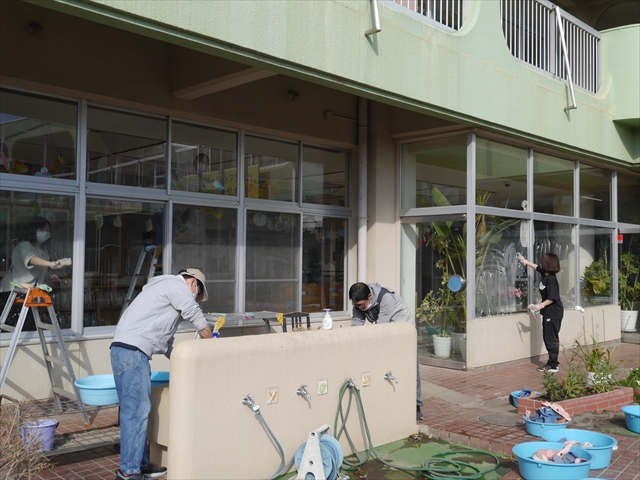 昨日職員で1階3教室のフロア清掃・ワックス塗りをしましたので、各教室内への物品移動から始まり、各教室の窓拭き、各教室清掃、各トイレ清掃などなど園舎内の様々な箇所を綺麗にしていただきました。そして園庭では、ぼろぼろになった土嚢の交換していただいたり、南門側溝泥だしや土砂が流れるのを防止する堤防を築いていただいたり、鉄棒やのぼり棒のマットの整地をしていただいたり、たくさんの場所を整備していただきました。お陰様で園庭も見違えるようにとっても綺麗になりましたし、園舎内各所の窓やフロアやトイレもとても綺麗になりました。厚く厚く感謝申し上げます!<(_ _)> これで卒園式も新年度も入園式も気持ちよく迎えられます。本当にありがとうございました!m(_ _)m さすがお父さん、お母さん方は、若いですしフットワークもいいですね~!その姿は、美しい!!(^_^)b (*^_^*)