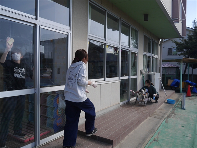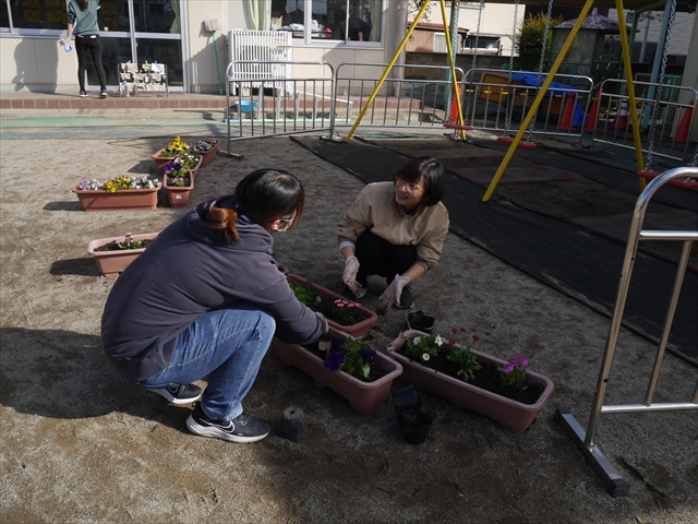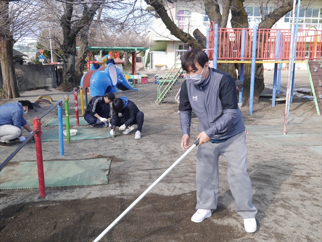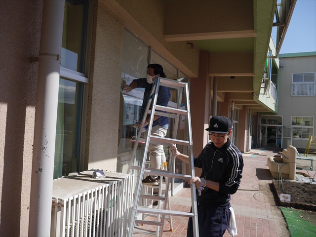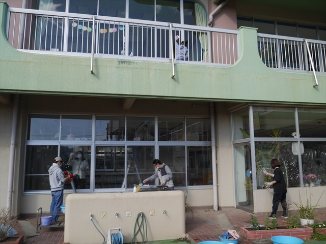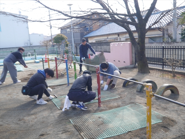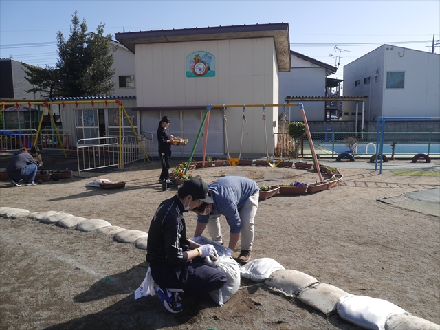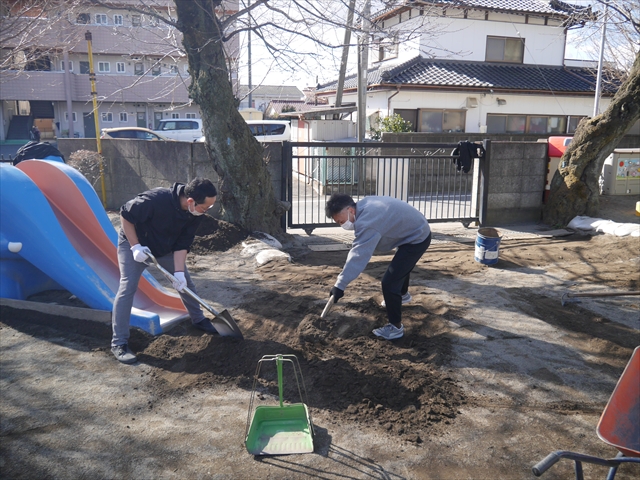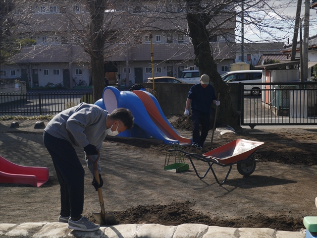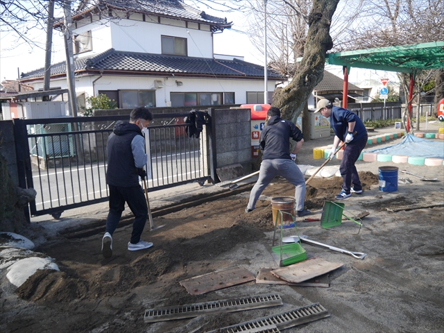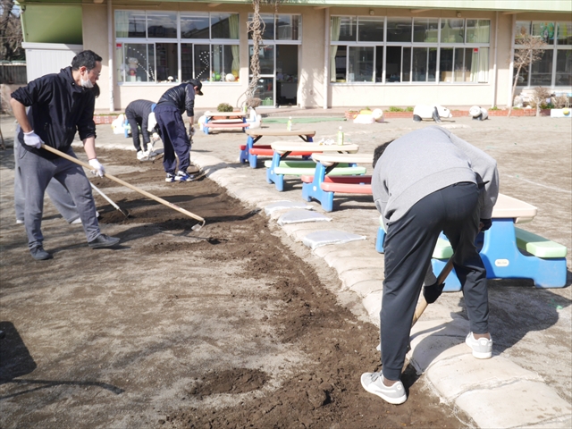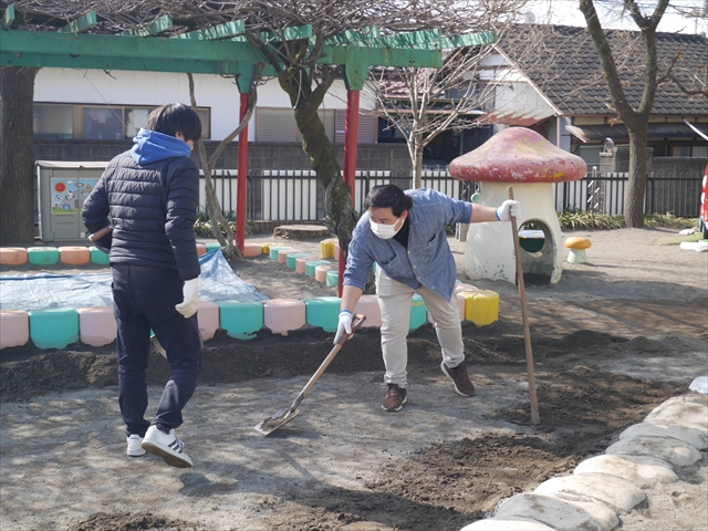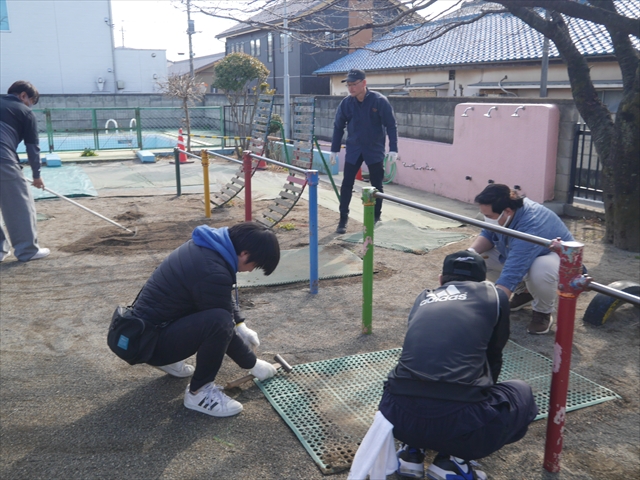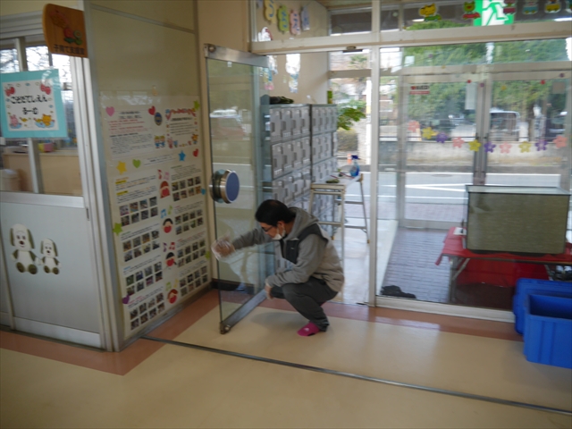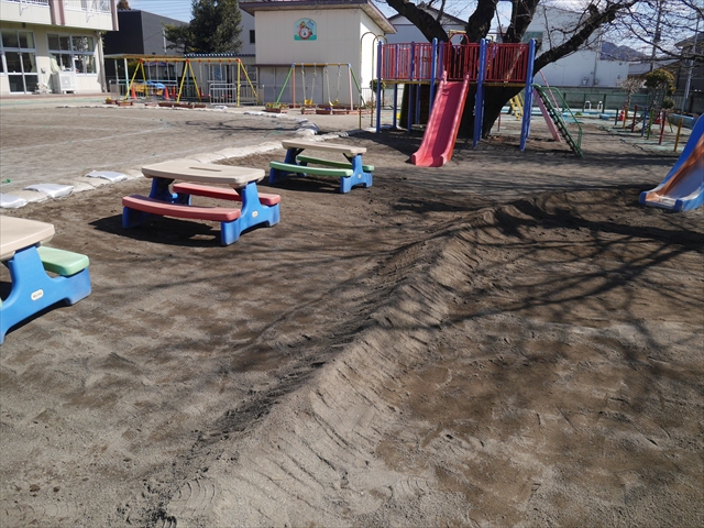 昨日職員で1階3教室のフロア清掃・ワックス塗りをしましたので、各教室内への物品移動から始まり、各教室の窓拭き、各教室清掃、各トイレ清掃などなど園舎内の様々な箇所を綺麗にしていただきました。そして園庭では、ぼろぼろになった土嚢の交換していただいたり、南門側溝泥だしや土砂が流れるのを防止する堤防を築いていただいたり、鉄棒やのぼり棒のマットの整地をしていただいたり、たくさんの場所を整備していただきました。お陰様で園庭も見違えるようにとっても綺麗になりましたし、園舎内各所の窓やフロアやトイレもとても綺麗になりました。厚く厚く感謝申し上げます!<(_ _)> これで卒園式も新年度も入園式も気持ちよく迎えられます。本当にありがとうございました!m(_ _)m さすがお父さん、お母さん方は、若いですしフットワークもいいですね~!その姿は、美しい!!(^_^)b (*^_^*)