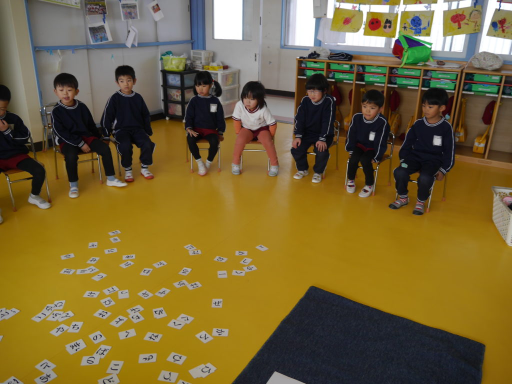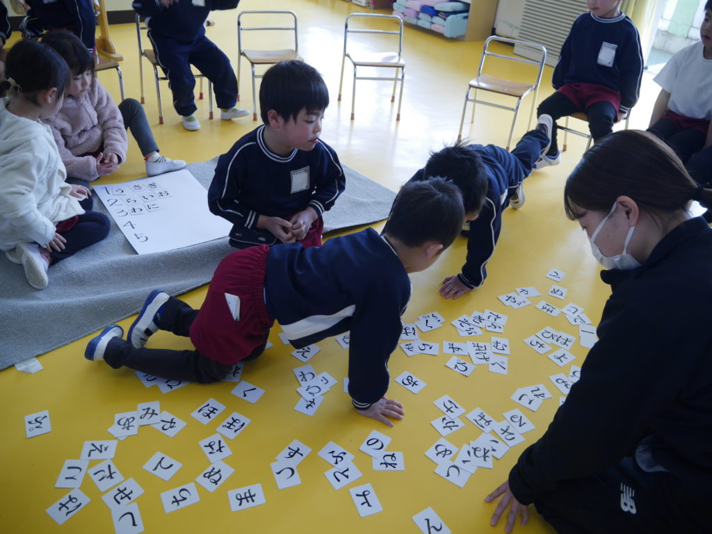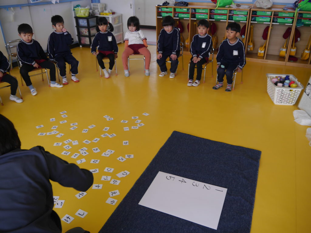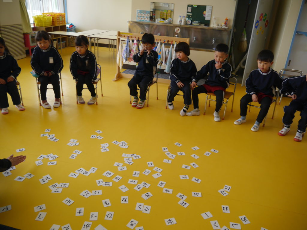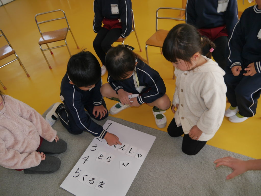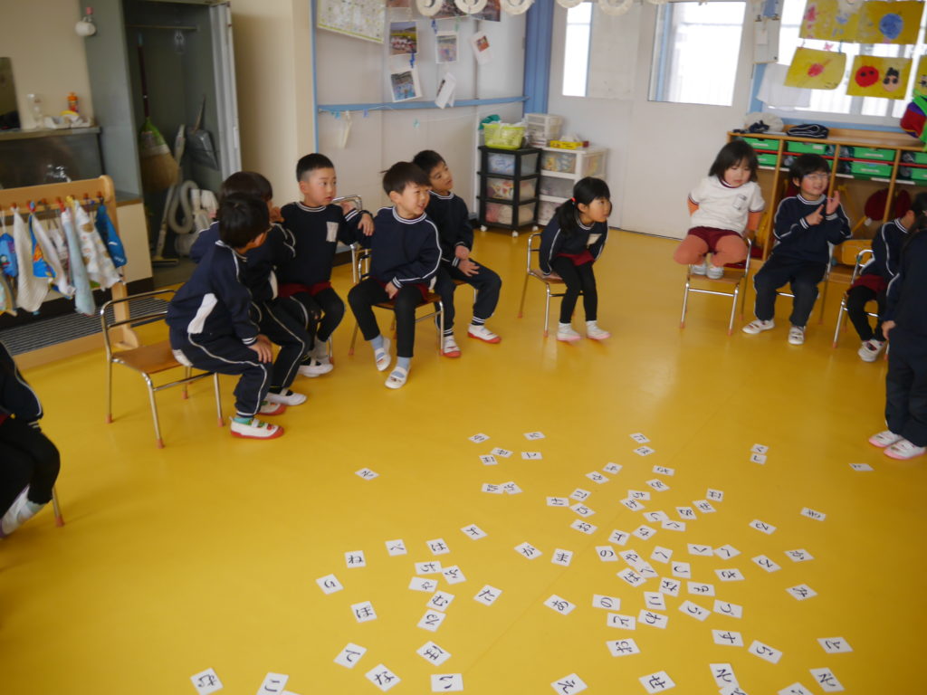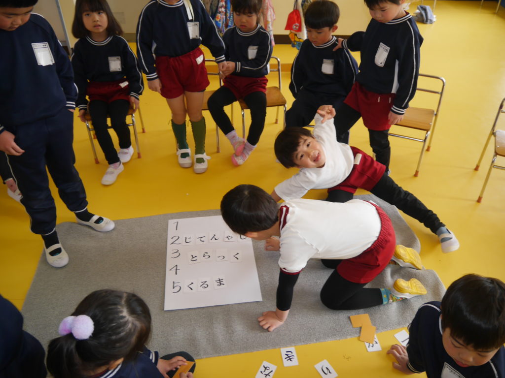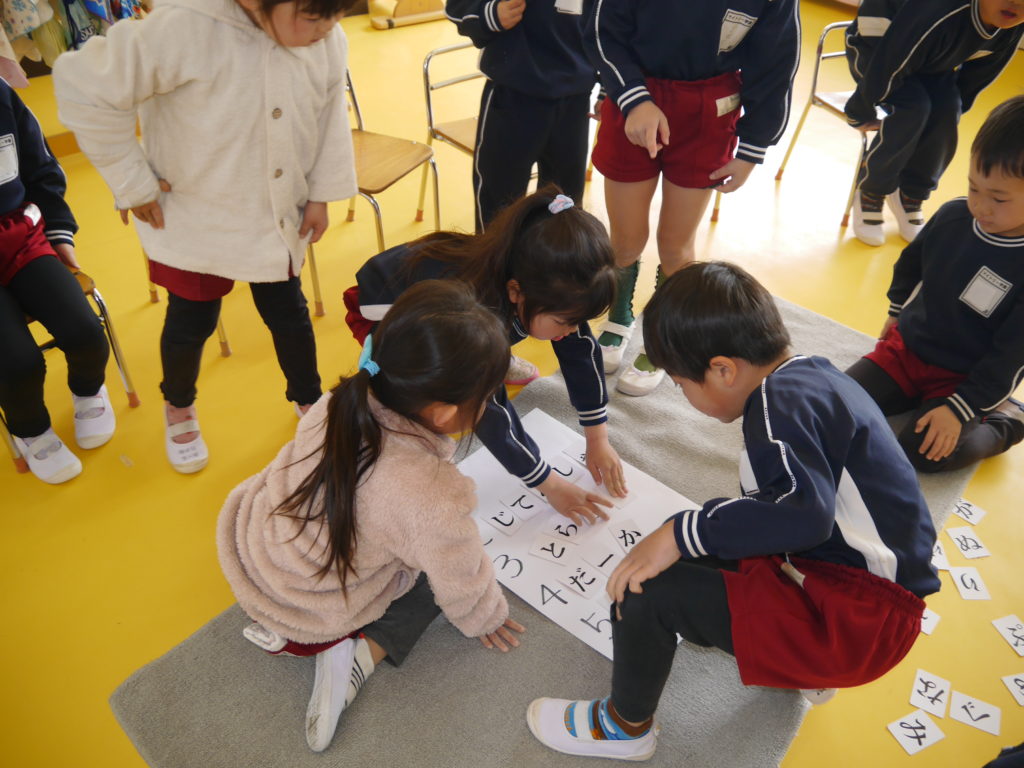 今年度から、新たに月に1回「主体性の時間」(主体的学び・遊びの時間〈室内・戸外〉)のカリキュラムを取り入れました。これは、園児の主体性を重視し、学年・担任が意図したねらい・環境構成の中、子どもたちがやりたい「学び」「遊び」を好きにやる時間です。子どもたちが能動的にその活動を通して学んでいき、自ら考え、【見通し】(何をするのか?何をして遊ぶのか?何を作るのか?)を立て、自ら活動していく力を養っていきたいと思います。今回は、「あいうえお」のカードを使い、お題ででた物の言葉を探すゲームをしました。お題では、動物や色、乗り物など子どもたちがたくさん考えてくれました。濁点の付いた言葉も使い、チームのお友だちと協力し合い考え、言葉を作ることができました!