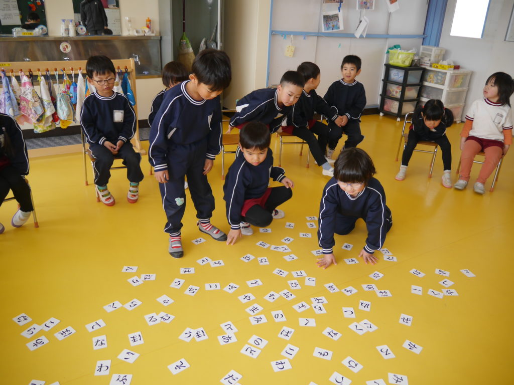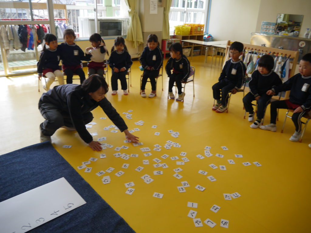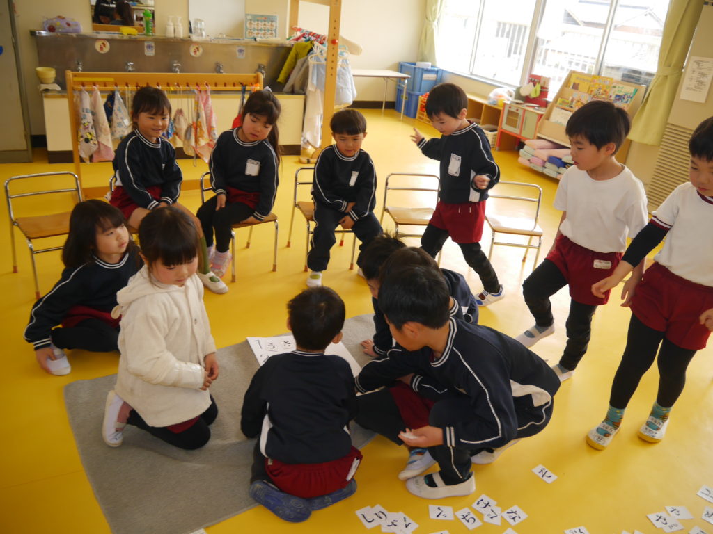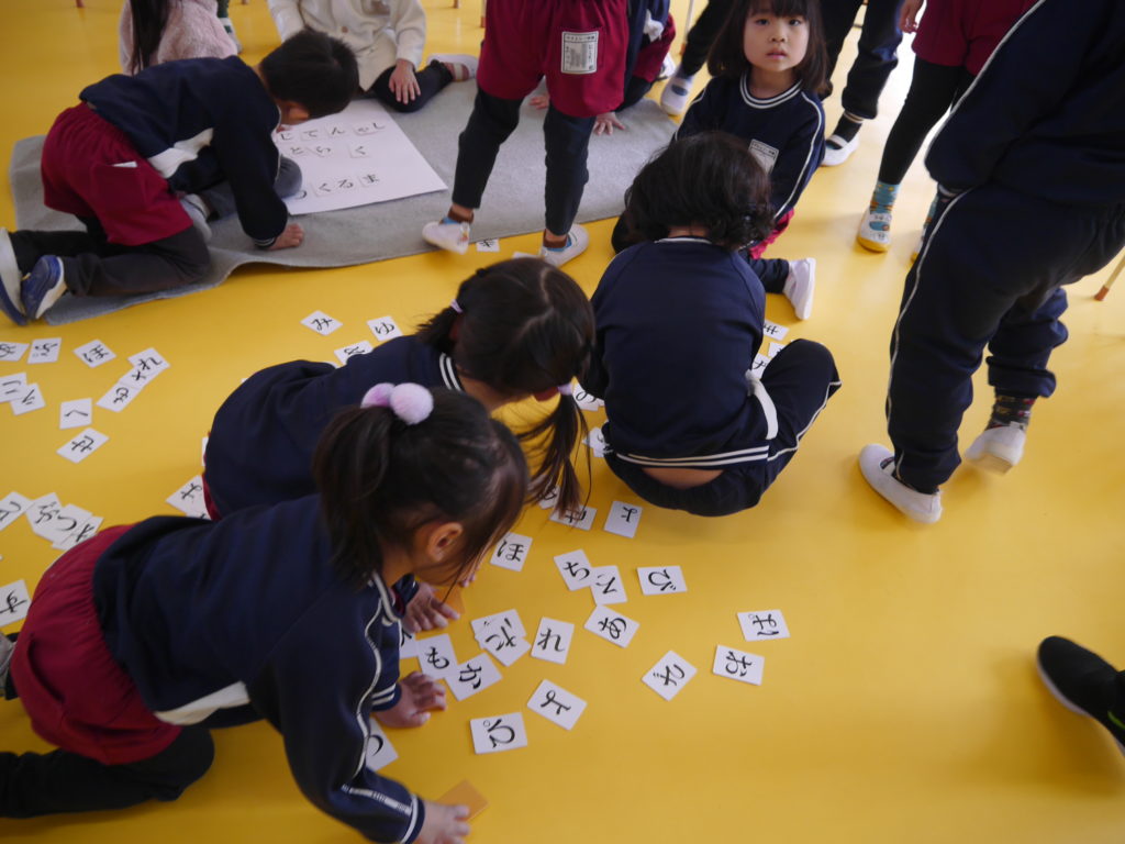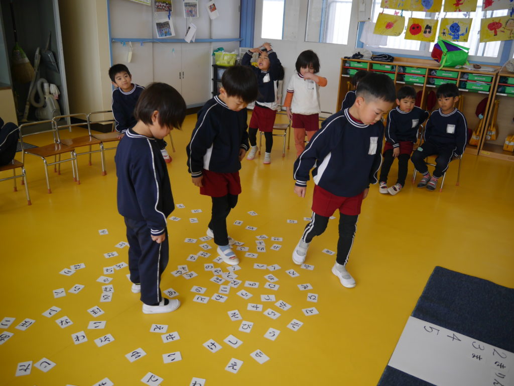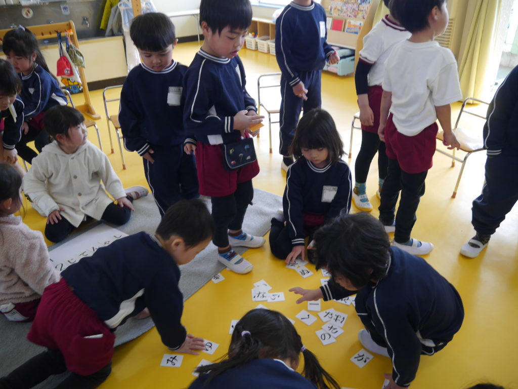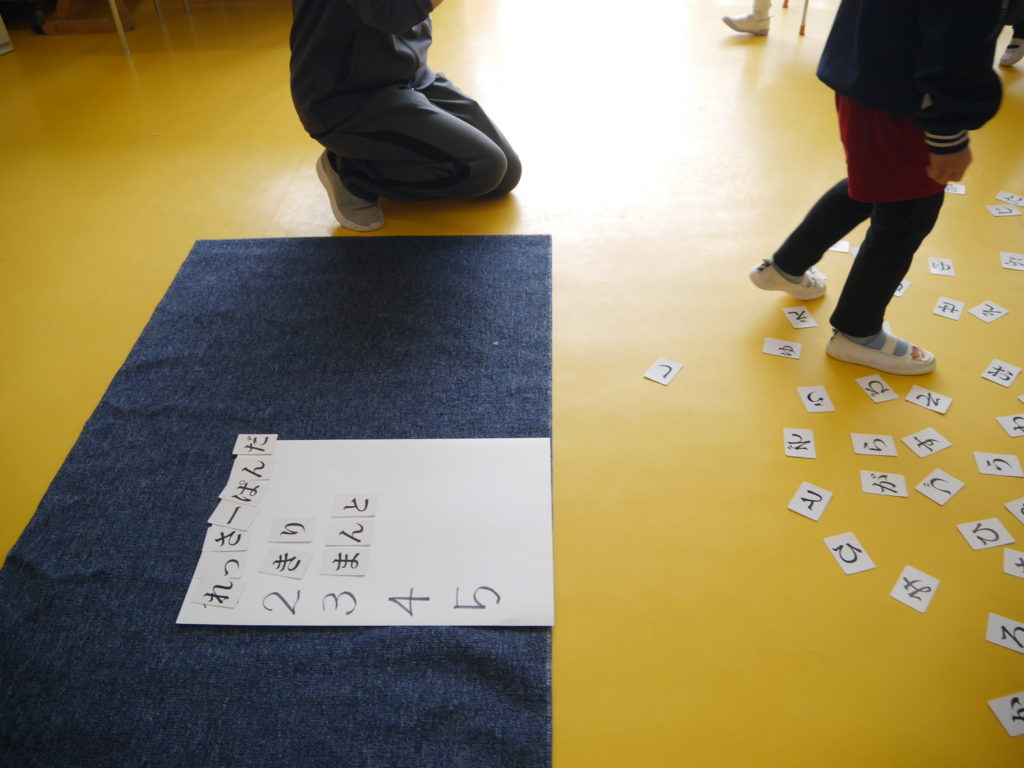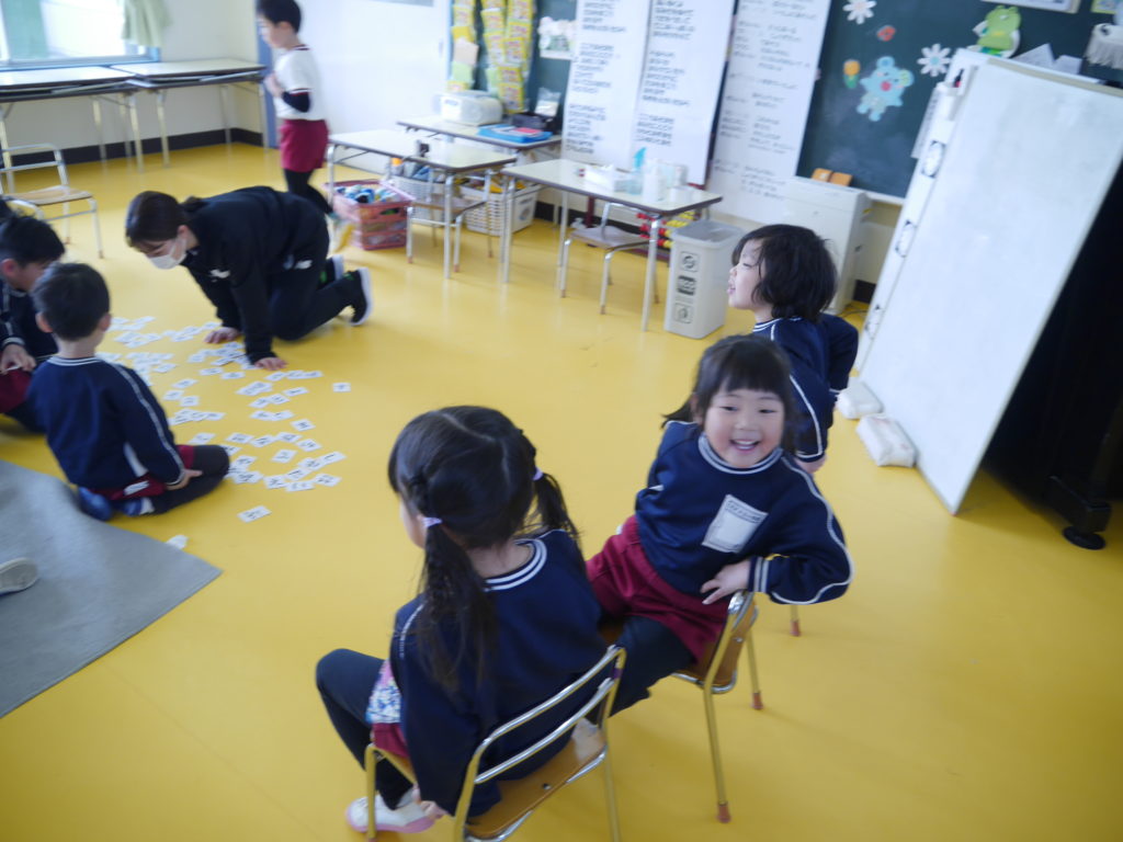 今年度から、新たに月に1回「主体性の時間」(主体的学び・遊びの時間〈室内・戸外〉)のカリキュラムを取り入れました。これは、園児の主体性を重視し、学年・担任が意図したねらい・環境構成の中、子どもたちがやりたい「学び」「遊び」を好きにやる時間です。子どもたちが能動的にその活動を通して学んでいき、自ら考え、【見通し】(何をするのか?何をして遊ぶのか?何を作るのか?)を立て、自ら活動していく力を養っていきたいと思います。今回は、「あいうえお」のカードを使い、お題ででた物の言葉を探すゲームをしました。お題では、動物や色、乗り物など子どもたちがたくさん考えてくれました。濁点の付いた言葉も使い、チームのお友だちと協力し合い考え、言葉を作ることができました!