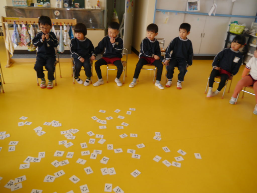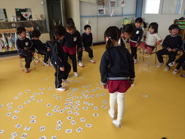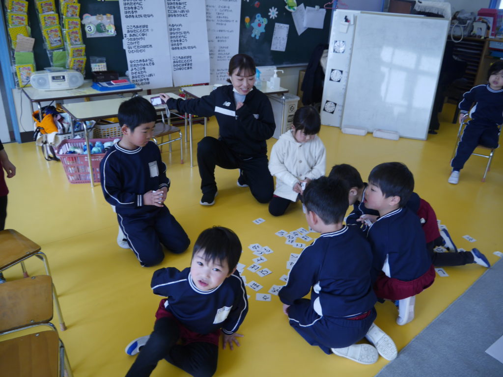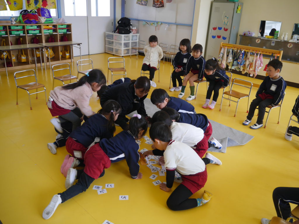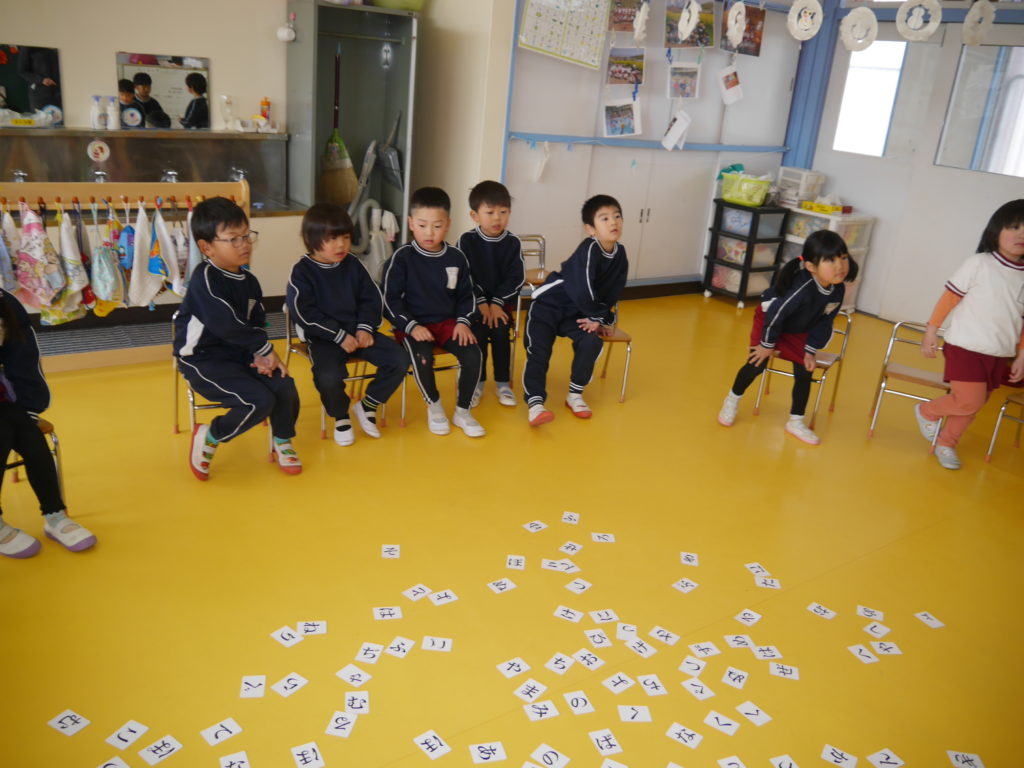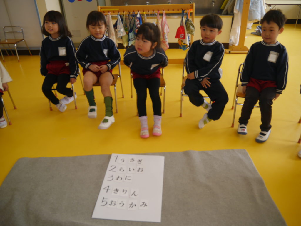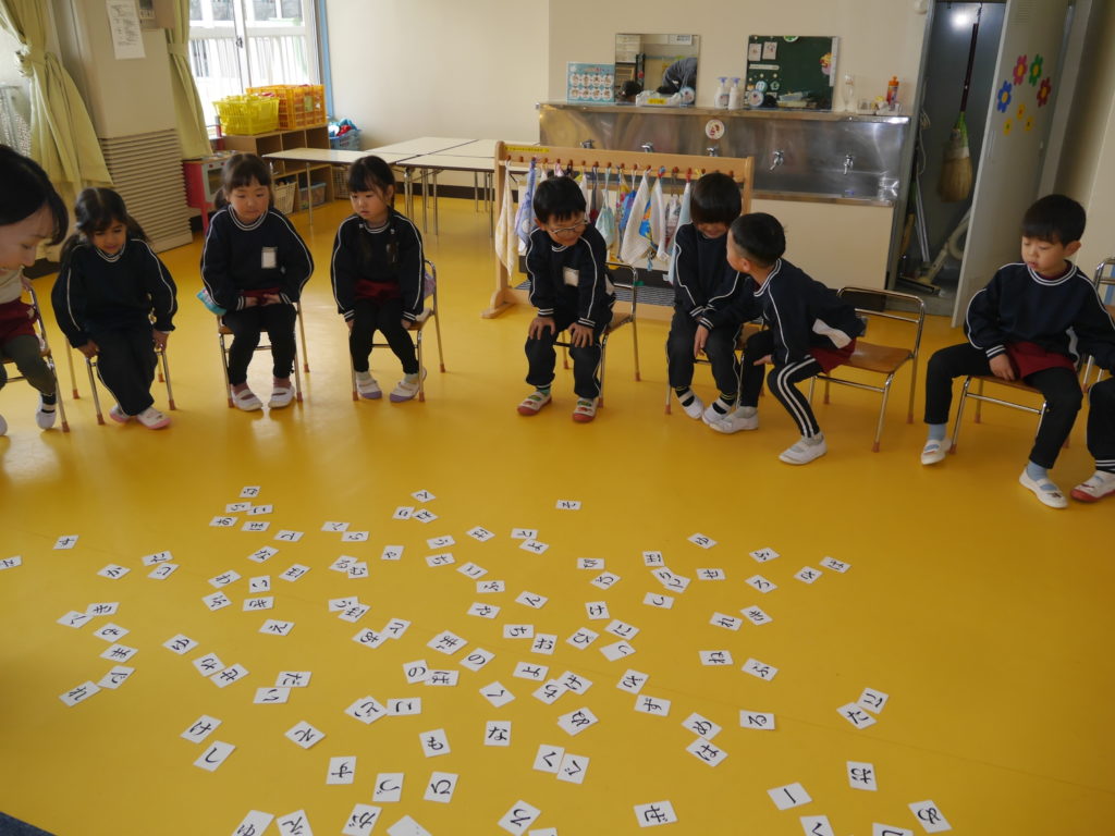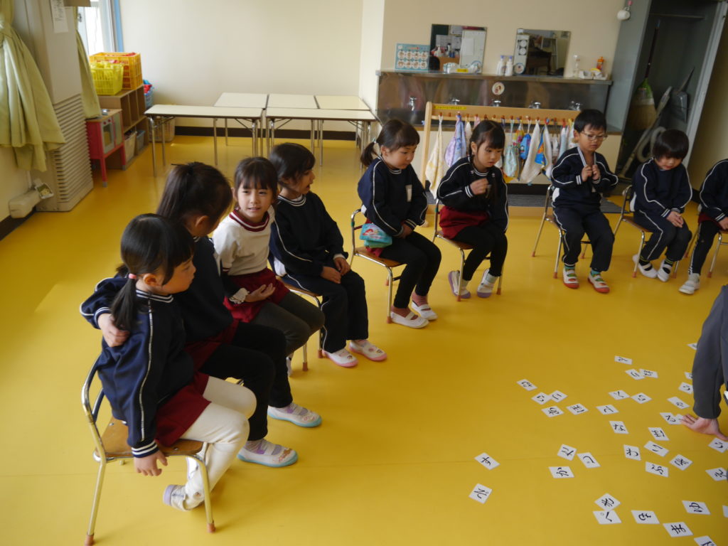 今年度から、新たに月に1回「主体性の時間」(主体的学び・遊びの時間〈室内・戸外〉)のカリキュラムを取り入れました。これは、園児の主体性を重視し、学年・担任が意図したねらい・環境構成の中、子どもたちがやりたい「学び」「遊び」を好きにやる時間です。子どもたちが能動的にその活動を通して学んでいき、自ら考え、【見通し】(何をするのか?何をして遊ぶのか?何を作るのか?)を立て、自ら活動していく力を養っていきたいと思います。今回は、「あいうえお」のカードを使い、お題ででた物の言葉を探すゲームをしました。お題では、動物や色、乗り物など子どもたちがたくさん考えてくれました。濁点の付いた言葉も使い、チームのお友だちと協力し合い考え、言葉を作ることができました!