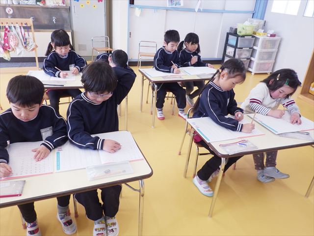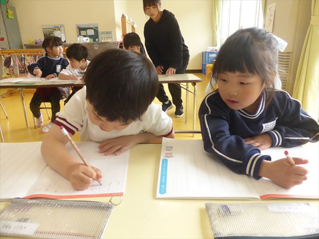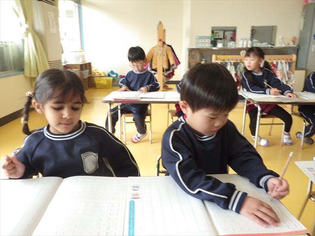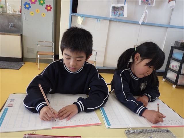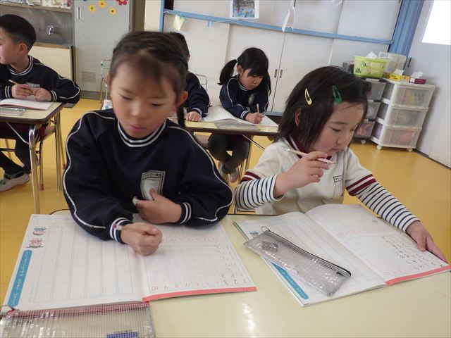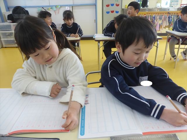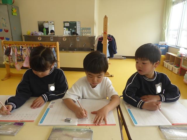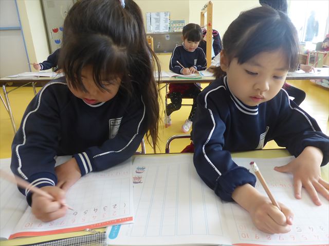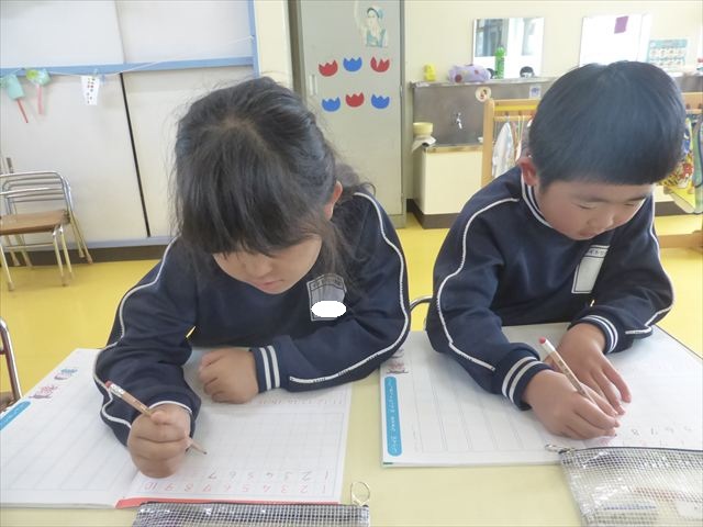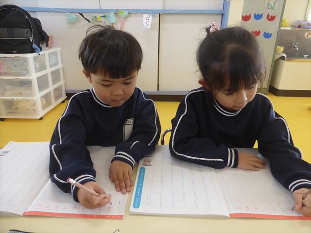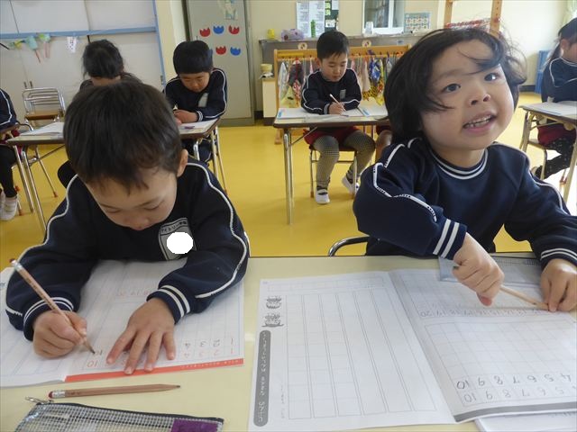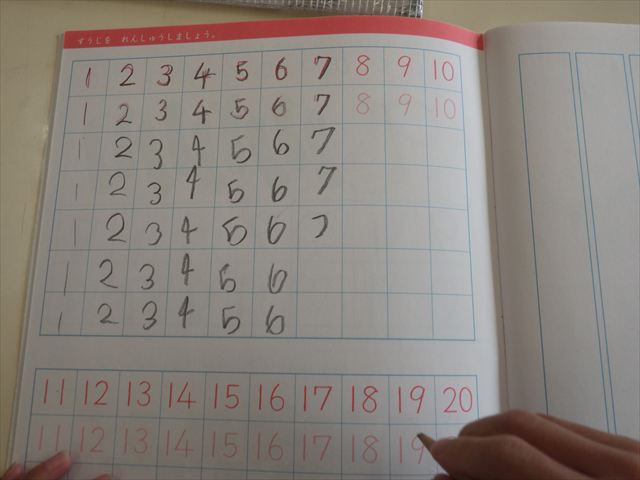 今日は算数の時間としてあいうえおのワークにある1~20までの数字を書きました。数字は一応書き順を伝えて正しく書けるように意識付けをしていきました。たくさんの数字を書いて疲れたようですがみんな頑張りました!