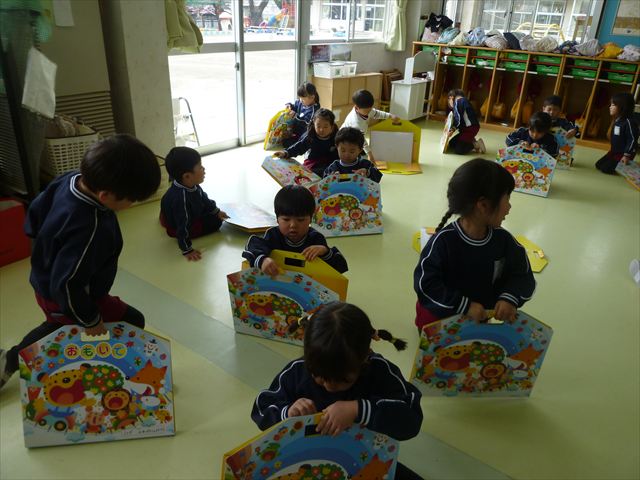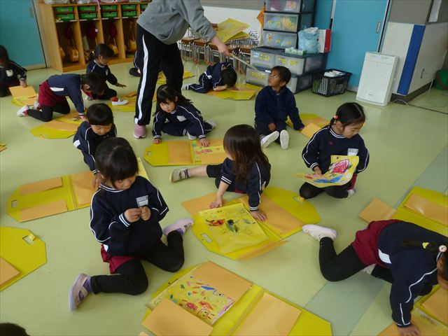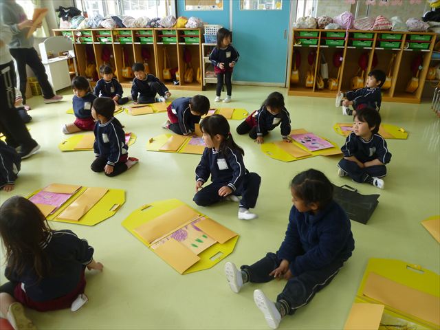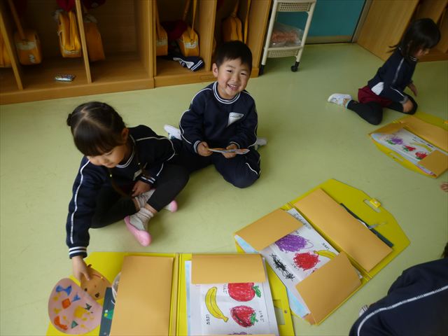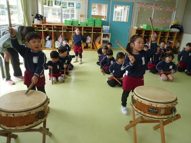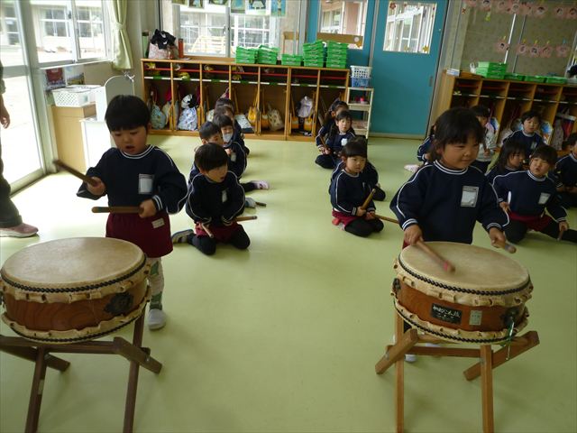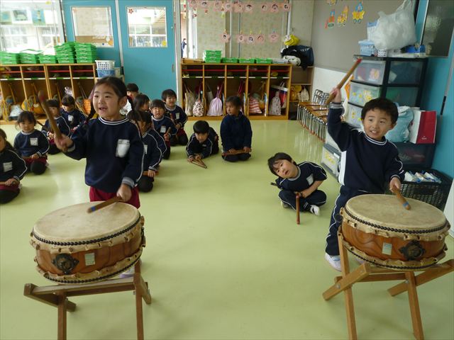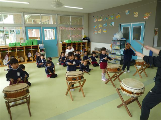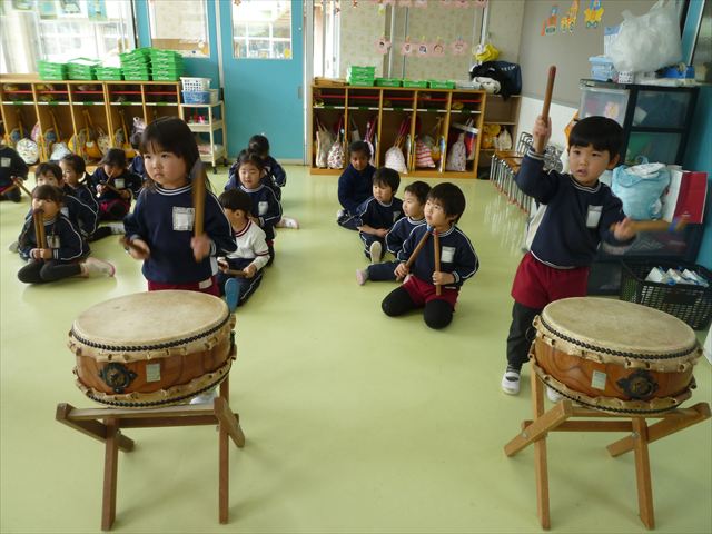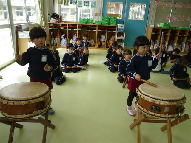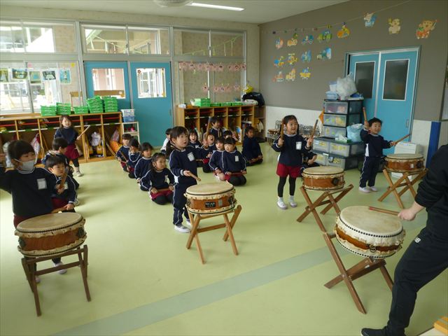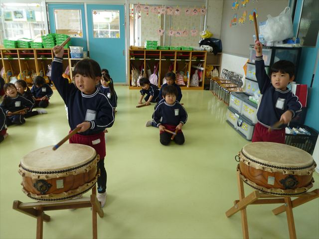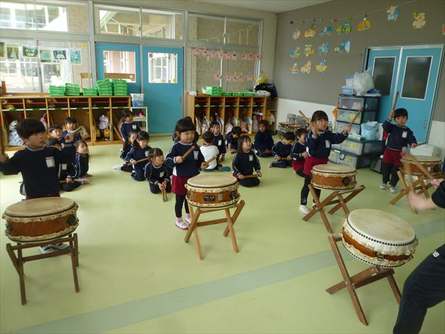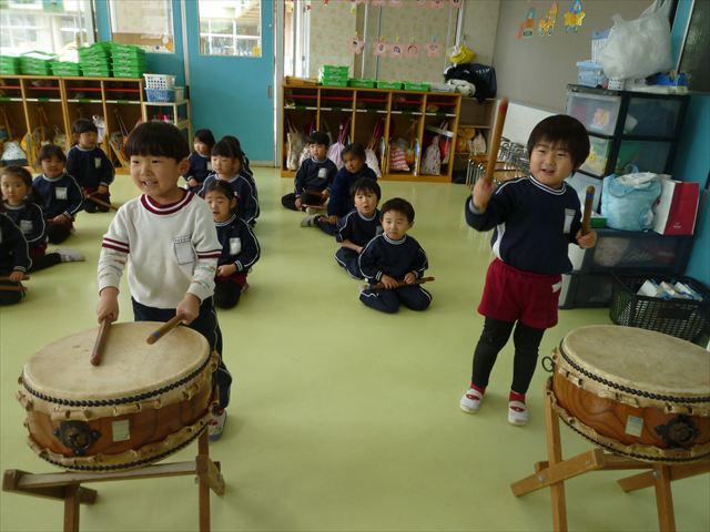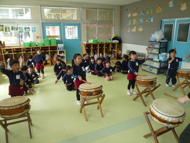 今日は、今まで描いた絵や作った作品をの作品を整理しました(^^♪「あ!運動会の絵だ~」などなど思い出を振り返りながら取り組むことができました。年少さんで初めて描いた絵をみたお友だちは「え~こんなの描いたっけ?」と話す子もいました。本日持ち帰りましたのでお時間のある時に一緒に思い出を振り返っていただけたらいいなと思います(^^♪午後は、太鼓をしました。楽しみながら太鼓に触れる事ができました。年中さんになったら太鼓が本格的に始まりますので頑張ってほしいと思います!