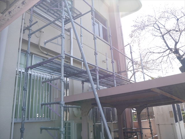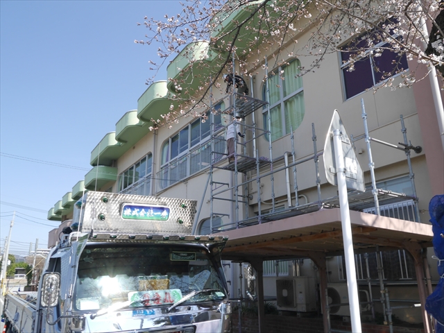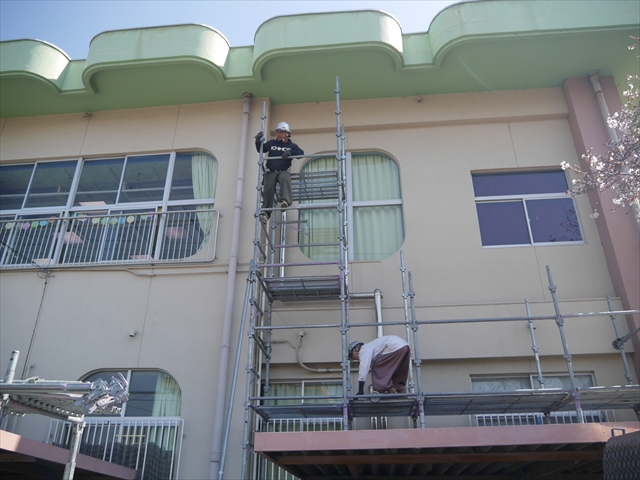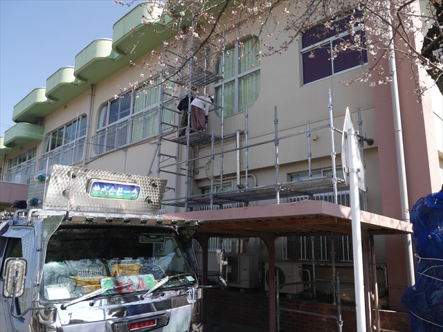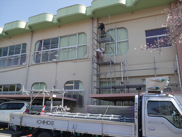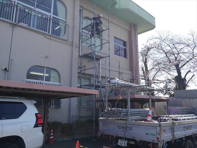 遊戯室のエアコンの冷房機能が故障してしまったので、この春休み中に「遊戯室エアコン取替改修工事」を行います。450万円の一大工事となり、頭の痛いところですが、子どもたちの教育環境整備のためですから・・・(^_^;) 本日、足場設置工事が行われ、26日の修了式後、本格的な工事開始となります。工事中、いろいろとご迷惑をお掛けするかと思いますが、ご理解ご協力をよろしくお願いいたします。m(_ _)m