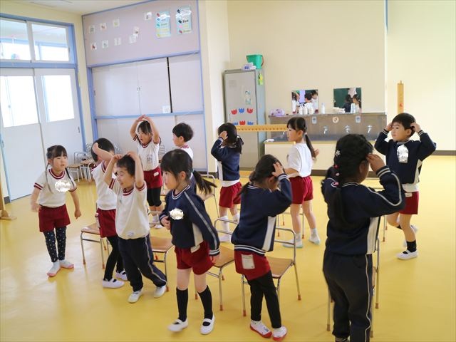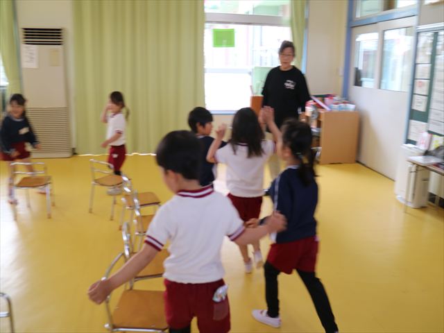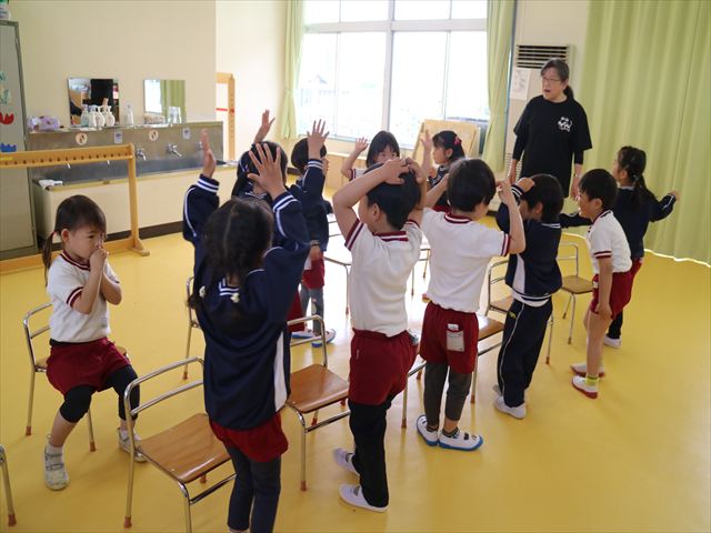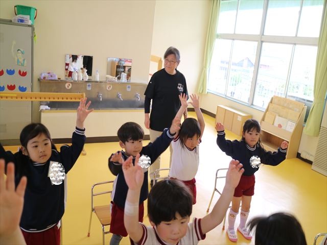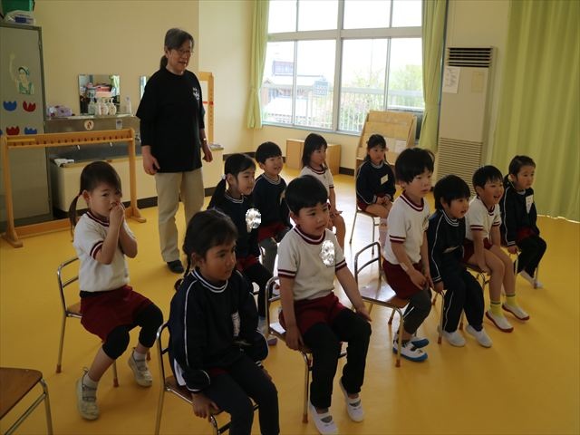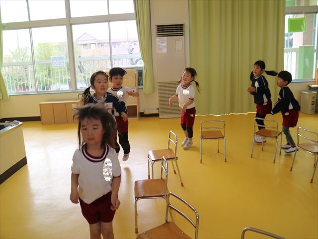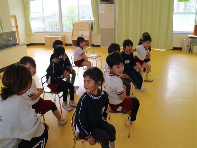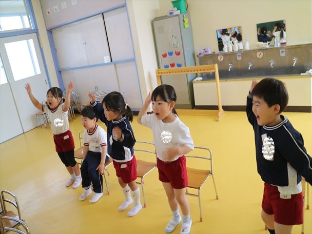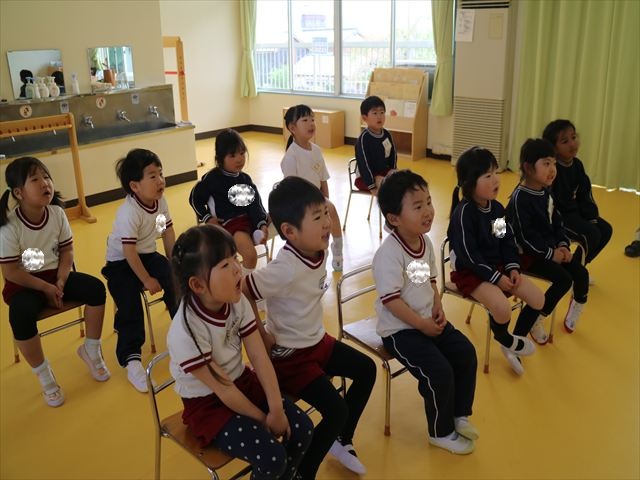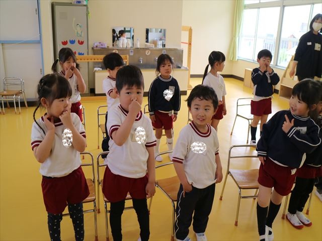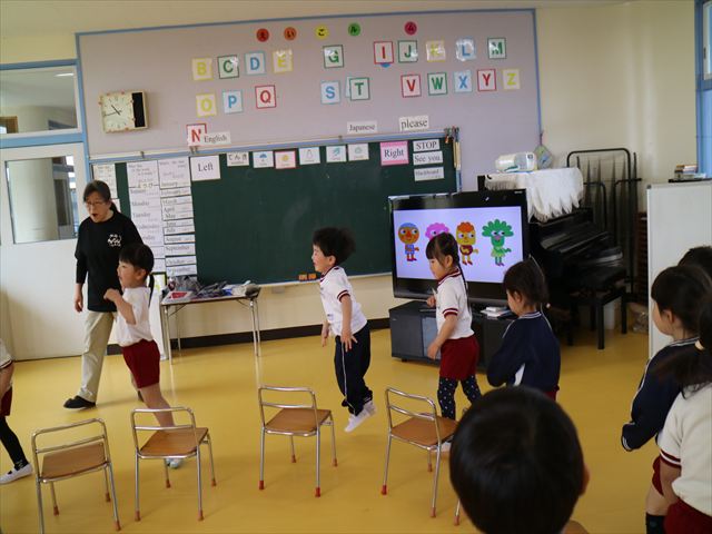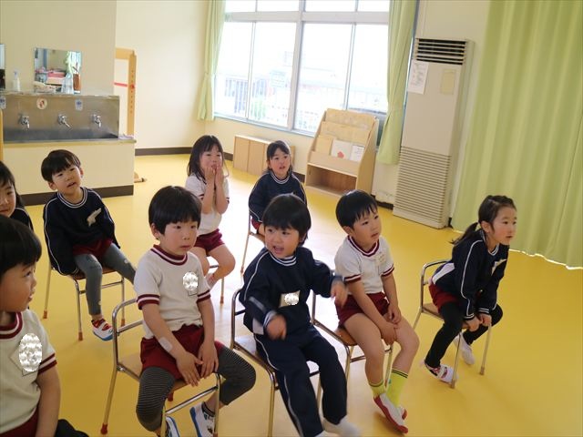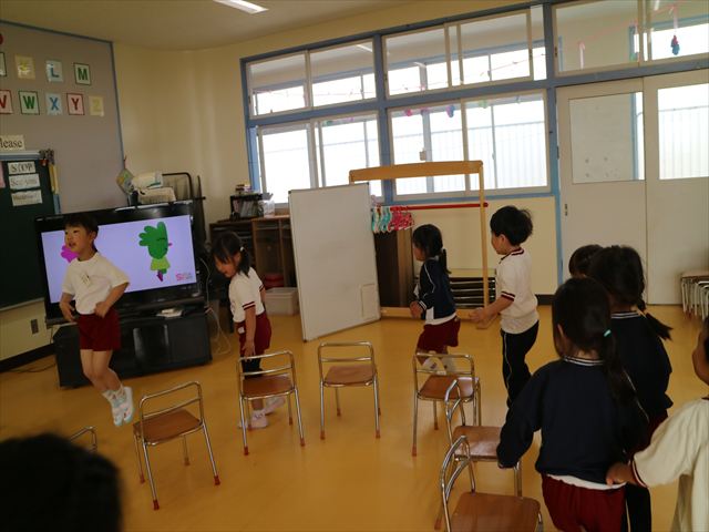 さくら組になって初めてのALT英語教室でした。年少さんでもやった名前の伝え方、天気、色など復習をしました。またUP downの歌や歩いたりスキップをしたりして体を動かしながら楽しく英語を学びました!