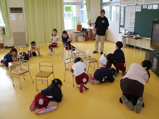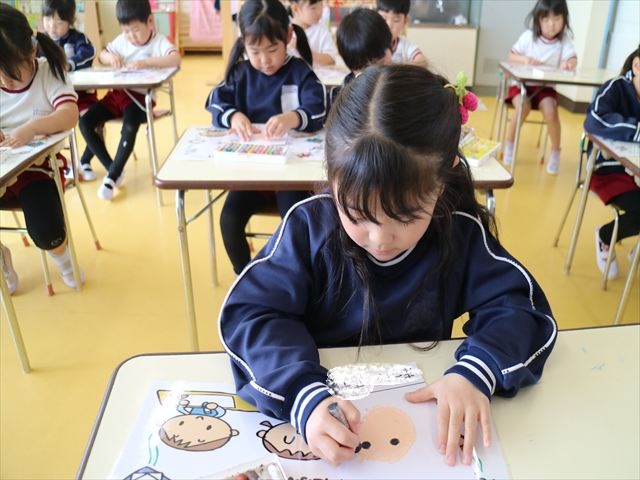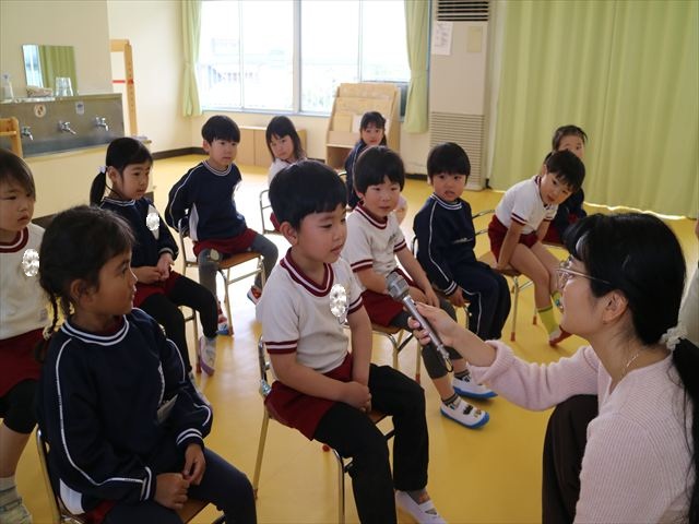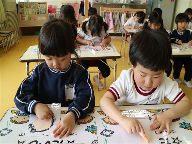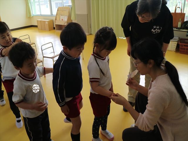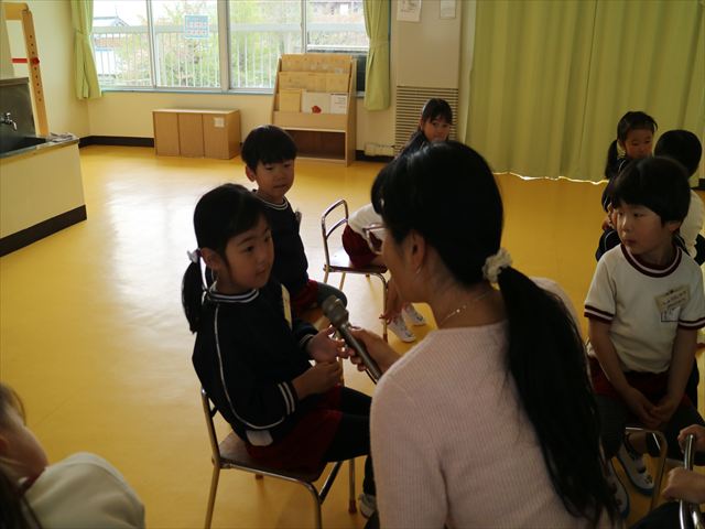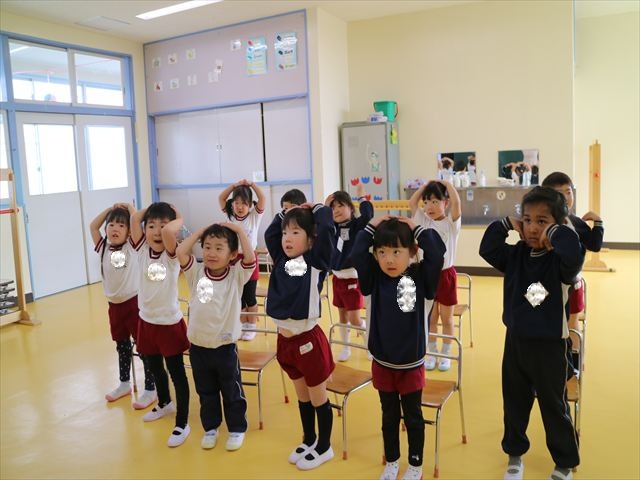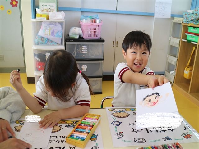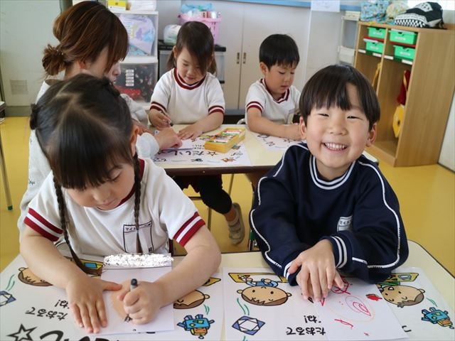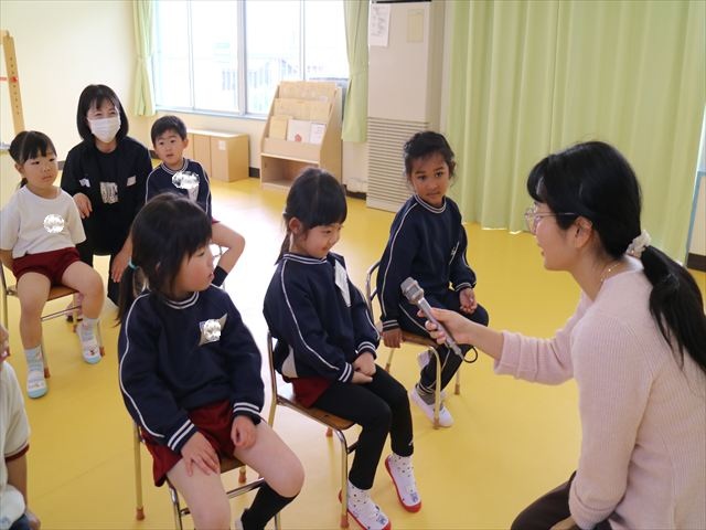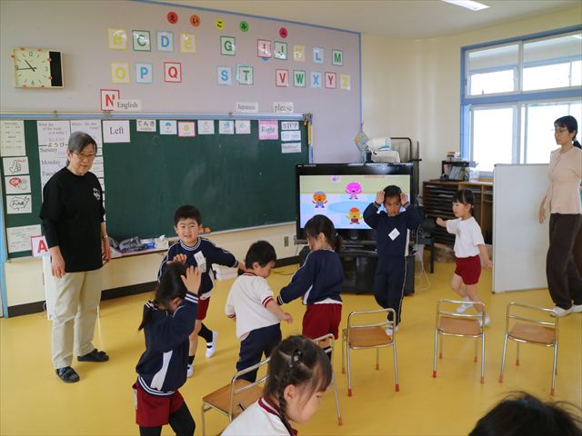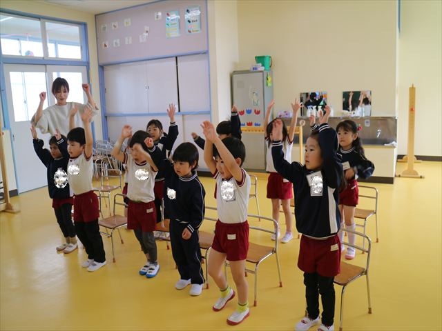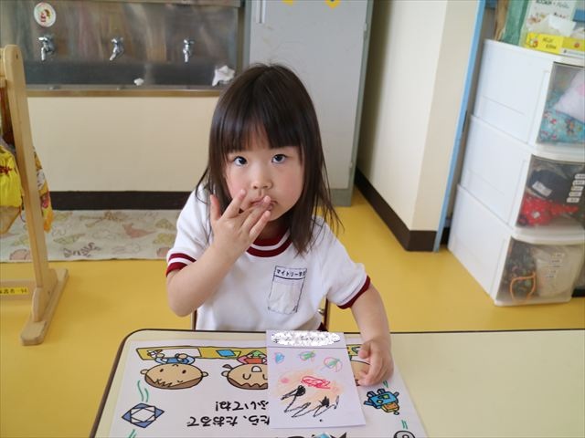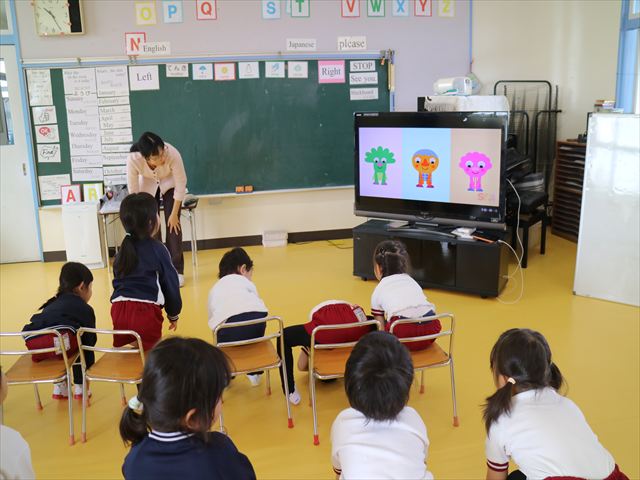 さくら組になって初めてのALT英語教室でした。年少さんでもやった名前の伝え方、天気、色など復習をしました。またUP downの歌や歩いたりスキップをしたりして体を動かしながら楽しく英語を学びました!