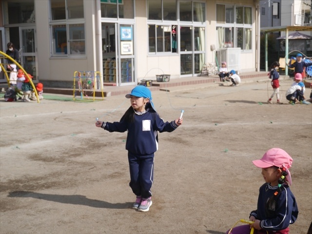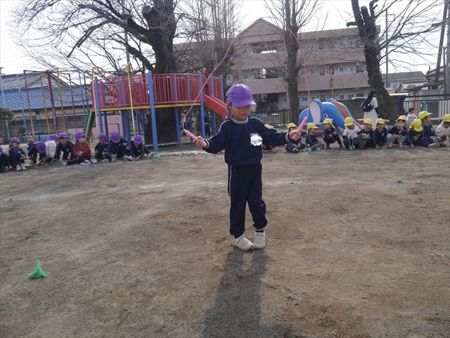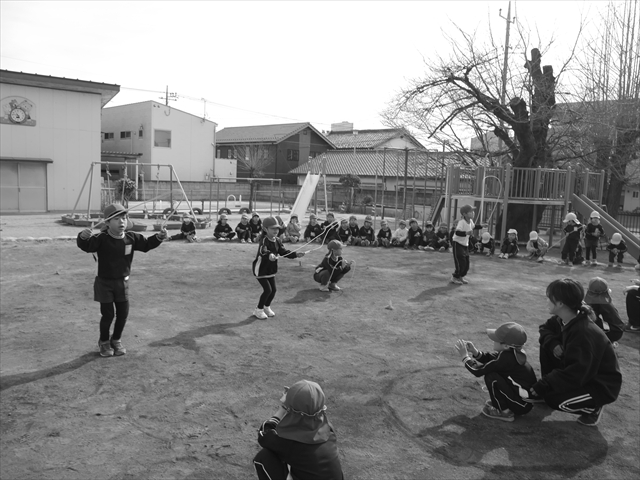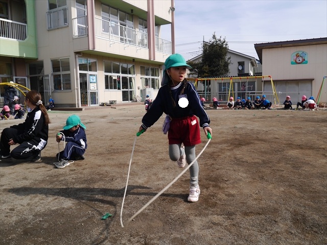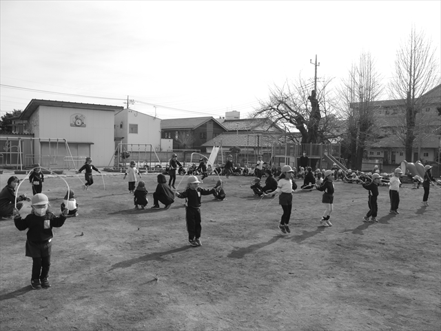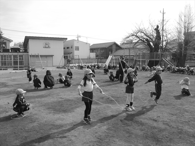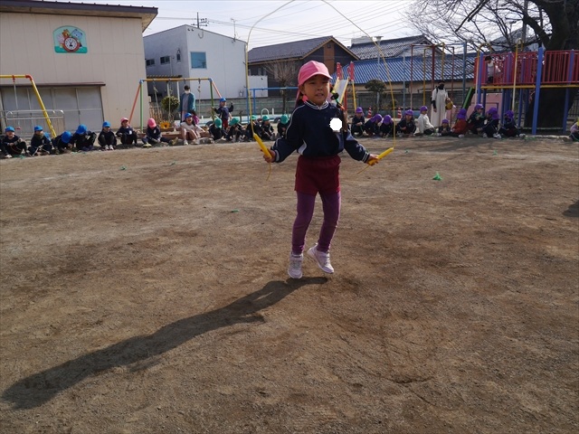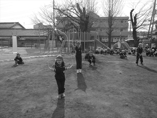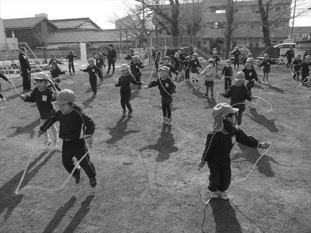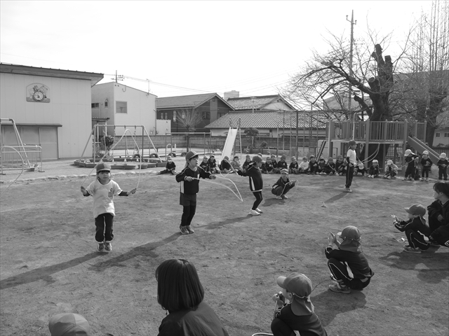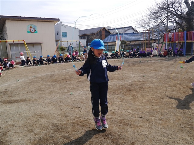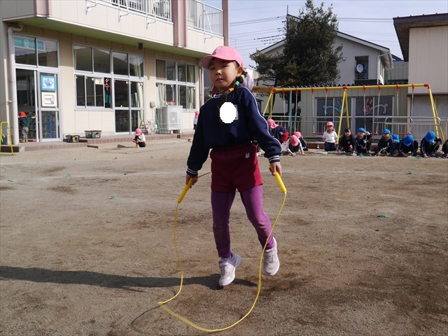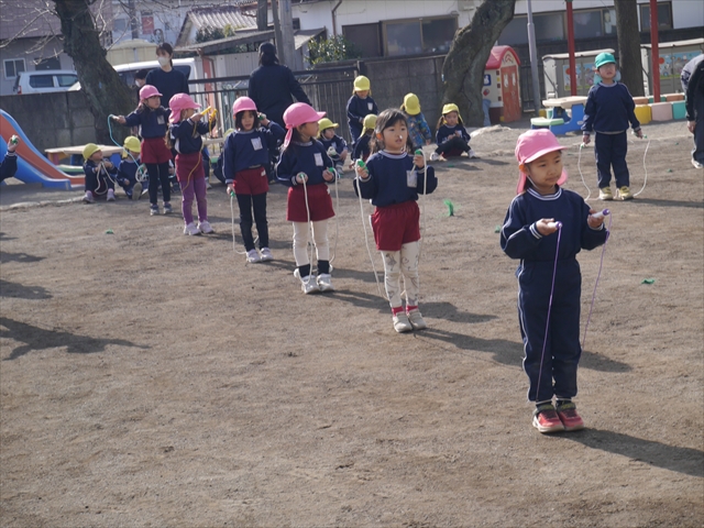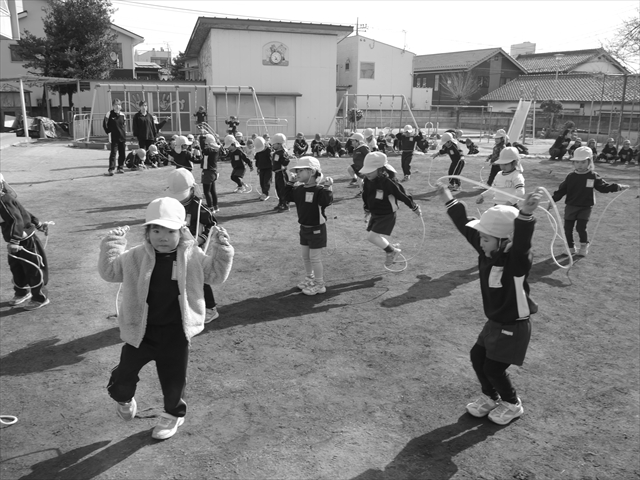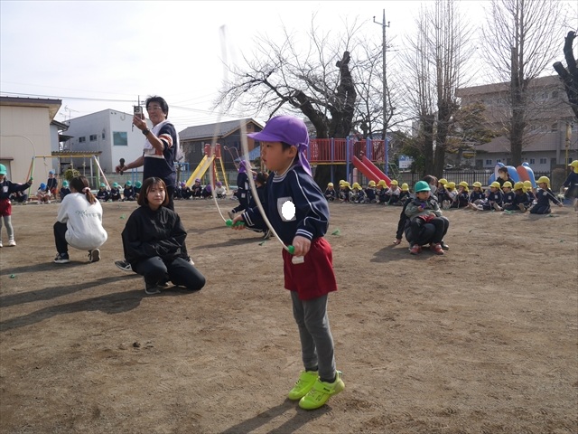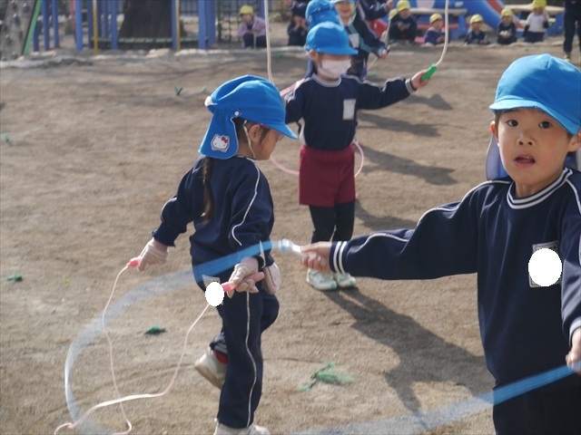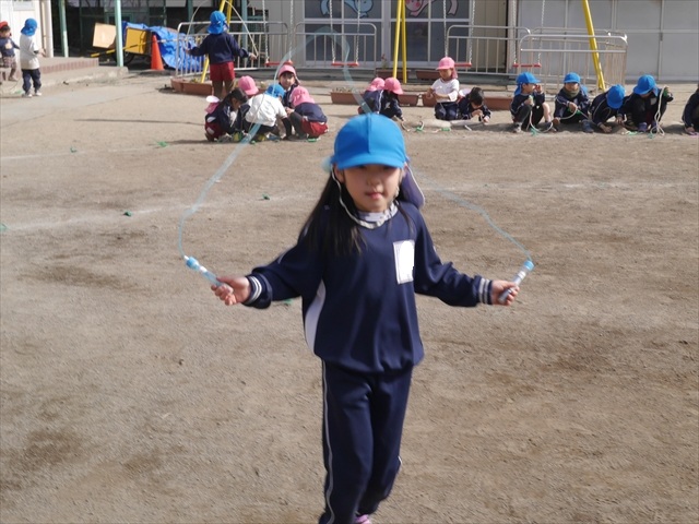 全学年で実施し、最初はたんぽぽ組から年長組までが「なわとび発表会」を行いました。たんぽぽ組は長縄跳び、年少組は前跳び、年中組と年長組は前跳びから後ろ跳び、あや跳び、交差跳び、二重跳びと順にできる子が発表してくれました。みんな着実に上手になり、回数も増え、跳べるようになったり自分の記録を更新した子もいました。えらい!そんな中、年少組では「前回し跳び」を5回連続跳べた「ちかちゃん」がチャンピオンでした。えらい!頑張りました。来年が楽しみです!(^_^)v ヘ(^o^)/