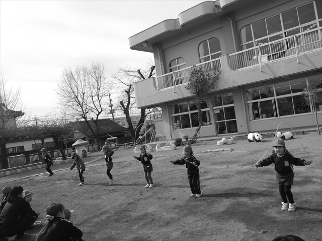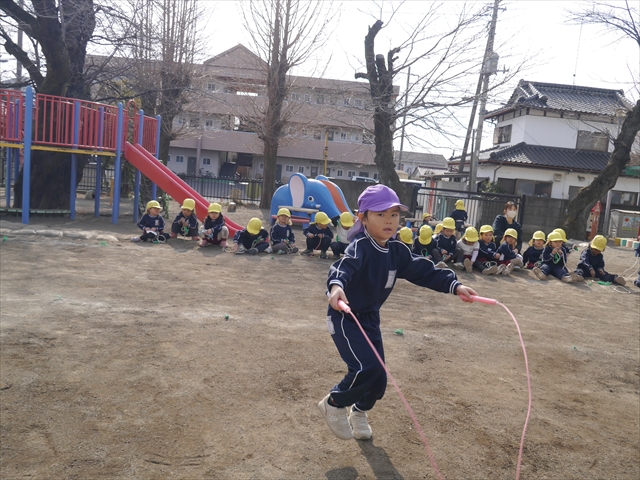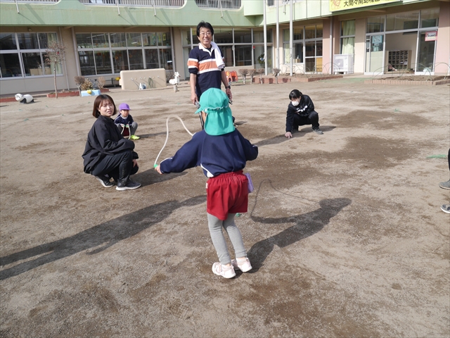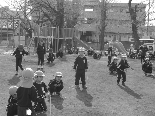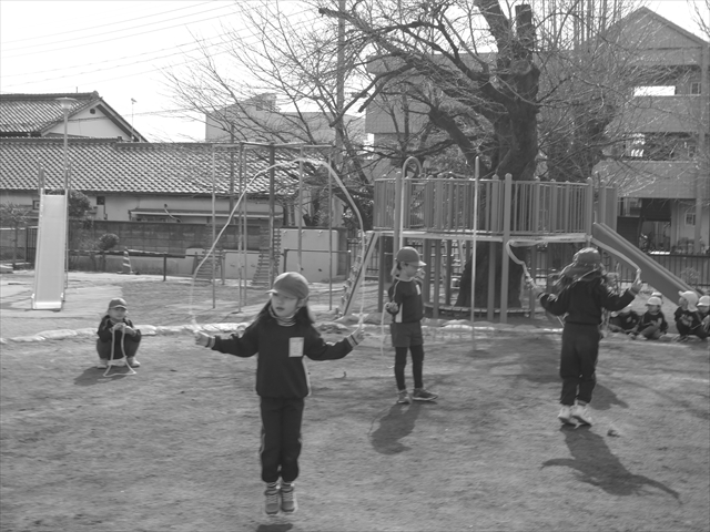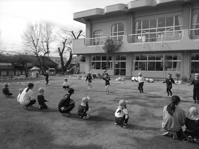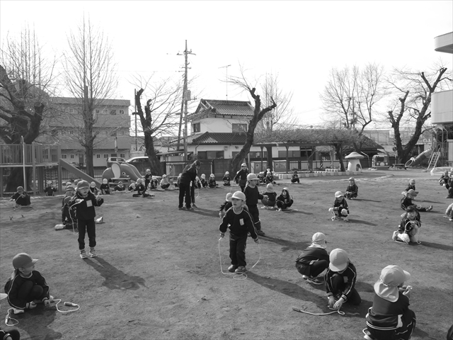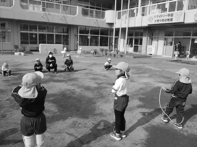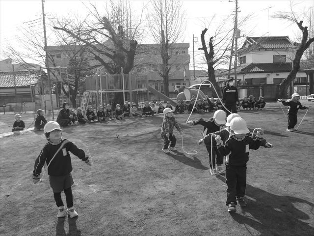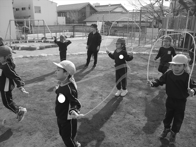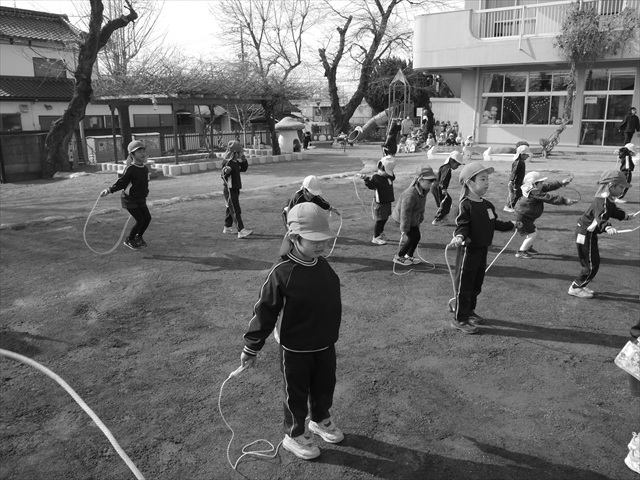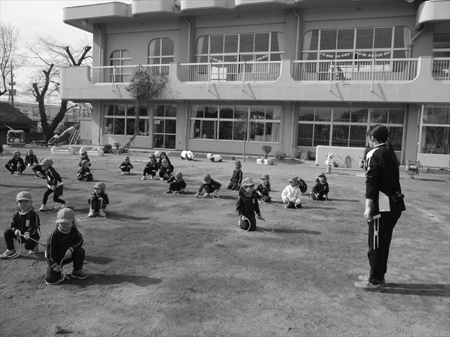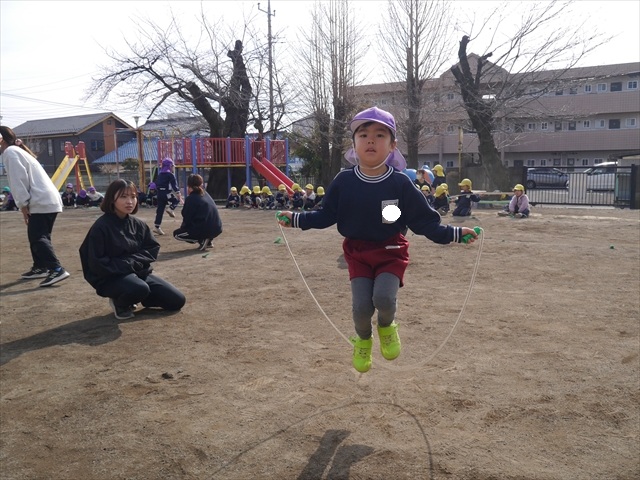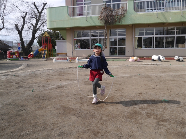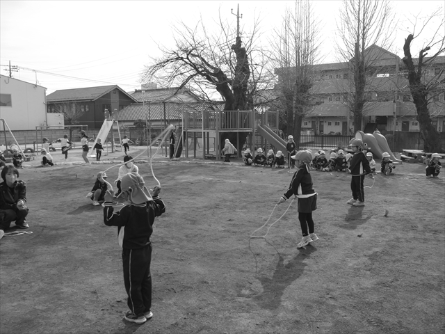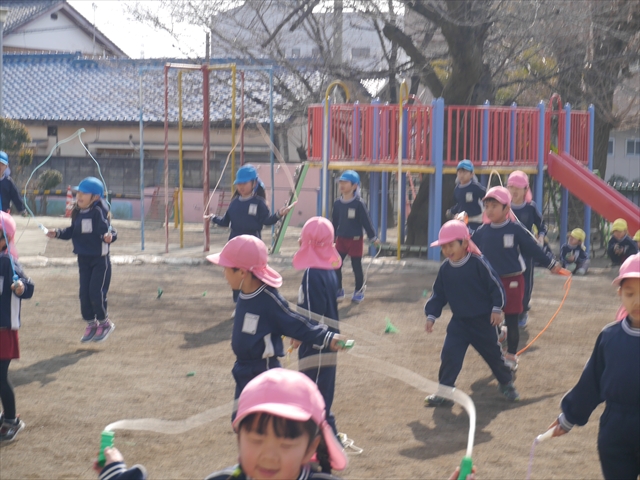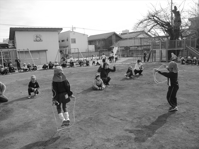 全学年で実施し、最初はたんぽぽ組から年長組までが「なわとび発表会」を行いました。たんぽぽ組は長縄跳び、年少組は前跳び、年中組と年長組は前跳びから後ろ跳び、あや跳び、交差跳び、二重跳びと順にできる子が発表してくれました。みんな着実に上手になり、回数も増え、跳べるようになったり自分の記録を更新した子もいました。えらい!そんな中、年少組では「前回し跳び」を5回連続跳べた「ちかちゃん」がチャンピオンでした。えらい!頑張りました。来年が楽しみです!(^_^)v ヘ(^o^)/