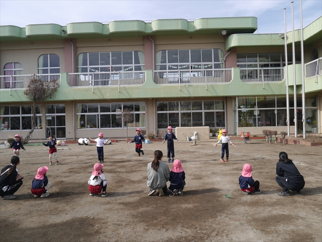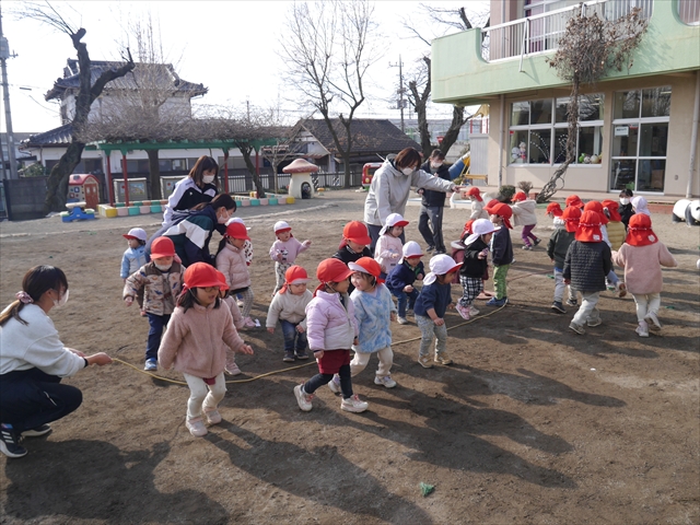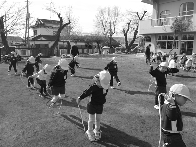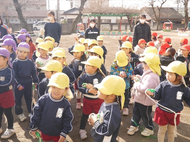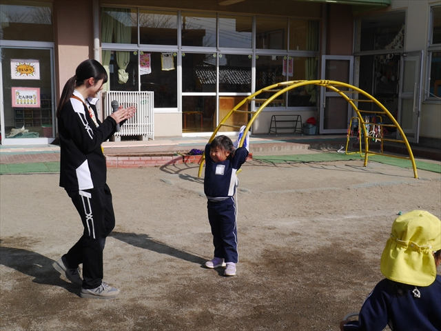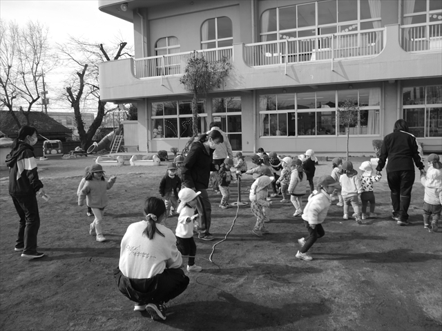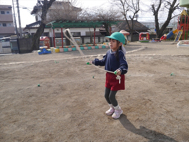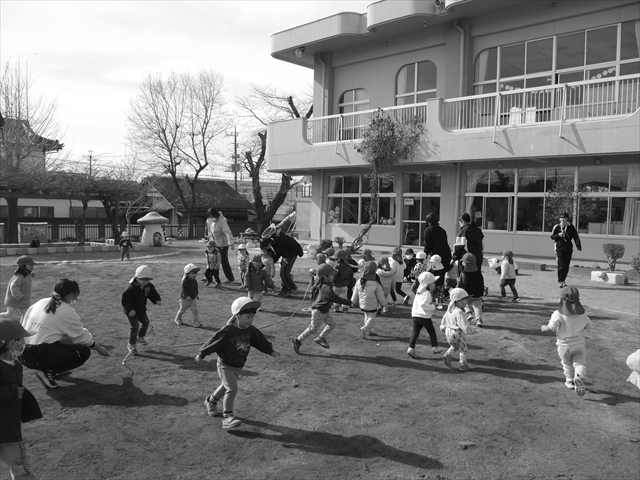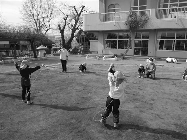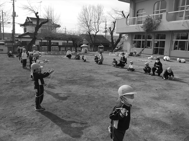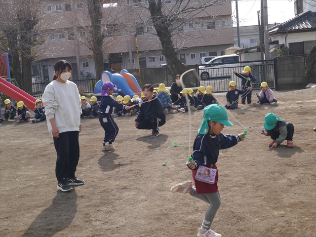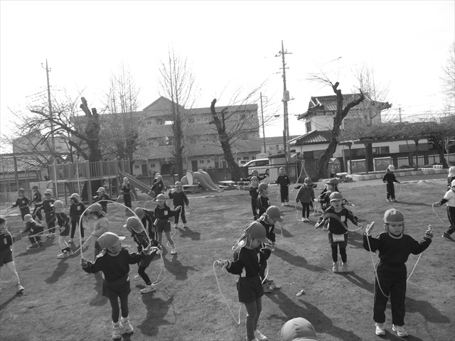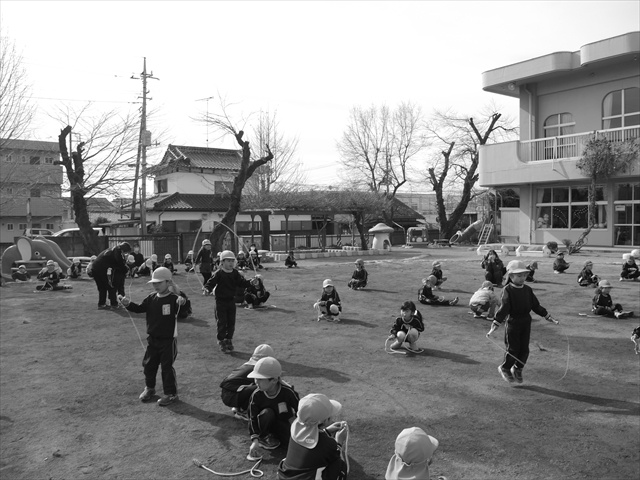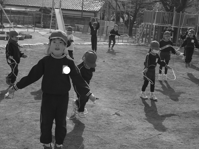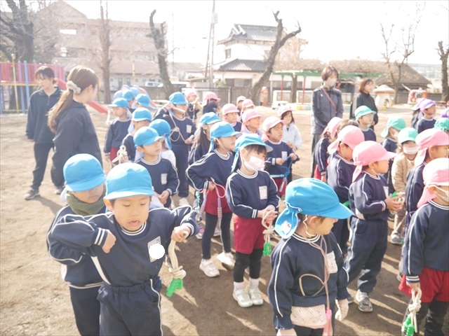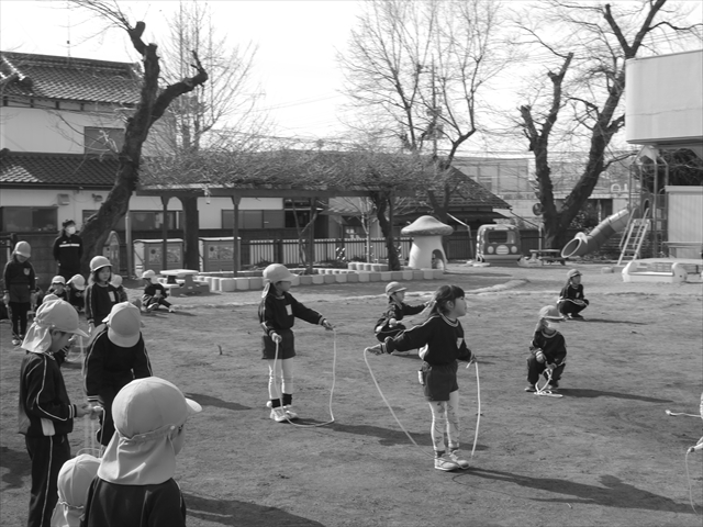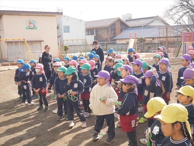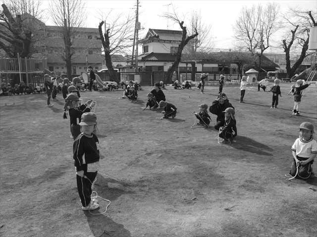 全学年で実施し、最初はたんぽぽ組から年長組までが「なわとび発表会」を行いました。たんぽぽ組は長縄跳び、年少組は前跳び、年中組と年長組は前跳びから後ろ跳び、あや跳び、交差跳び、二重跳びと順にできる子が発表してくれました。みんな着実に上手になり、回数も増え、跳べるようになったり自分の記録を更新した子もいました。えらい!そんな中、年少組では「前回し跳び」を5回連続跳べた「ちかちゃん」がチャンピオンでした。えらい!頑張りました。来年が楽しみです!(^_^)v ヘ(^o^)/