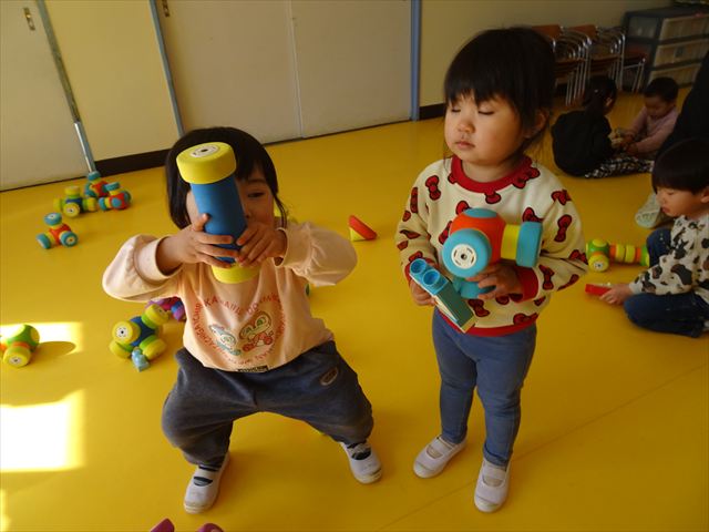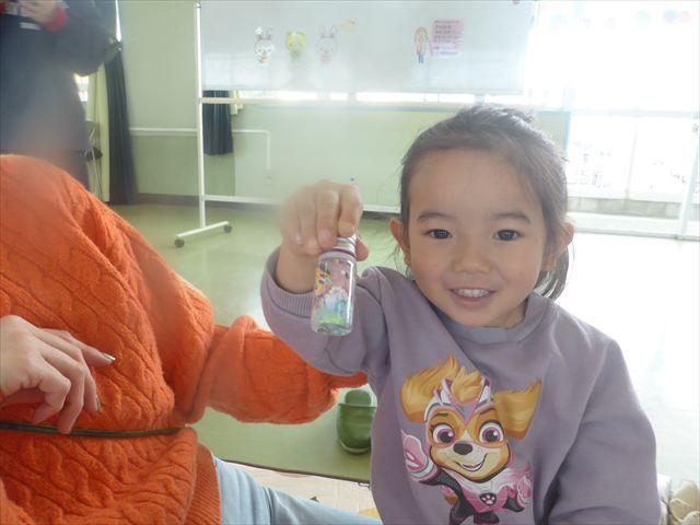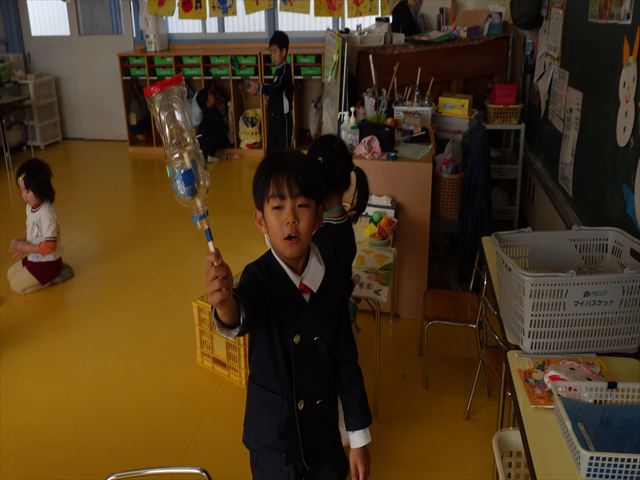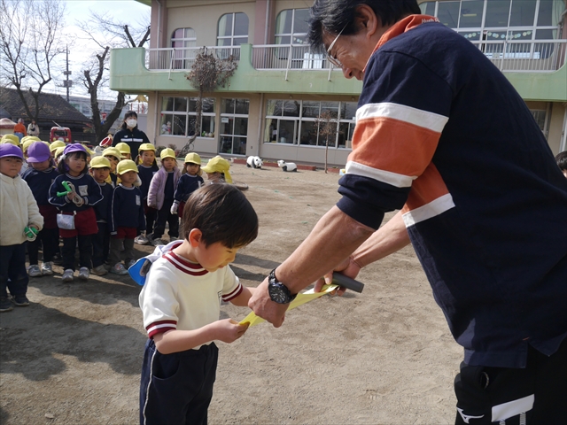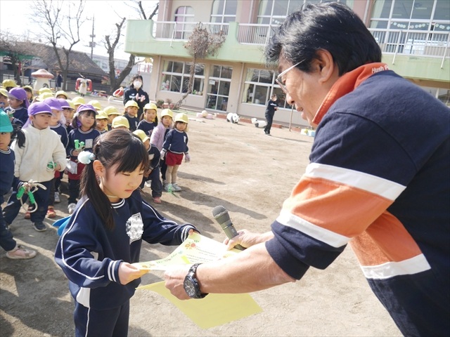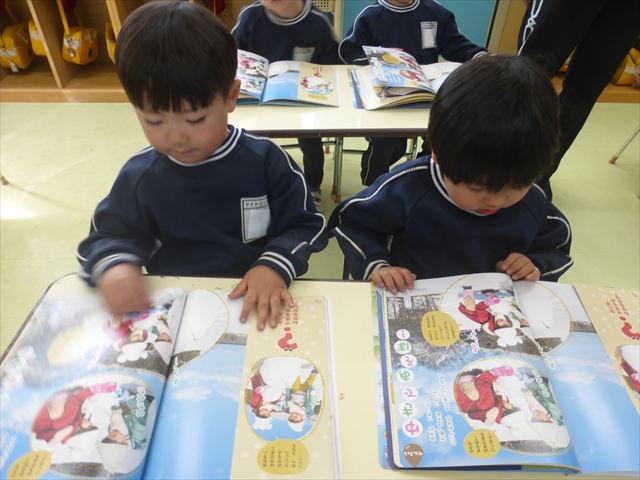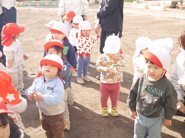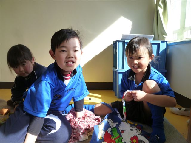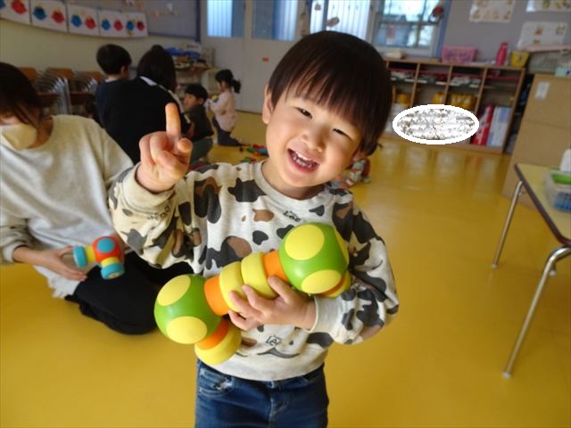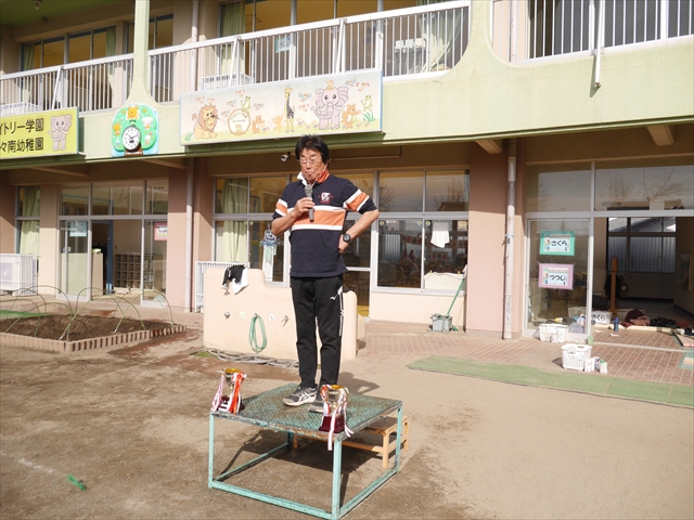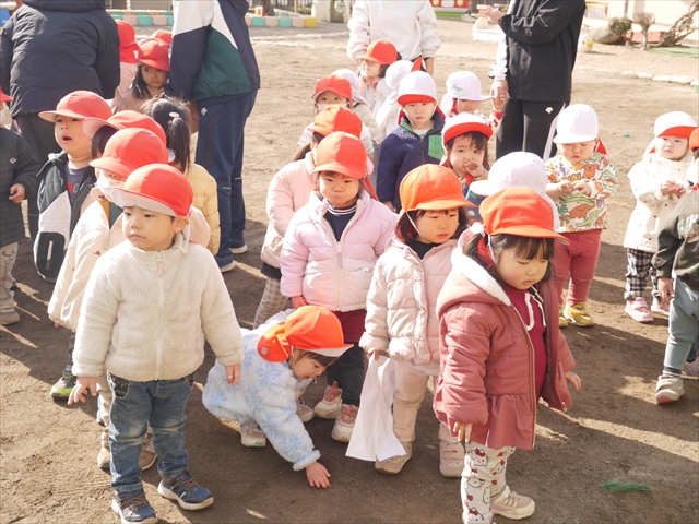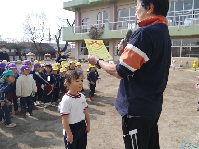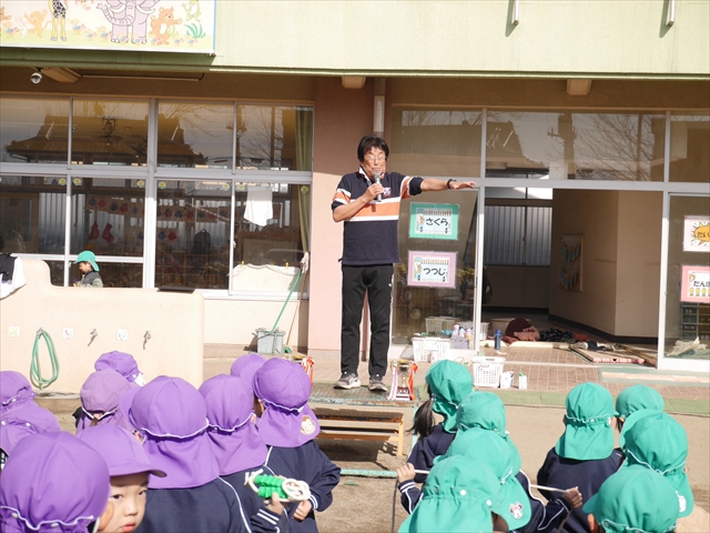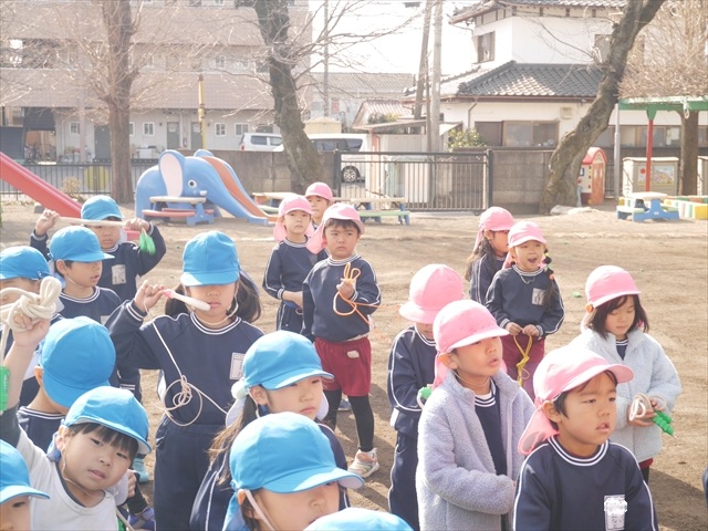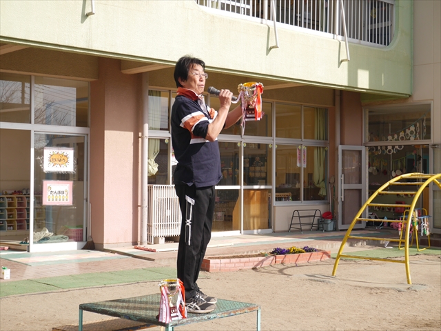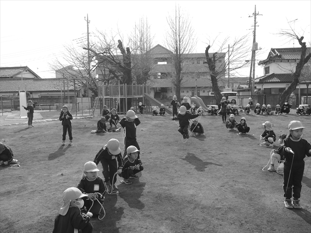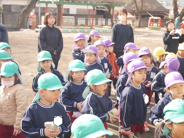 全学年で実施し、最初はたんぽぽ組から年長組までが「なわとび発表会」を行いました。たんぽぽ組は長縄跳び、年少組は前跳び、年中組と年長組は前跳びから後ろ跳び、あや跳び、交差跳び、二重跳びと順にできる子が発表してくれました。みんな着実に上手になり、回数も増え、跳べるようになったり自分の記録を更新した子もいました。えらい!そんな中、年少組では「前回し跳び」を5回連続跳べた「ちかちゃん」がチャンピオンでした。えらい!頑張りました。来年が楽しみです!(^_^)v ヘ(^o^)/