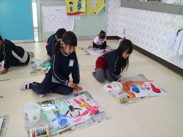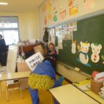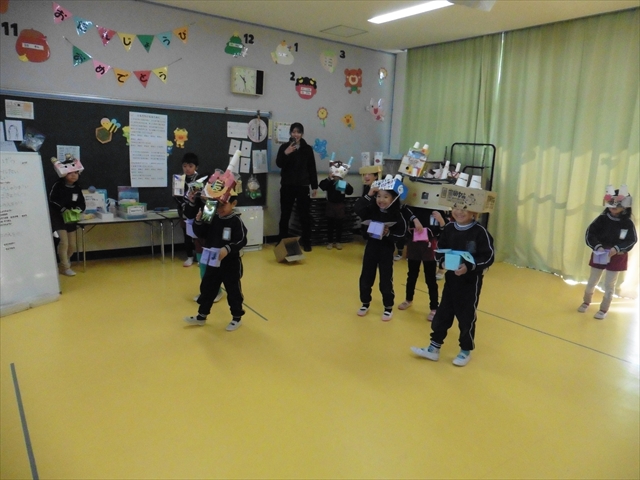 「節分集会」では、みんな「鬼のお面」をかぶって参加しました。これは、いままでそれぞれの学年で、実態に合わせて工夫を凝らし、頑張って作成した一人一人個性豊かな「鬼のお面」です。バラエティに富んだ楽しい「鬼面集会」となりました!各学年ごとにお面を見せ合い、みんな大喜びでした。二人の先生の「節分の由来の話」の紙芝居を楽しんだ後、教室に戻って「豆まき」となりました。(*^_^*)