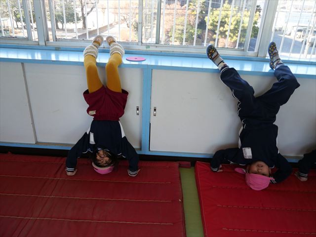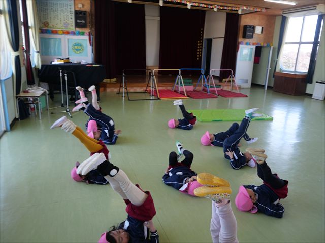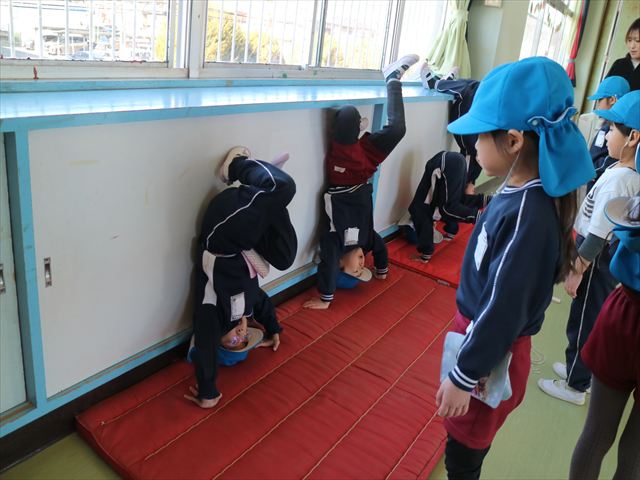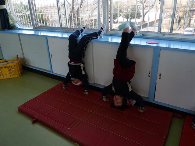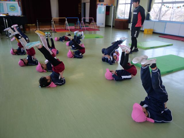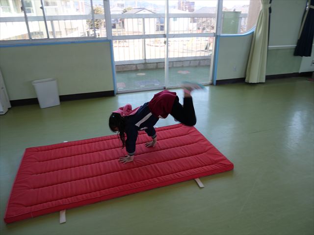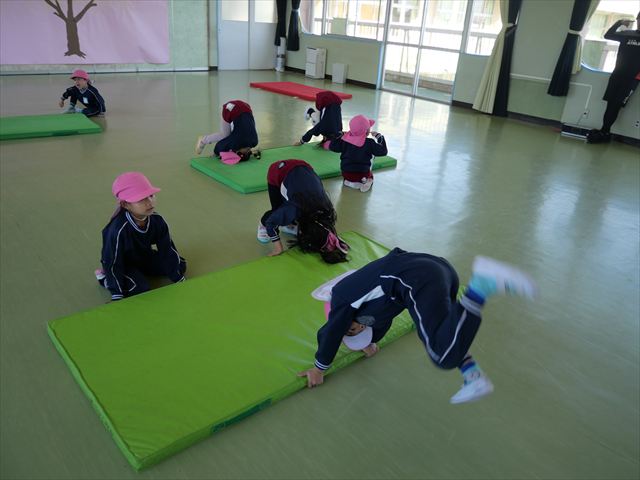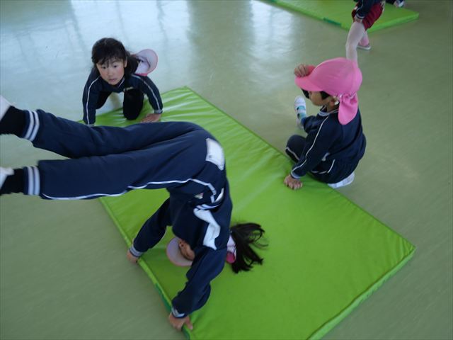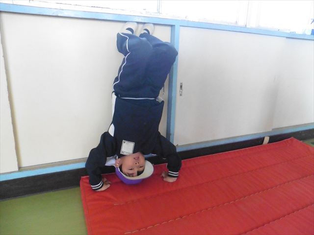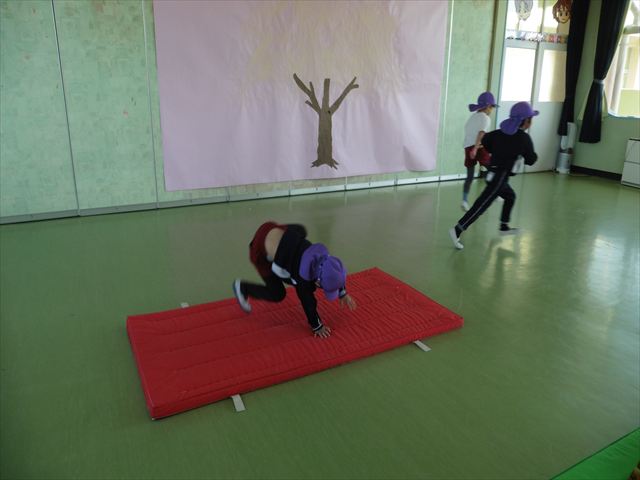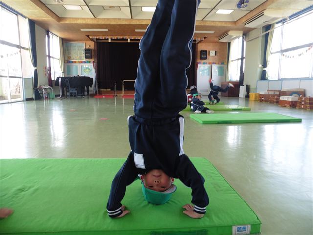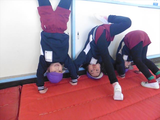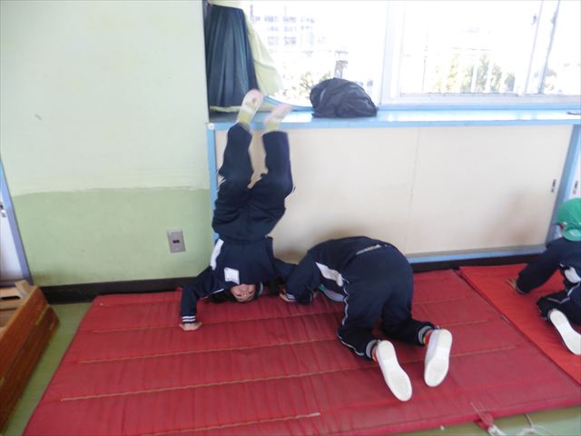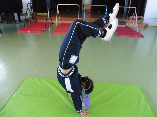 今日の運動は跳び箱と側転、倒立の練習をしました。跳び箱は1段以上跳べる子も増え、難しい側転もみんな真剣に取り組んでいて、コツをつかみ練習している姿も見られました。倒立では頭をマットにつけづにできる子が増え2学期からレベルアップした子どもたちの姿が見られました!頑張った後はみんなで鬼ごっこ☆とても楽しんでいました!