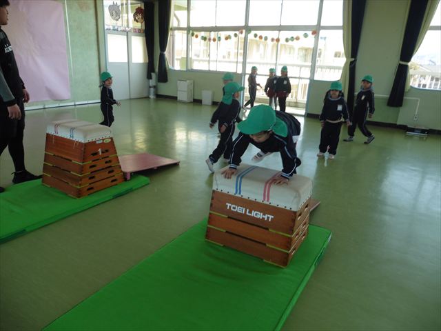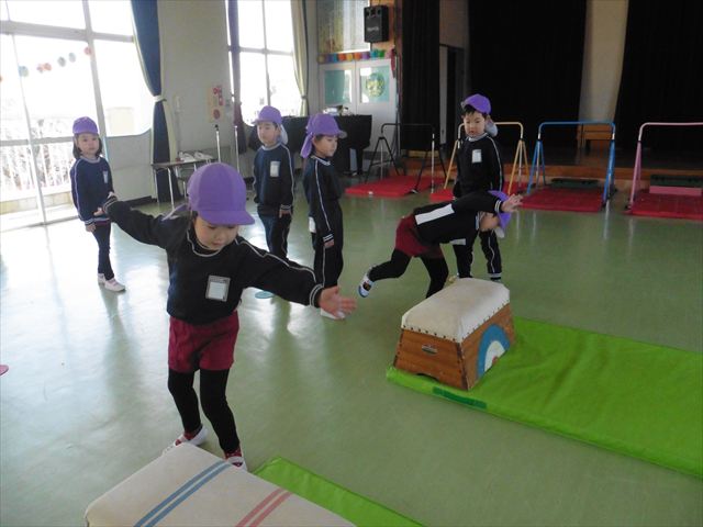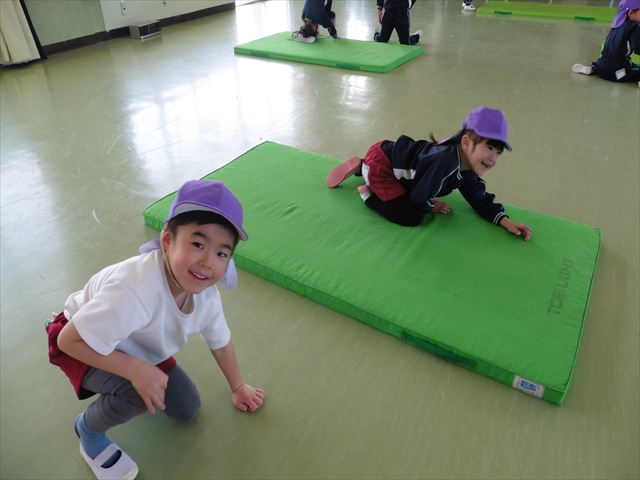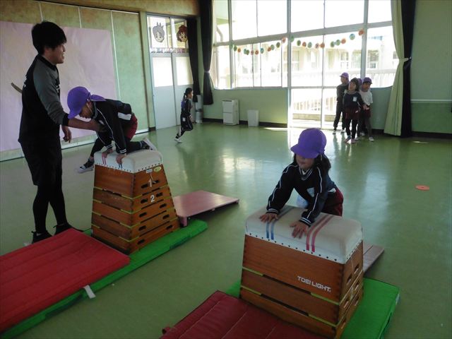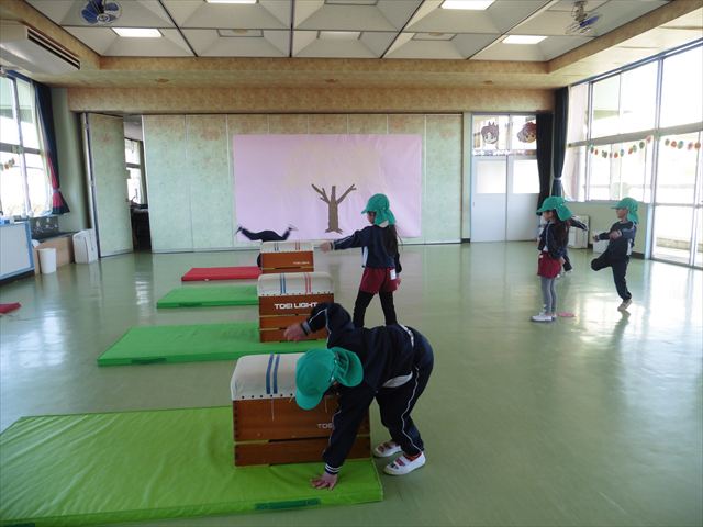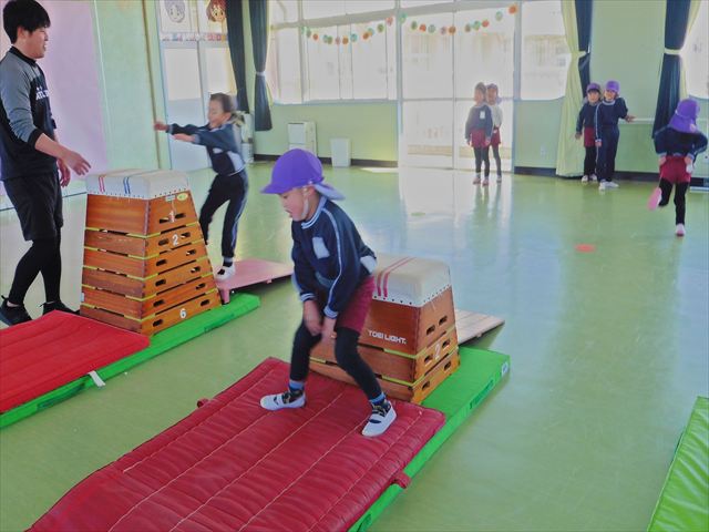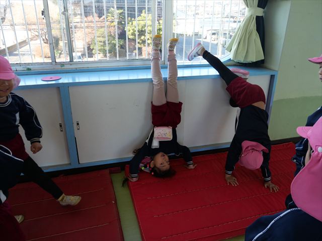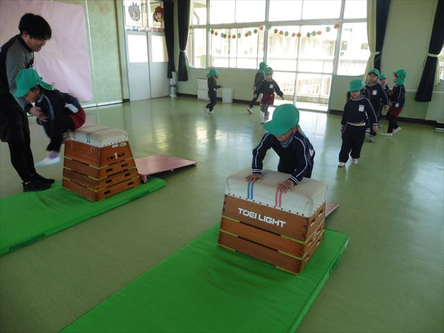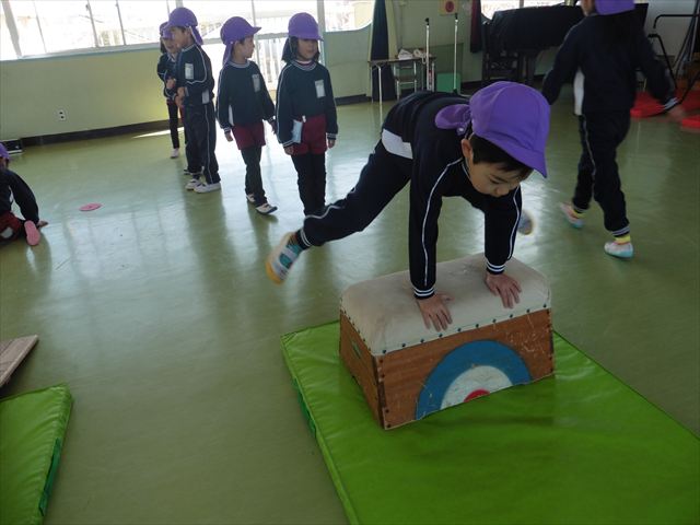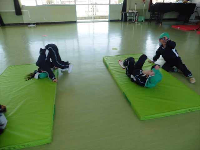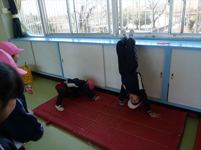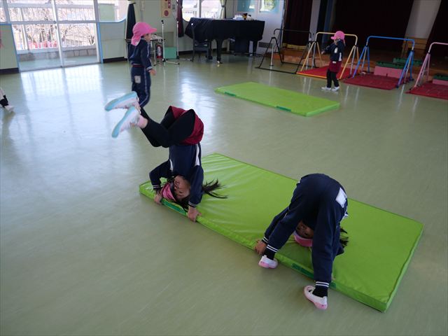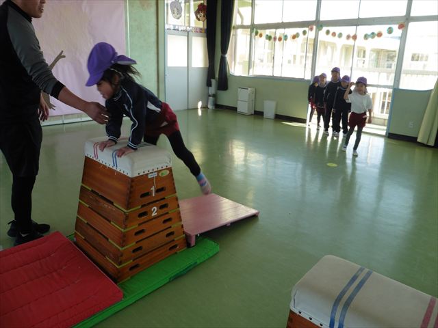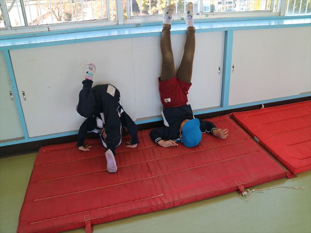 今日の運動は跳び箱と側転、倒立の練習をしました。跳び箱は1段以上跳べる子も増え、難しい側転もみんな真剣に取り組んでいて、コツをつかみ練習している姿も見られました。倒立では頭をマットにつけづにできる子が増え2学期からレベルアップした子どもたちの姿が見られました!頑張った後はみんなで鬼ごっこ☆とても楽しんでいました!