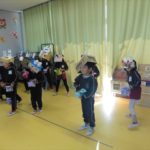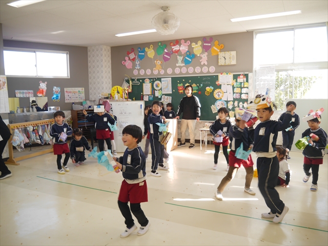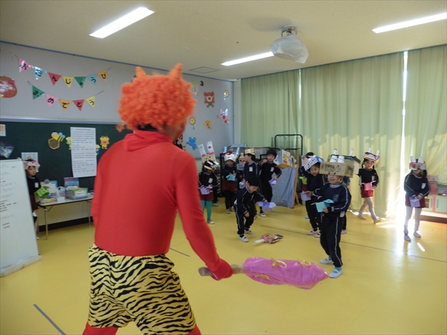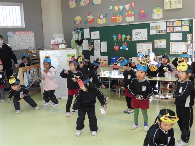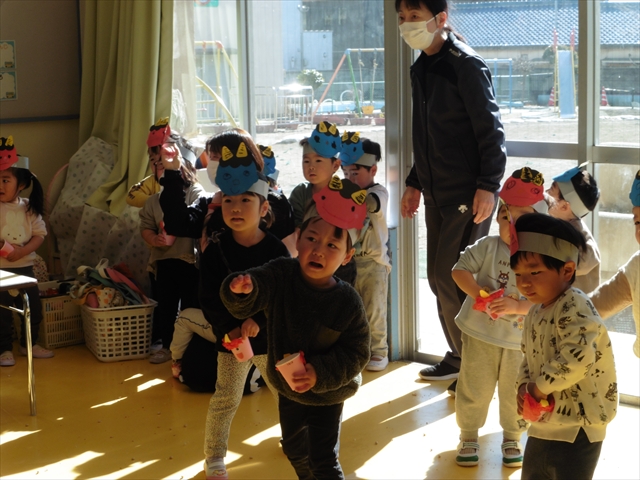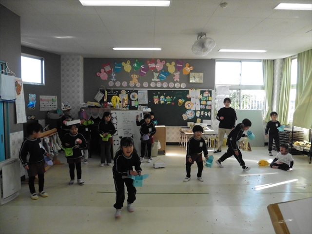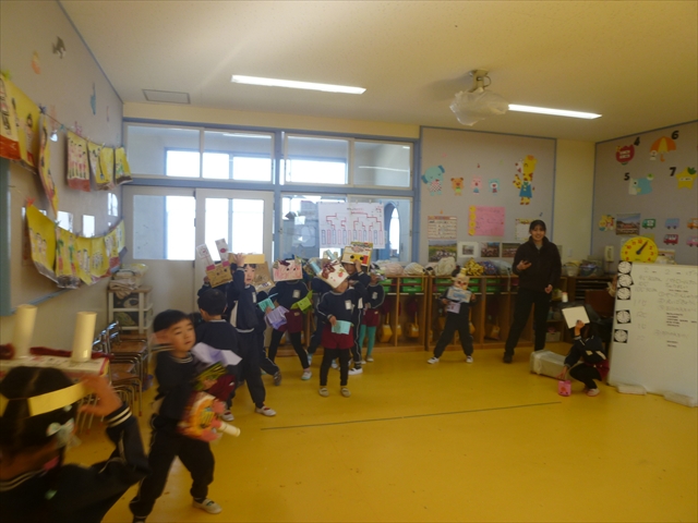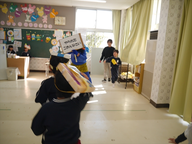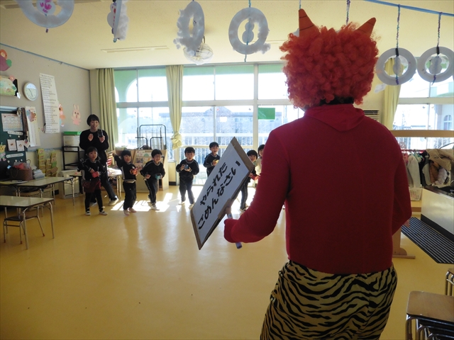 各学年、各クラスに「赤鬼」と「青鬼」が突然やってきましたが、みんな頑張って豆で鬼を追い払い、退治してくれました。中には、怖い鬼に負けて泣き出してしまった子もいましたが、みんなで協力し合って鬼退治ができました!えらい!えらい! \(^_^)/これで、世の中の悪い鬼も、マイトリー幼稚園にいる悪い鬼も、みんなの心の中にいる悪い鬼も、みん~ないなくなるといいのですが・・・・・・!(^_^;)