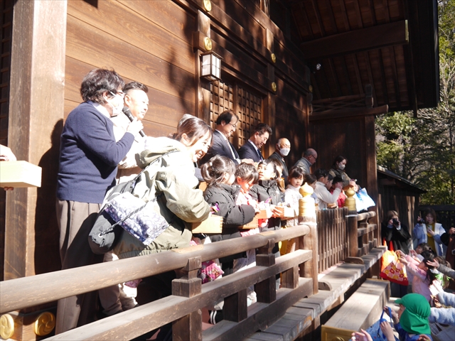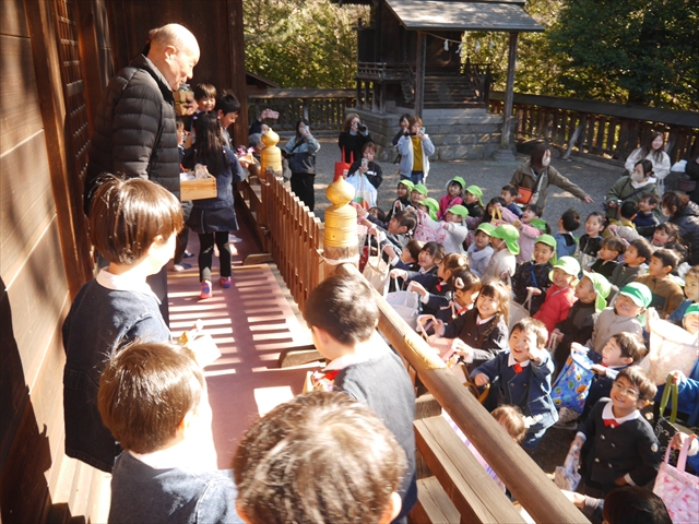 10時から儀式が始まり、マイトリー幼稚園のうみ組さんが、続いてたいよう組さんが最初に神事を行い、「節分祭」の豆まきをしてくれました。宮司さんに「福」が身につくようお祓いをしてもらい、その「福」をみんなしっかり「豆まき」して来た人たちに広めてくれました。また、自分たちが「福」もらう番になったら、みんな真剣勝負で「豆まき」した「福」を自分の大きな袋にしっかり入れていったようです。みんなたくましかったです!(^_^)v みんなたくさんお菓子を手に入れたようでしたが、そんな中マイトリー幼稚園の「福取り」チャンピオンは、うみ組がつぐちゃん「20個」、たいよう組がまひちゃん「23個」でした。すごい!えらい!えらい!「福」をいっぱい手に入れました! ヘ(^o^)/ (^_^)/