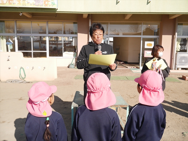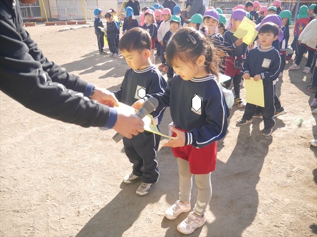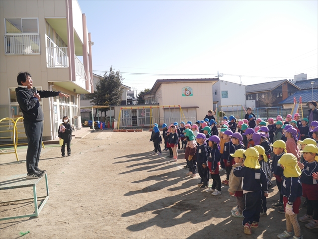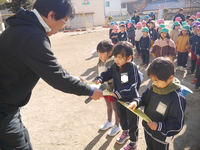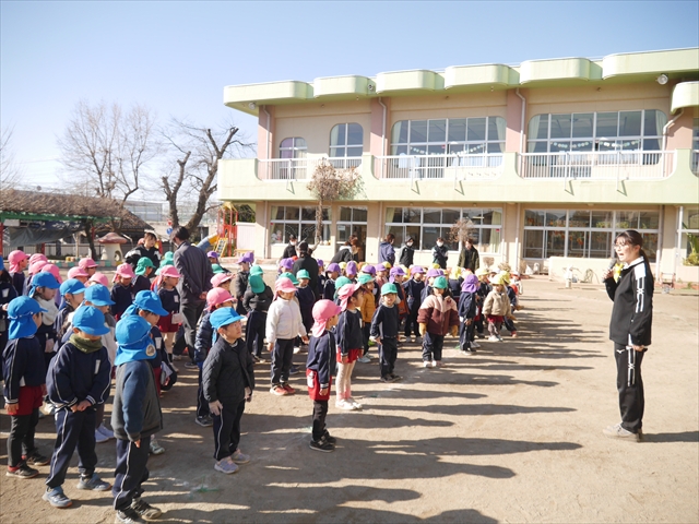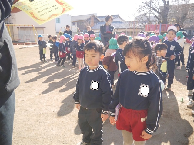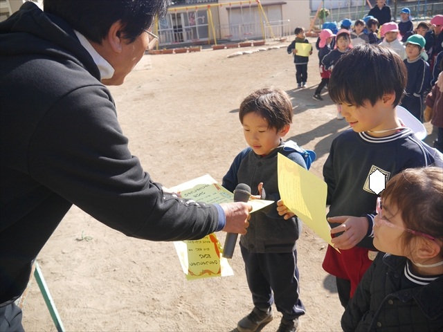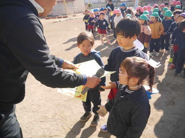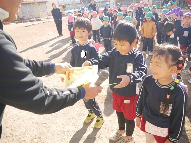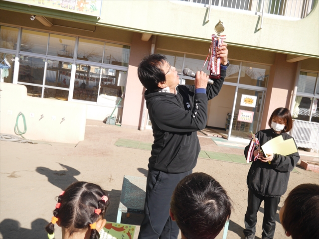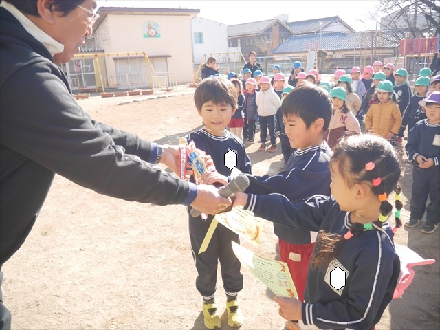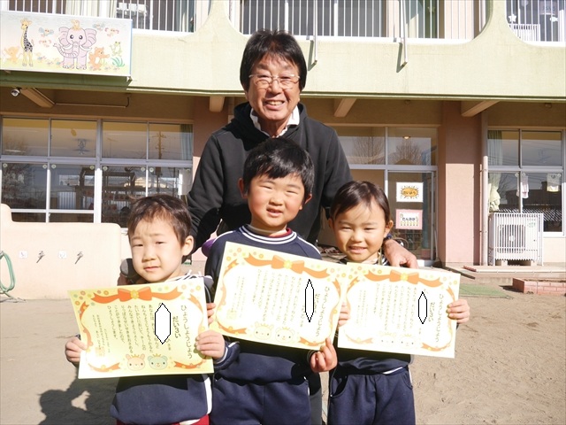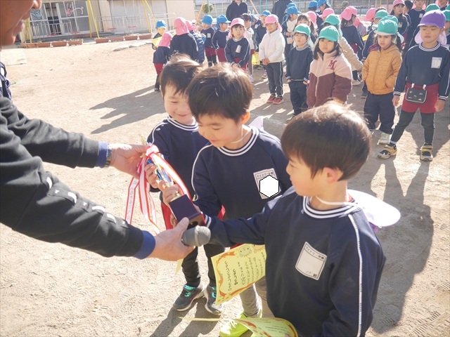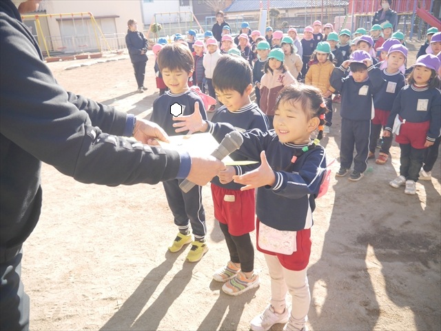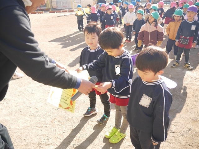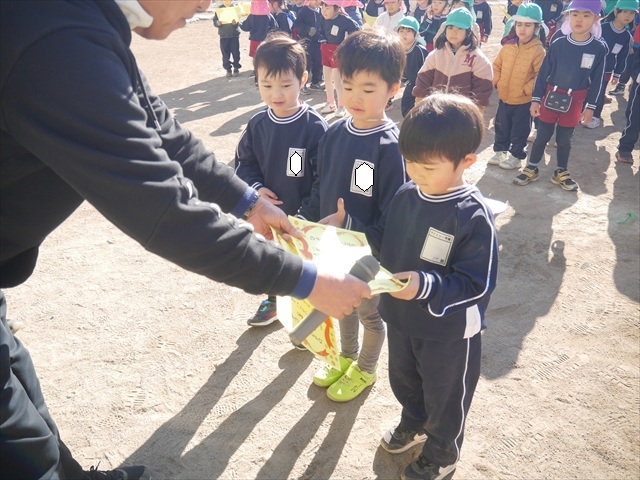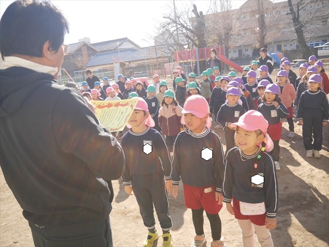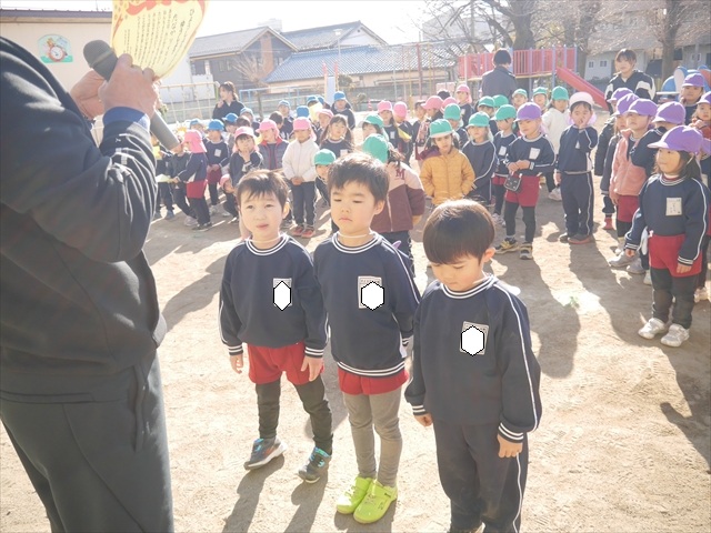 明日は小学校交流と小学校探検で大間々北小学校に出かけます。制服登園になります。また送迎の子は9時までに登園するようご協力よろしくお願いいたします。今日は「朝礼」で、年長組・年中組「上毛かるた大会」の表彰式を行いました!入賞した子どもたちおめでとうございます!ヘ(^o^)/ \(^_^)/