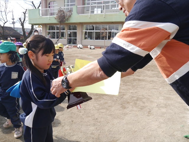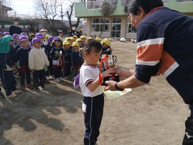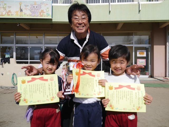 そして、最後は年中組と年長組が「なわとび」で一番簡単な「前回し跳び」を行い、「誰が一番回数が多く跳べることができるか?」を競い、「なわとびチャンピオン」を決める「マイトリー杯なわとび大会」を行いました。まず予選を行い、年長さんも年中さんもすごく成長していて、みんな長くたくさん「なわとび」を跳べることができています。しかし、予選も決勝も本番は一発勝負の大会ですから、子どもたちみんな緊張していて本来の実力を出せなかった子もたくさんいたのでかわいそうだったのですが、そうした中緊張感にも負けず体力的にも頑張った子たちが入賞を果たしました。えらい!えらい!今年度も、年中組も年長組も凄い回数の記録が生まれました。両学年とも決勝では、一人に残ってずっと跳び続けた友達にみんな大きな声で応援してあげて、微笑ましい温かい姿が見られ感動的でした!(*^_^*) (^_^)b とにかく決勝本番で実力を出し上位3位以内に入った子たちは、本当によく頑張りました。えらかったです。また、入賞できなかった子たちも、みんな凄く向上していて、とっても偉かったです!\(^_^)/ (^_^)v
