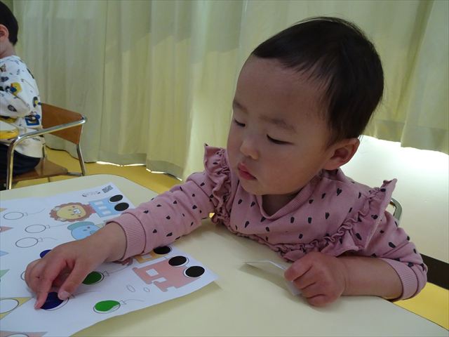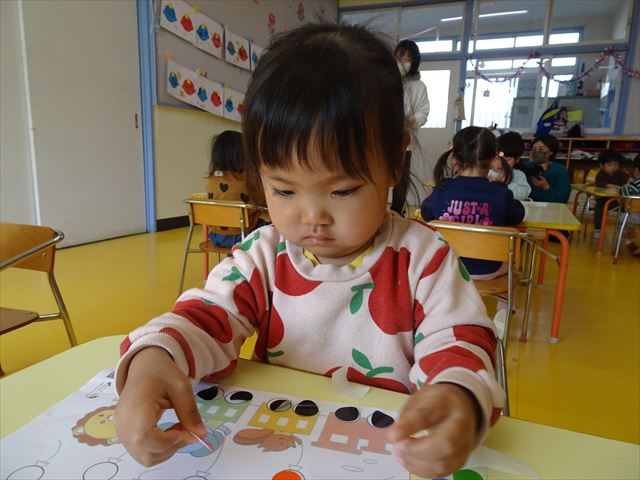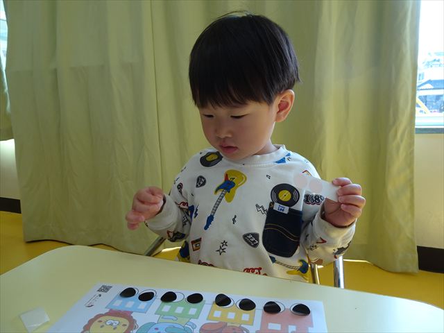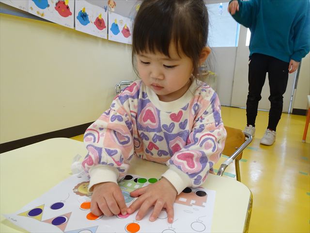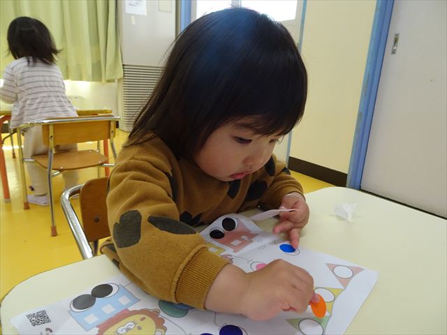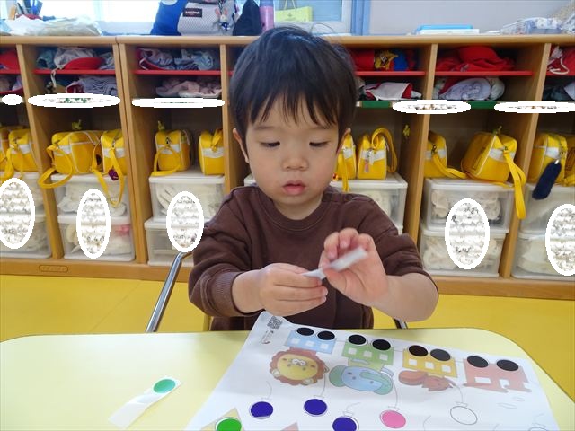 【満2歳児】シール遊びをしました!今回は二種類のシール貼りに挑戦しました。「タイヤとイチゴのつぶつぶは黒だね」とみんなで確認し、黒を貼ってから他の色は自由に貼りました。どこに貼ろうか考えながら、集中して貼ることができました!今日持ち帰りましたので、ぜひご覧ください♪