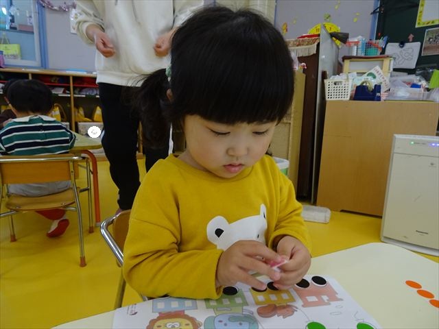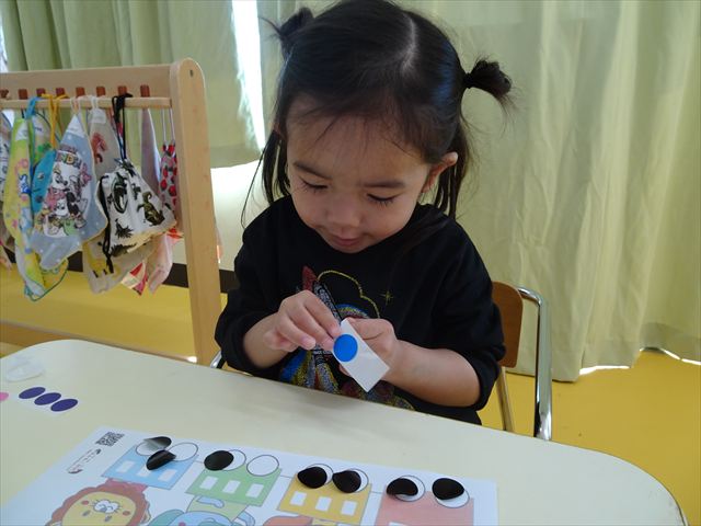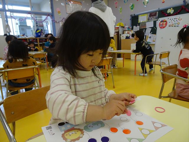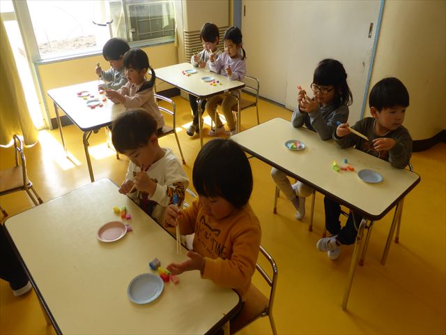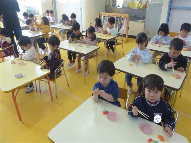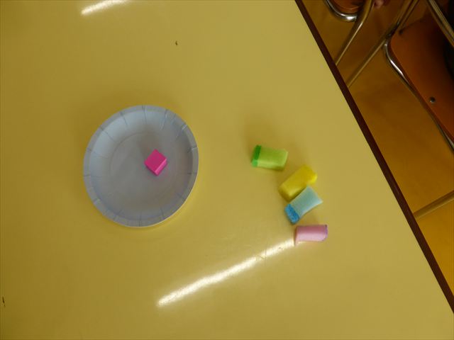 【満3歳児】算数の時間で、数遊びをしました!スポンジを一人5個ずつ用意し、1~5までの数字をみんなで一緒に数えて確認しました。そして、先生が出した数字と、同じ数のスポンジをお皿に入れられるかチャレンジ☆前にある数字と〇の数をよく見て、チャレンジすることが出来ました!数字への理解もだいぶ深まってきているたんぽぽさんです(^^)/その後は、箸遊びでスポンジを掴む練習をしました。前に行なった時よりも、箸の使い方がとても上手になっていました!
