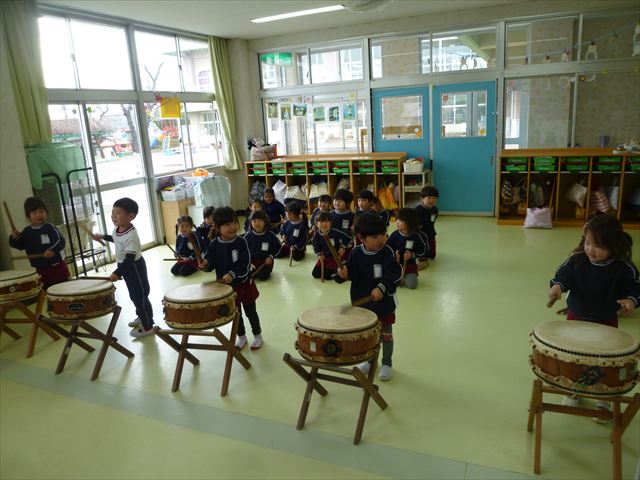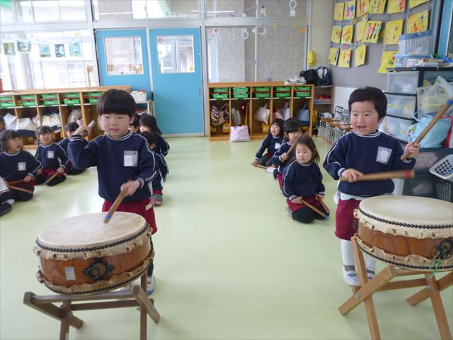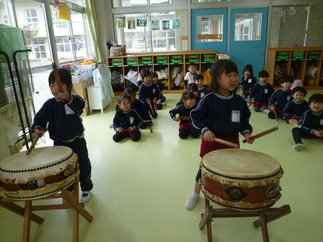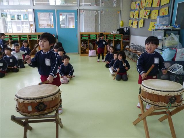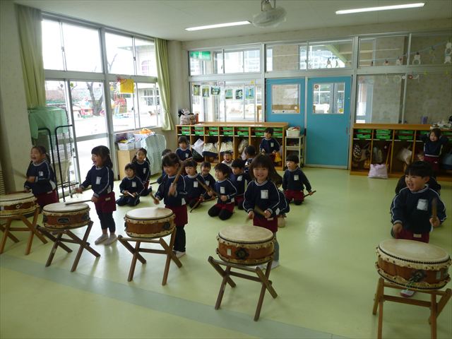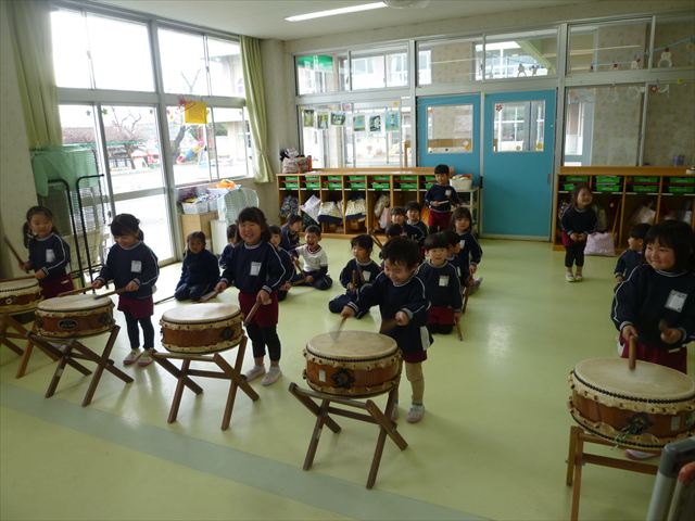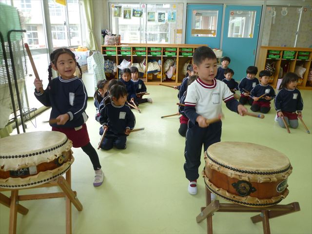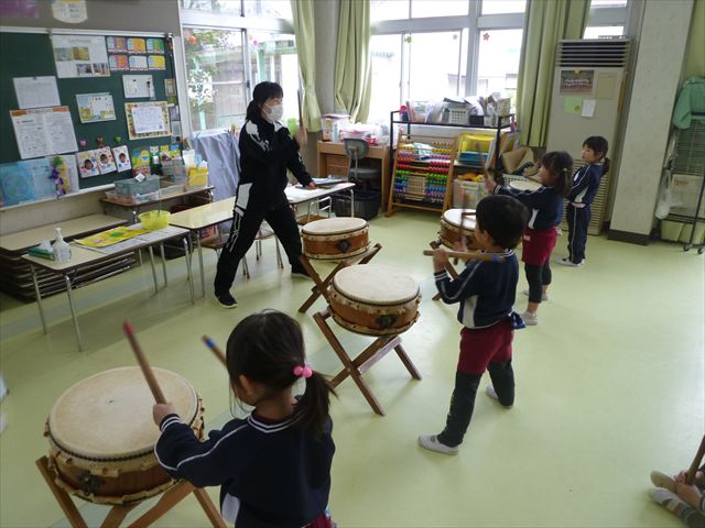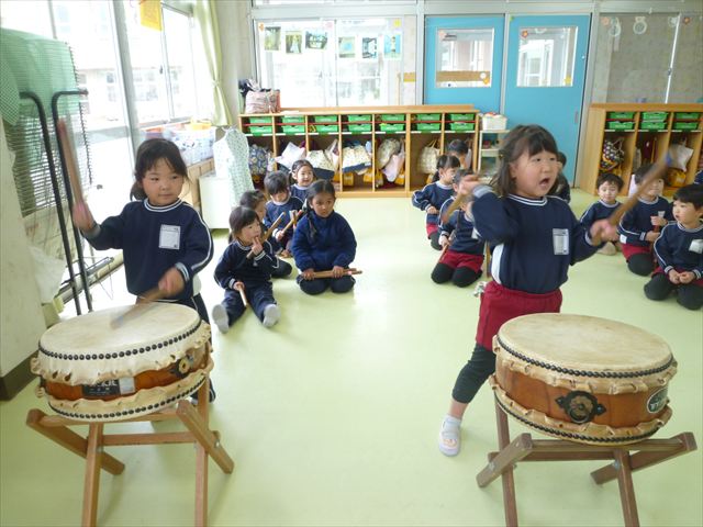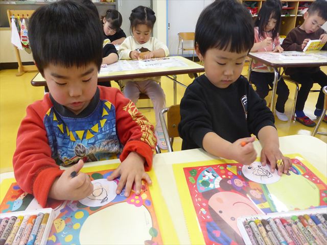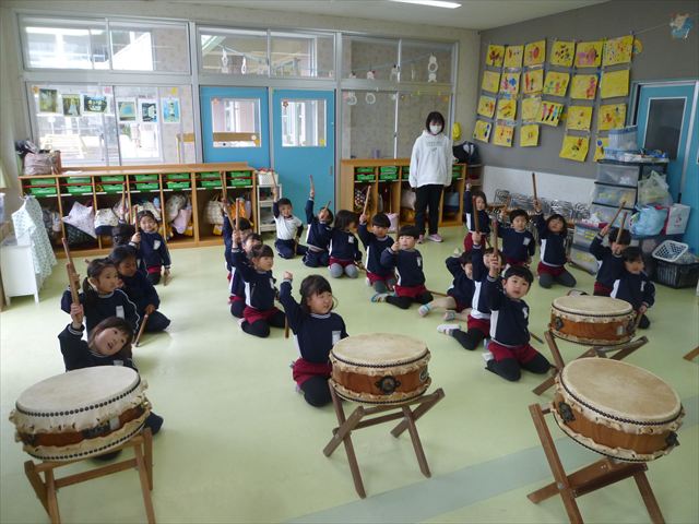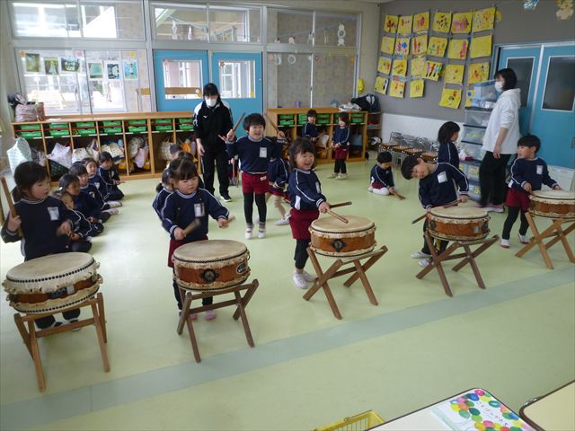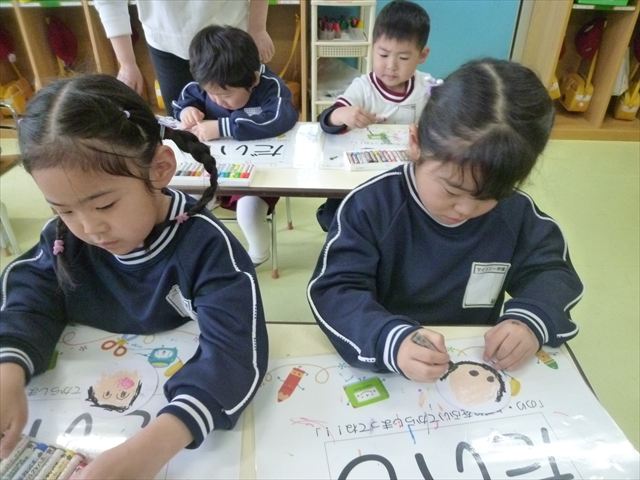 ^^)みんな上手に顔を描くことができるようになりました。午後は、道徳の時間として絵本の読み聞かせを行いました。綺麗でないことがは人を傷つけてしまうのできれいな優しい言葉を使って伝えよう!とお話をしました。その後は、リズム遊びとして太鼓を使いました。みんな目を輝かせながら取り組んでいました。