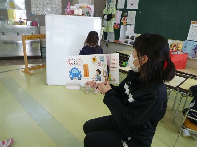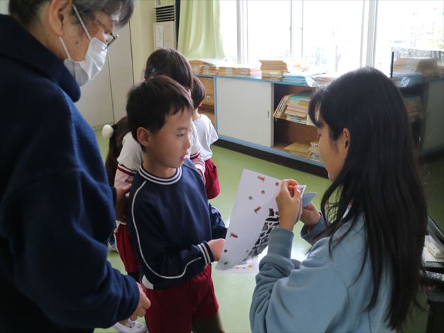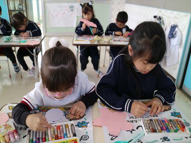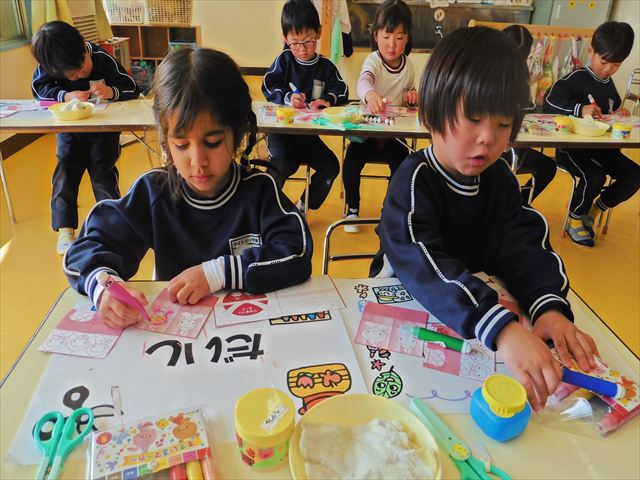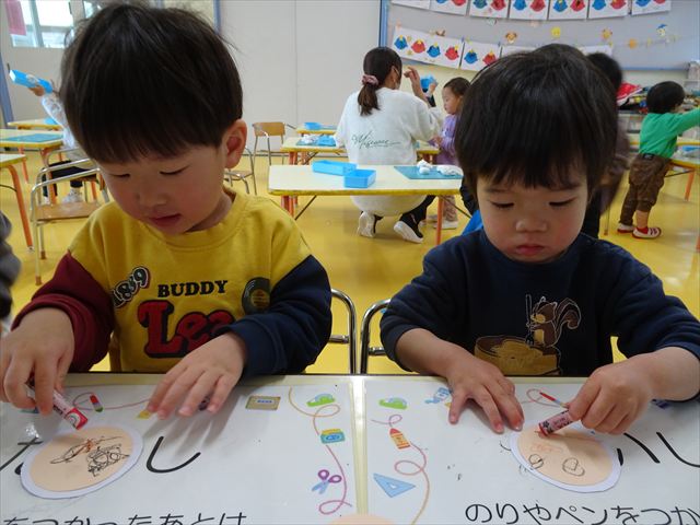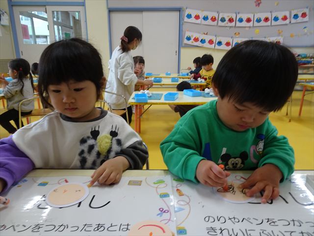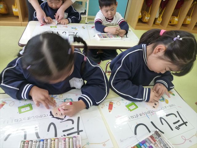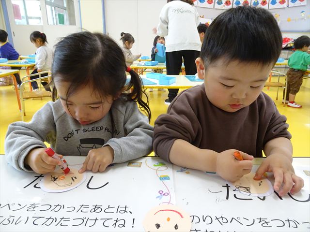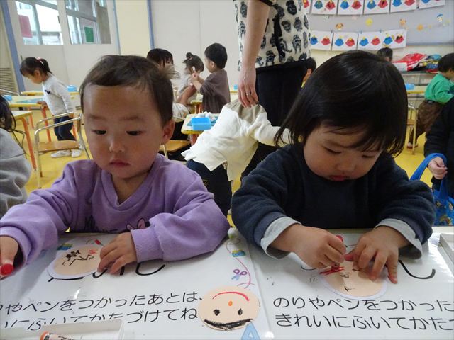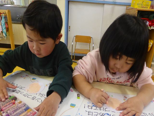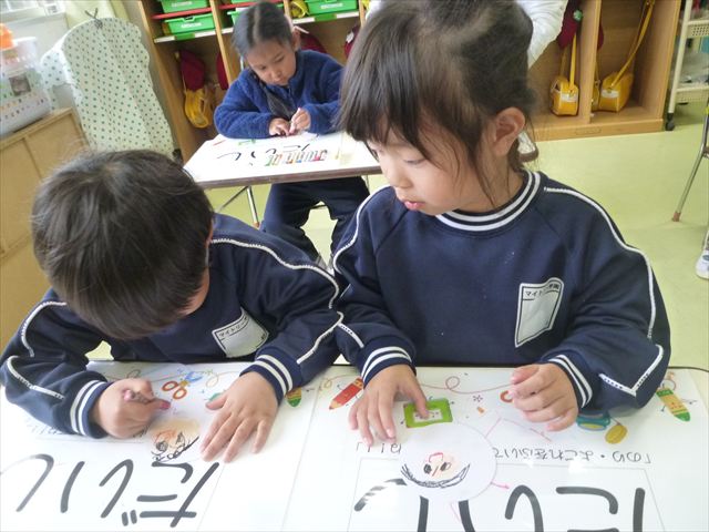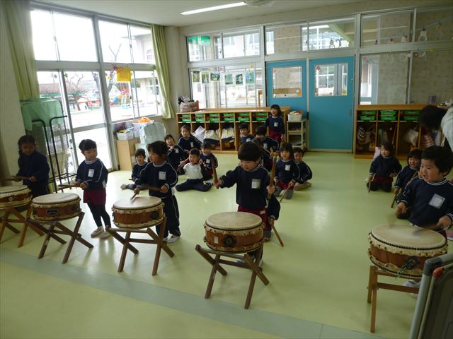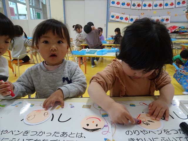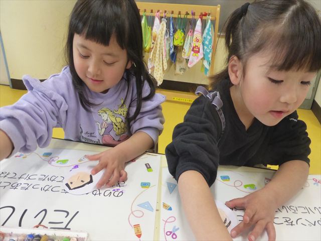 ^^)みんな上手に顔を描くことができるようになりました。午後は、道徳の時間として絵本の読み聞かせを行いました。綺麗でないことがは人を傷つけてしまうのできれいな優しい言葉を使って伝えよう!とお話をしました。その後は、リズム遊びとして太鼓を使いました。みんな目を輝かせながら取り組んでいました。