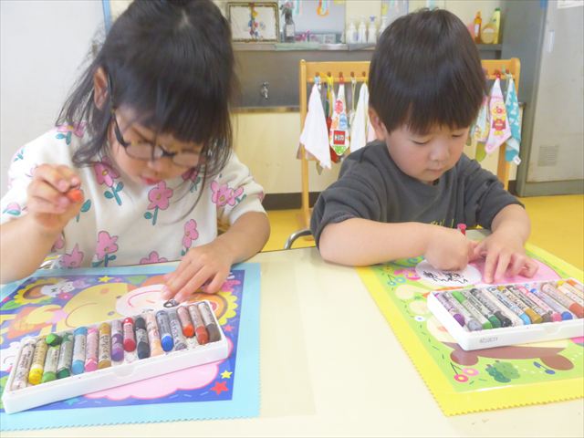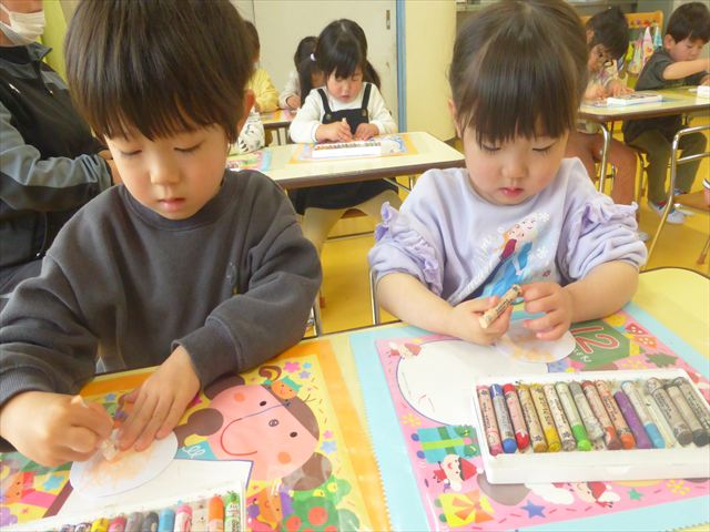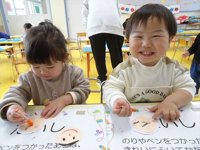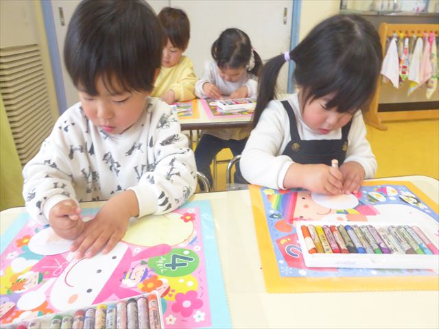 今日は、廊下壁面製作で「さくら」を作りました。幼稚園のお庭にも桜が咲くけど、お部屋の前の廊下にも咲かせてあげよう!と製作に取り組みました。満2歳児さんは、顔の形の画用紙にクレパスで目鼻口髪の毛を描きました。それぞれのパーツを確認しながら、上手に描くことができました(