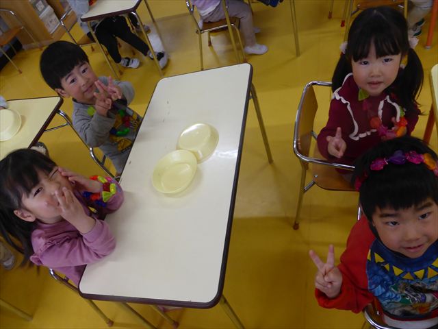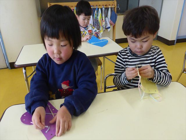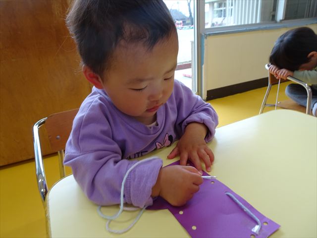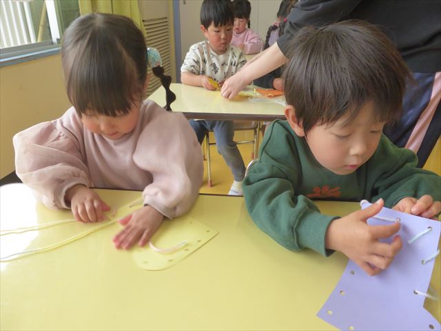紐通しをしました!満2歳児さんは、食べ物に穴が開いていて、イモムシを通す紐通しをしました。イモムシがパクパクと食べ物を食べているような姿に喜んでいました(^^♪満3歳児さんは、キラキラビーズに紐を通して、ネックレスや冠、ブレスネットを作りました。完成するとお友だちと見せ合い、とても楽しそうでした!(^^)!
