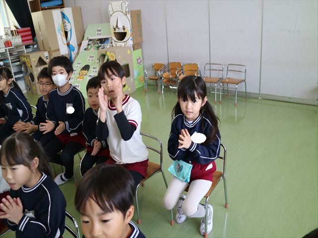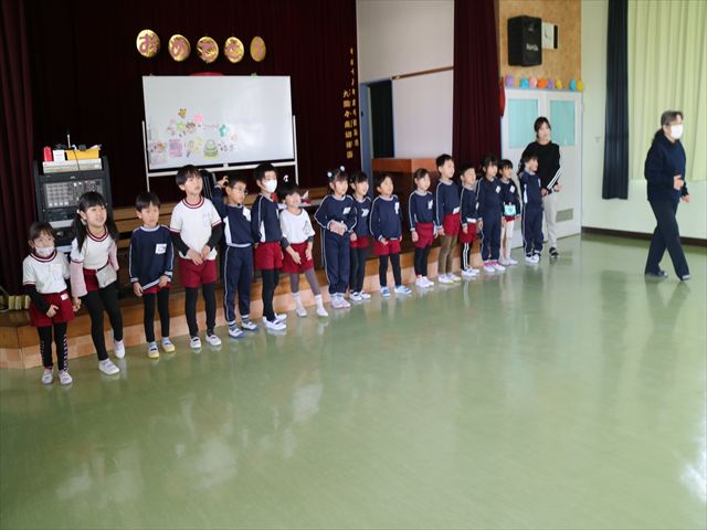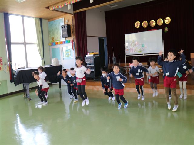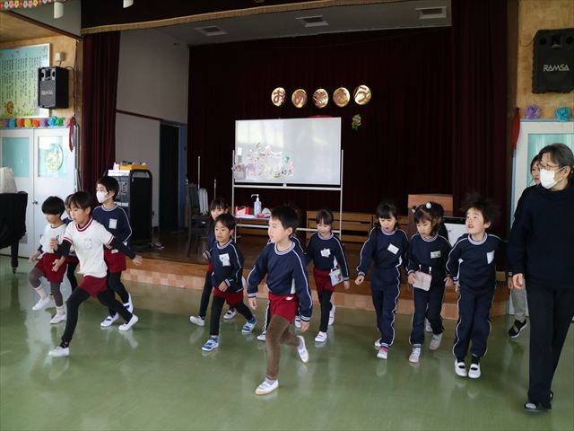 また、誕生日のお友だちには、PTAからの記念品(図書カード)が一人ひとりに贈られました。お祝いの出し物は、年中さんたちがステージ上で、おひな様の「パネルシアター」をして盛り上げてくれました。また、先生方からは、今年度最後の誕生会なので全職員で盛り上げようと、全本務者職員が参加して昔のヒット曲がリバイバルヒットしているということで、ラッツ&スターの「め組の人」の「歌とダンス」を披露し、子どもたちを楽しませてくれました。子どもたちは大喜びで楽しんでくれたので、先生たちも頑張ったかいがありました。まる!(^^;) (^^)v