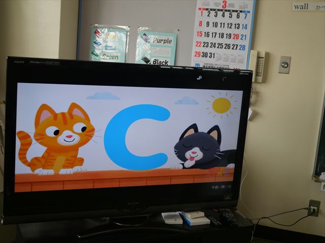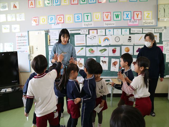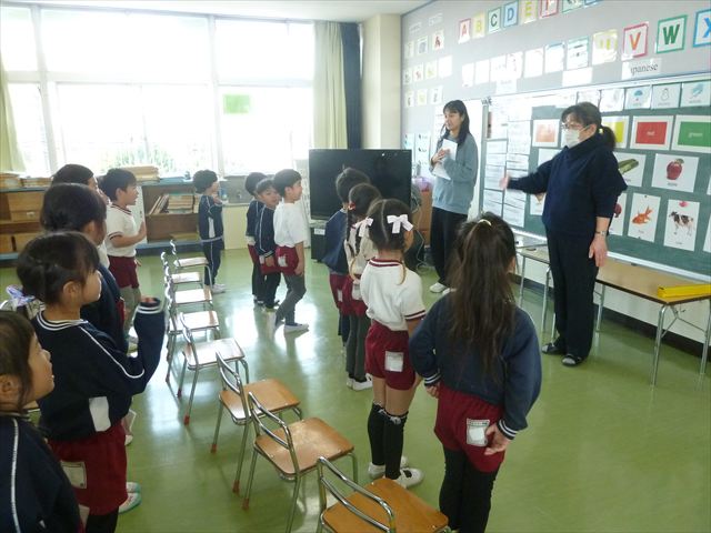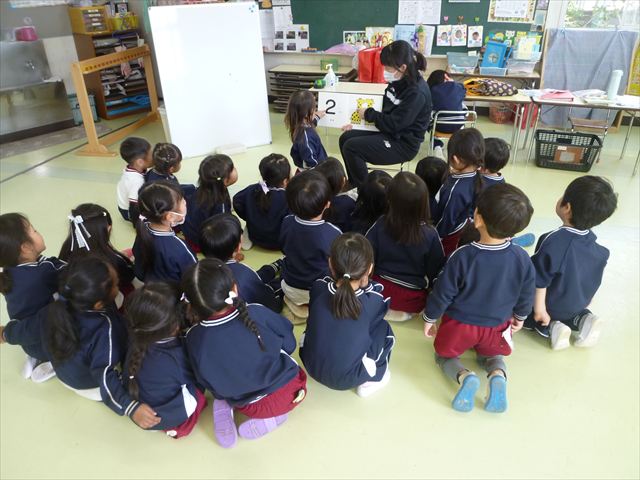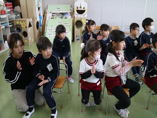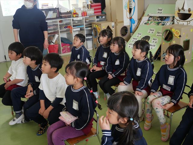 ALT英語教室は最終回でした。動物の名前、アルファベット、色、など楽しく学び、最後は遊戯室で「狼さん今何時?」を英語で遊びました。年中組で今までたくさんの英単語を教えてくれたヤナ先生ありがとうございました!