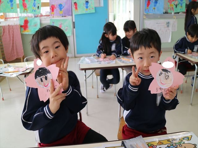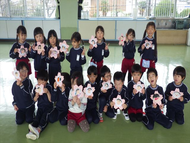 もじあそびの次は、サクラの花の形にハサミで切り、クレパスで描いた自分の顔をサクラの真ん中にのりで貼って仕上げました。