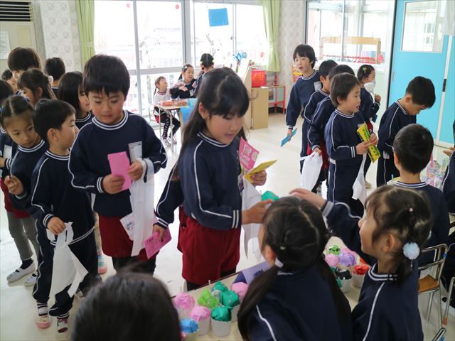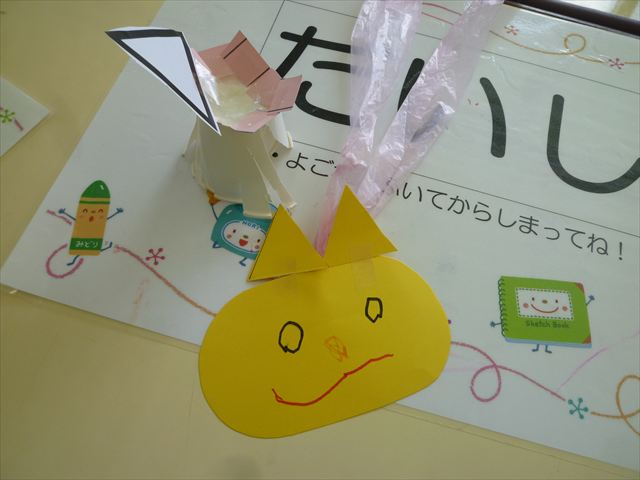 年長・たんぽぽのリトミック教室がありました!前回がインフルエンザの感染拡大で中止になってしまったので、今回が最初で最後となります。まずは体を使って「おおきく3つ」と「ちいさく3つ」!その後は四分音符の1・2や1・2・3のリズムに合わせて体を動かしたり、ともえ先生のウッドブロックの音を聞いて同じ人数でグループを作ったりしました。年長さんがたんぽぽさんに「おいで!」と声をかけてくれたり、優しく手を引いてグループに入れてくれる優しい姿がたくさん見られました(^^)そして、先生たちで「すてきなぼうしやさん」というお話のパネルシアターをしました。森の動物たちが帽子を買いに来て、お友だちも帽子屋さんと一緒にお似合いの帽子を探してくれました!1・2・3のリズムに合わせて、身体や手を動かして楽しそうなお友だちでした。最後はみんなで「さんぽ」の歌に合わせてお散歩♪音に合わせてたくさん異年齢のお友だちと触れ合うことができ、みんな終始ニコニコでした(^-^)ともえ先生、ありがとうございました☆
