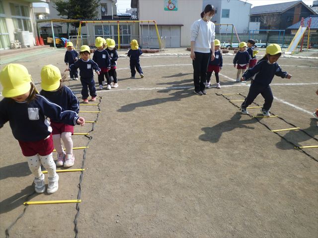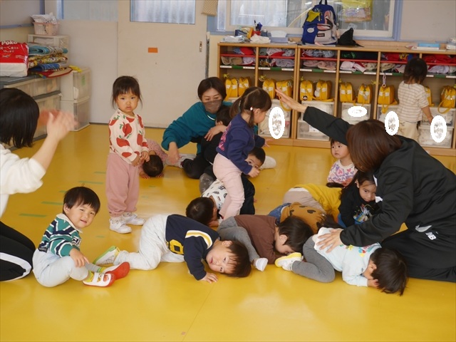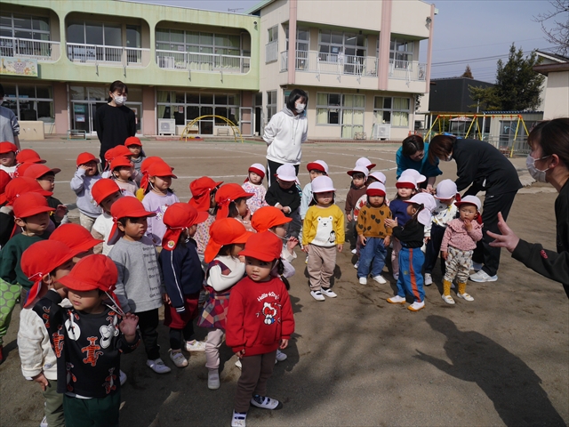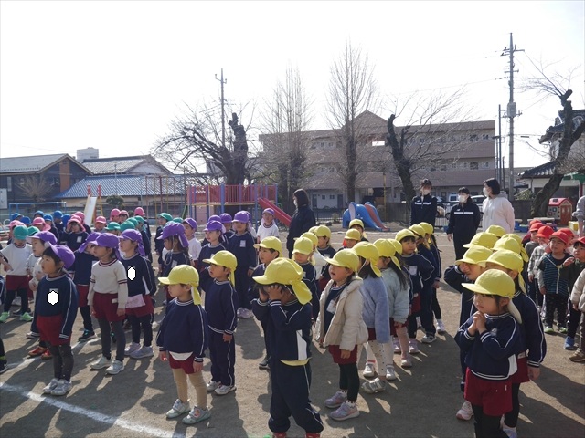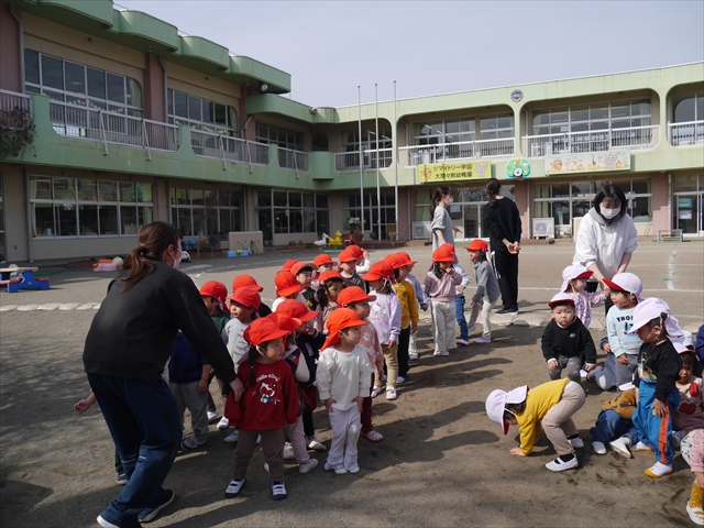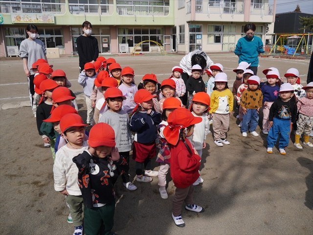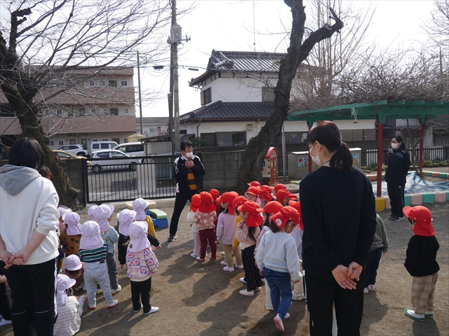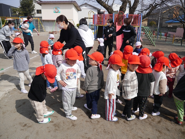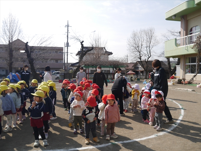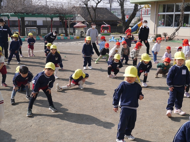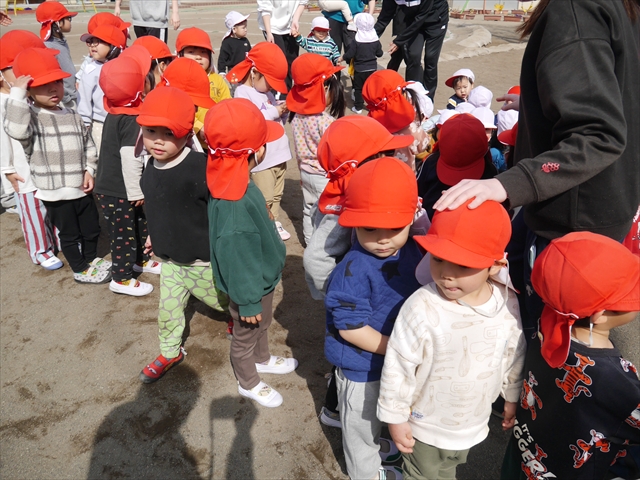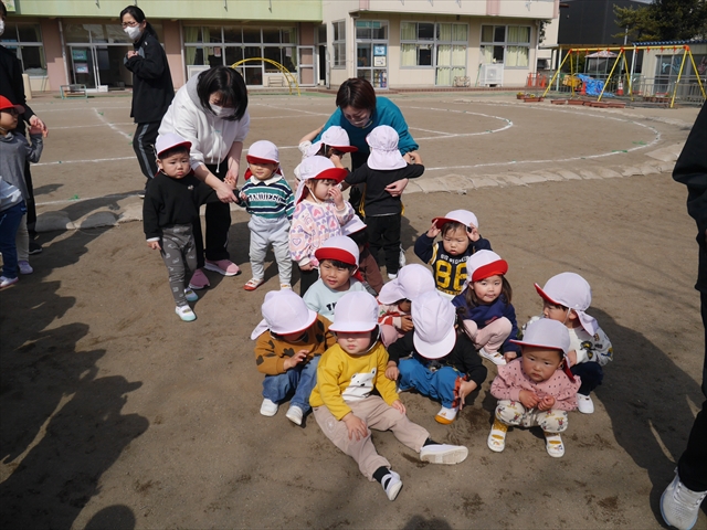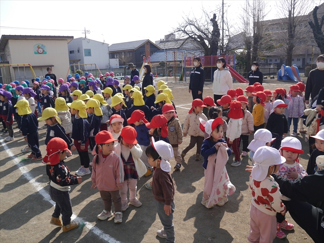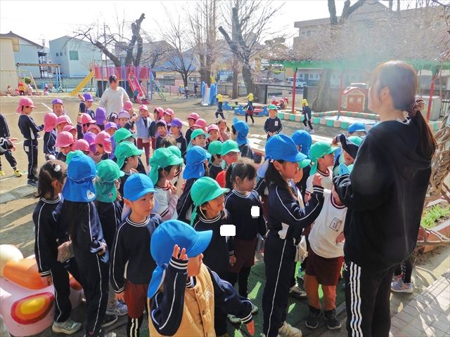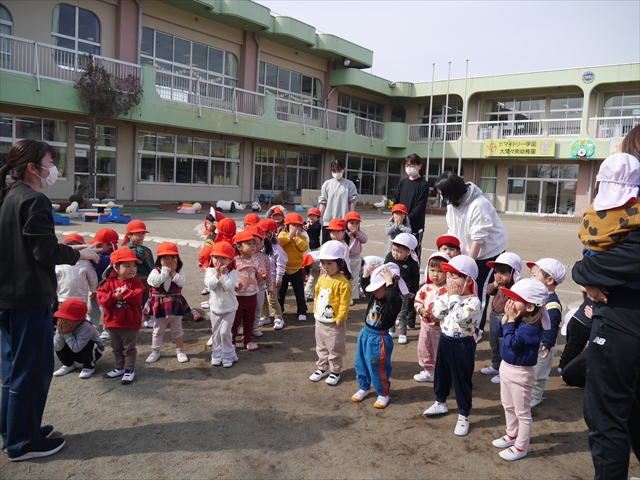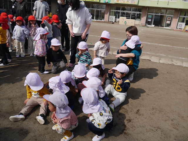 午後は、避難訓練をしました。今回の避難訓練は地震です。「地震がくるよ」と伝えると、サッと頭を隠してダンゴムシに変身できるようになり、ものすごく成長が感じられました!そして、今日で避難訓練は最後となります。一年間を通して、いろいろな避難訓練を頑張ってきました。園長先生にも「たんぽぽさんとっても上手になりました!えらい!」と褒めていただきました(^^)/みんな一年間よく頑張りました!!