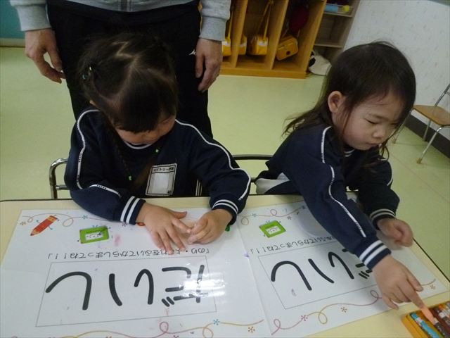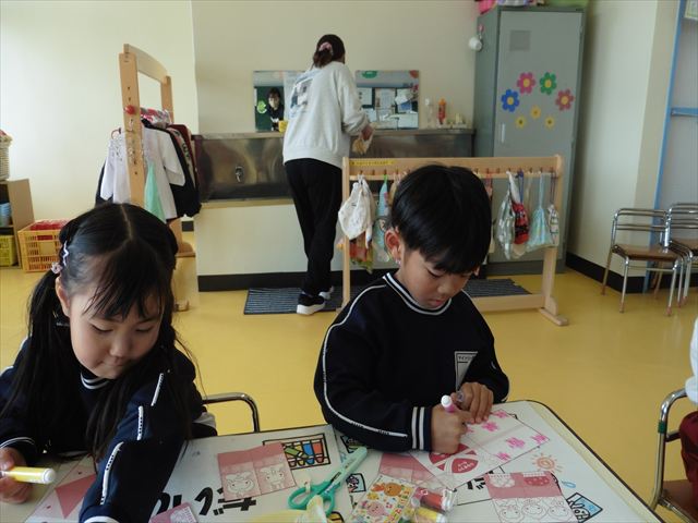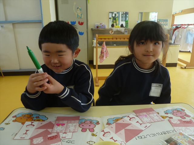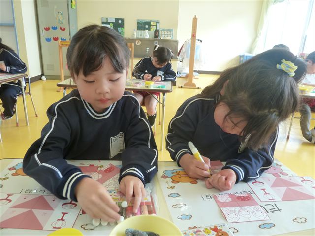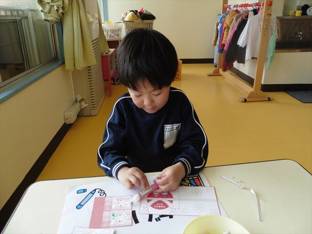 午後は算数の時間をしました。ミッキーの耳の数字を合わせると顔の数字になるミッキー計算に挑戦しました。みんな自分で考えながら取り組むことができました!そのあとは室内遊びを楽しみました!