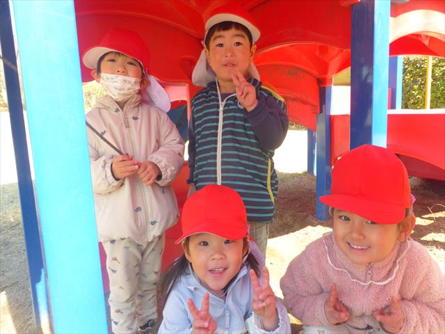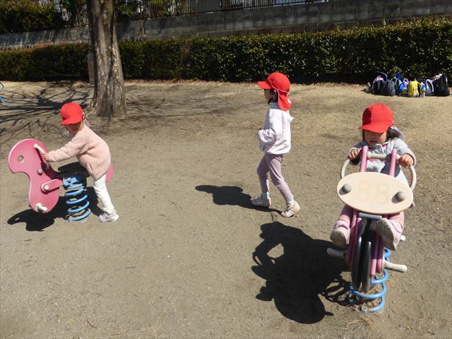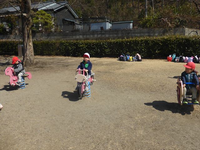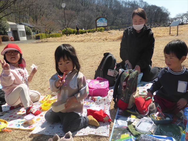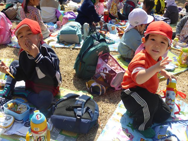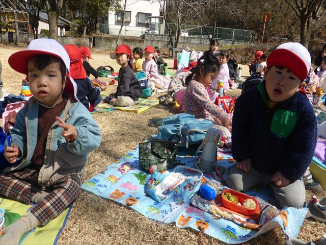 お昼ごはんの時も、一人一人が自分のシートを敷き、食べる準備ができるようになってきているので、いつでも満3歳児さんは年少さんになれそうです。えらい!とにかく食べる時はポカポカで暖かく、気持ちよくお母さんの愛情たっぷりのお弁当が食べられました。みんな「おいしい!おいしい!」と喜んで食べていました。良かったね!(^^)v (