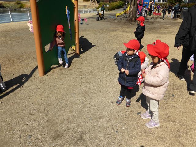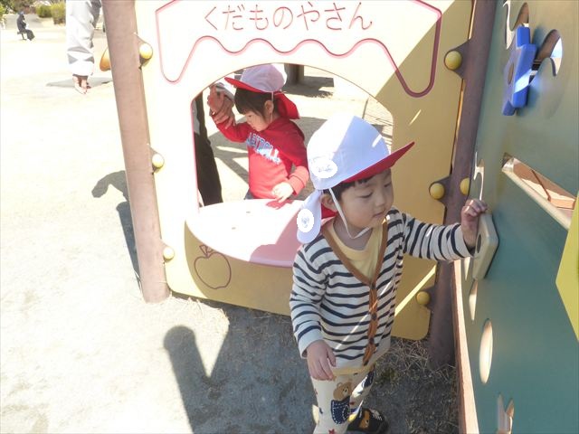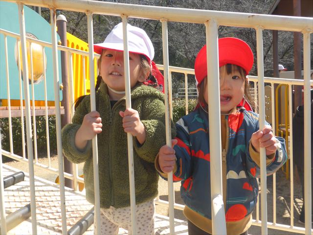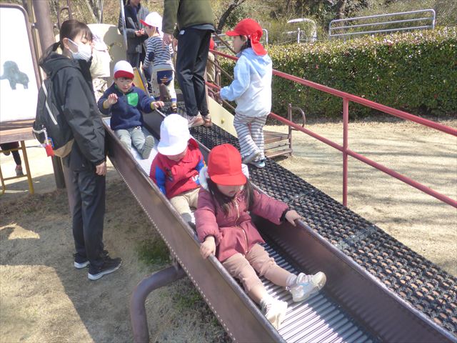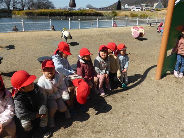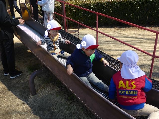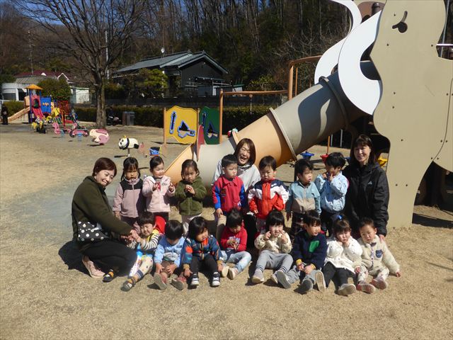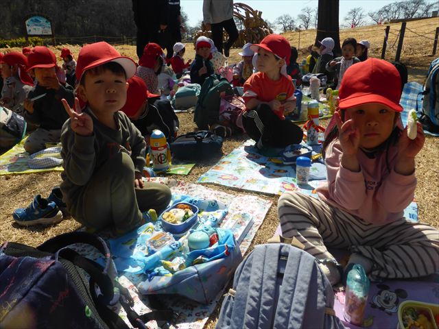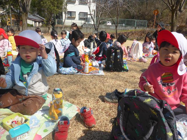 今日は年長組も「お別れ遠足」なので、年長さんが通園バスローザ(39人乗り)を使用しました。たんぽぽ組は、通園バスハイエース(25人乗り)とキャラバン(12人乗り)を使用したのですが、今年のたんぽぽ組は43名と人数が多いので、2段階に分けて出発しました。最初に満3歳児組が出発し、後発として幼稚園に戻ったバスで満2歳児組が出発しました。とにかく遠足日和のうららかな天候だったので、子どもたちも気持ちよくリュックを背負って足取りも軽く、うきうきしながら先生たちと公園へ行くことができました。公園の遊具では、子どもたちが思い思いに好きな遊具で存分に遊び、存分に楽しみました!とにかくたんぽぽさん一人一人が遊具で遊んで楽しんでいる姿は、ほんとに成長しているなあと実感します。成長している証が随所に見られました。いい天気で気持ちよく遊べて良かったね!そして、お母さんの作った愛情弁当もみんな「おいしい、おいしい!」と大喜びでいただきました!ご馳走様でした!(^_^)b ヘ(^o^)/