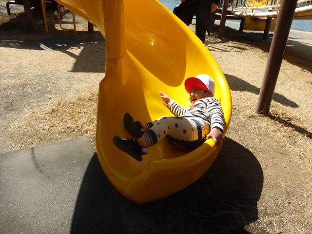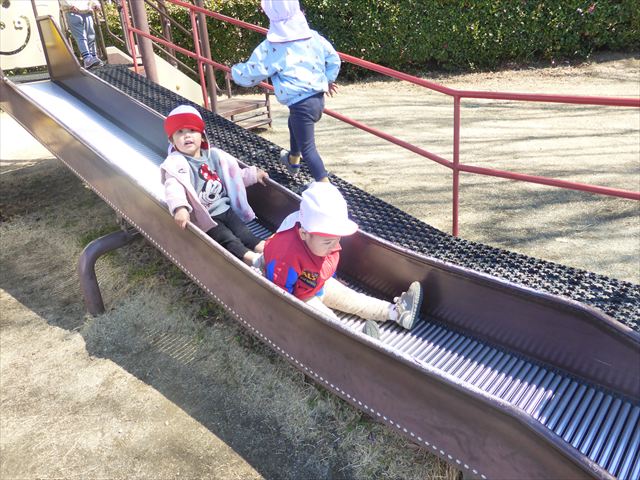 長い滑り台の砦遊具やふわふわドーム、ターザンロープや楽しい遊具、珍しい遊具に目を輝かせ、昼食時間まで思い切り楽しみました!(^_^)b ヘ(^o^)/