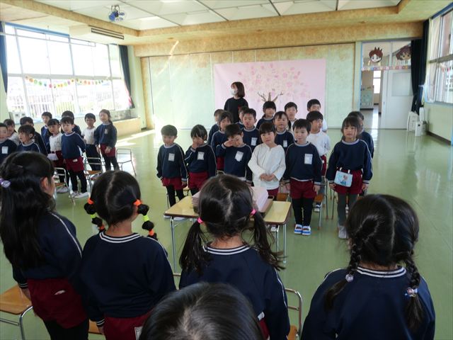 卒園式とお別れ会の練習をしました。昨日よりも真剣に取り組める様になり、言葉も間違えずに言えるようになりました。あと少し頑張っていきたいと思います。