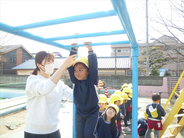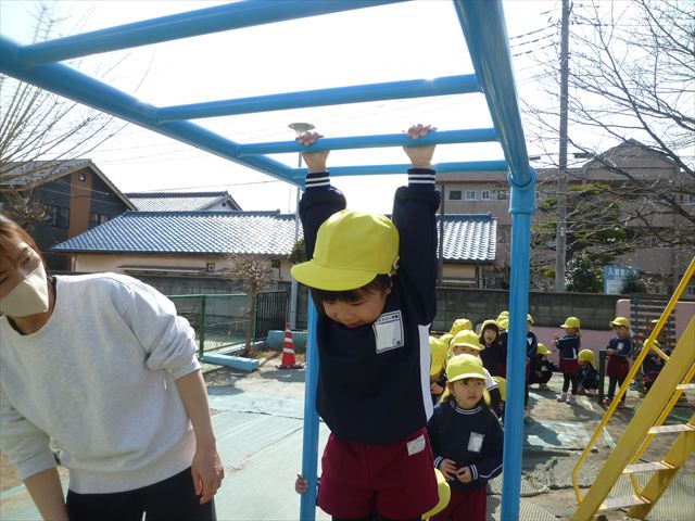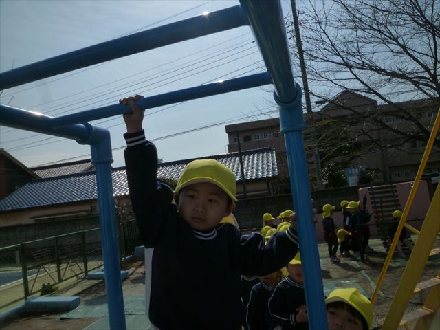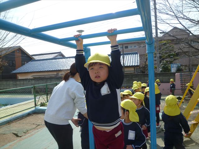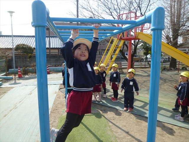 今日は、体育の時間として「ラダー」「ケンパ」「雲梯」をしました。ラダーやケンパは、繰り返し楽しむ姿が見られました(