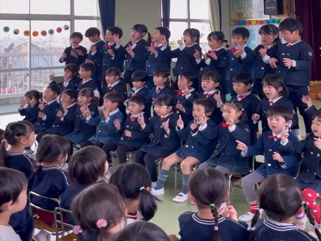 最後に年長さんたちからは、在園の子どもたちへ「お礼」と「さようなら!」の気持ちを込めて、「お別れの言葉」と「手話ソング(思い出のアルバム)」と「ともだちになるために」の歌をお返しに歌ってくれました。しっかり手話を覚えて、しかも感情を込めて丁寧に歌ってくれました!とても素晴らしかったです!感動の発表でした。さすが年長さんでした!別れは本当に悲しいですね!(ToT) 年長さんたちありがとうございました!<(_ _)>