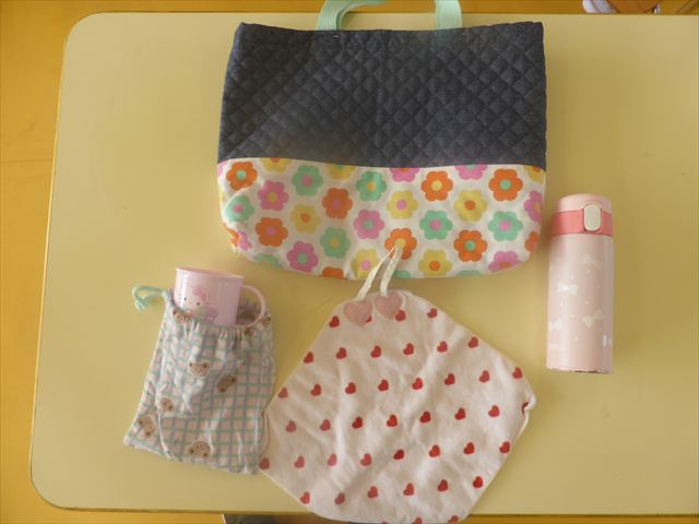 手提げカバンの中には、タオル・コップ・水筒を入れてきてください。