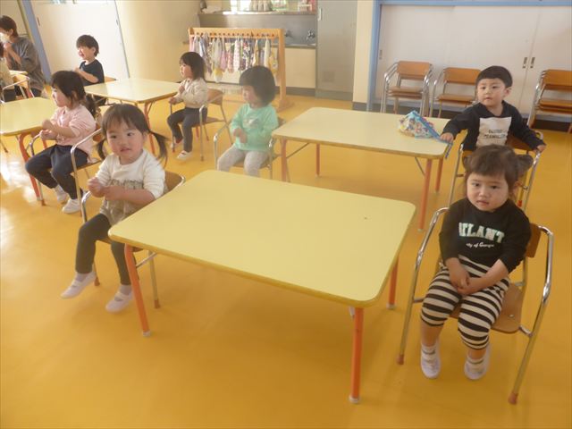 たんぽぽ組二日目の今日は、国語の時間で大型絵本の読み聞かせをしました!今回読んだ絵本は「いっしょにあそぼ」です。ドアの向こうに、いろいろな動物さんが待っています。チラッと見える動物さんの身体を見て「うさぎさん!」「ぞうさん!」と元気に答えてくれました!(^^)!ママがいいと泣いていた子も、大型絵本を見るとピタッと泣き止み、真剣な眼差しで見てくれました。また今度違う絵本も読んでみたいと思います!
