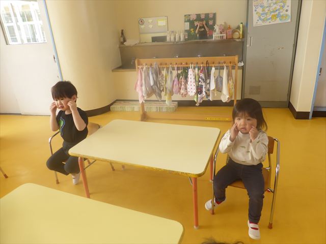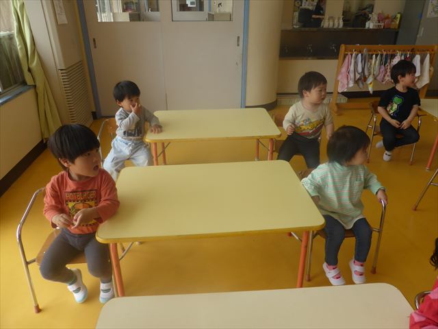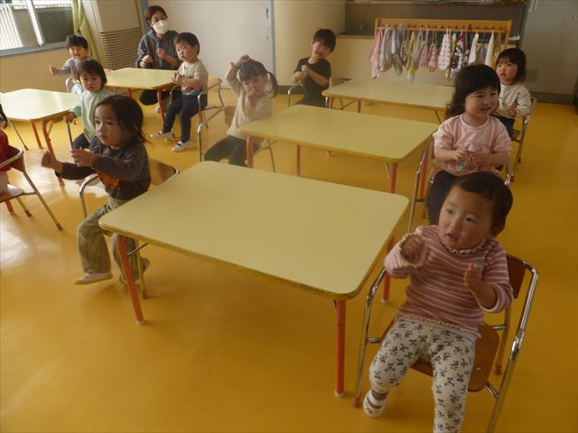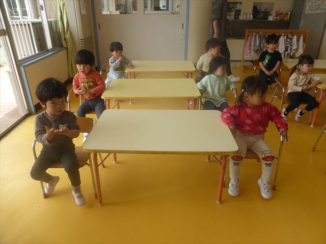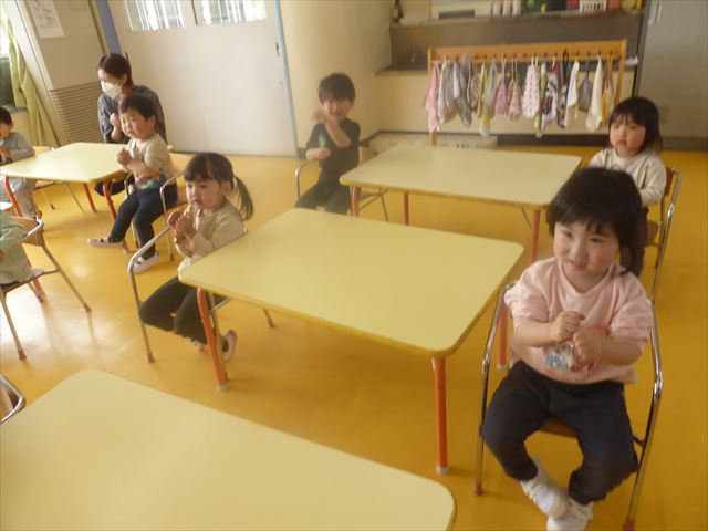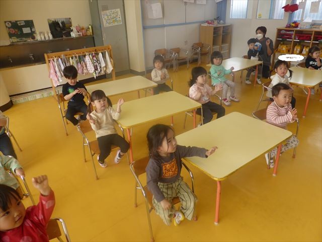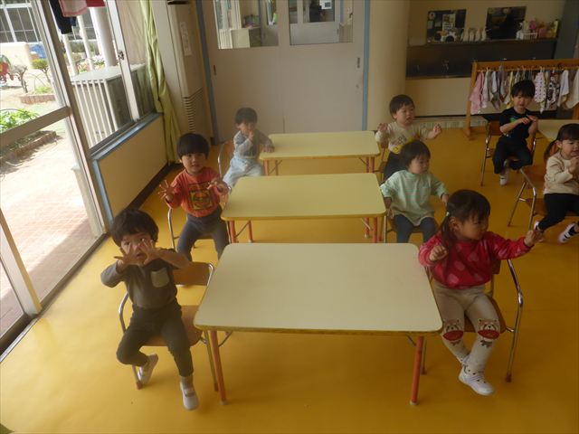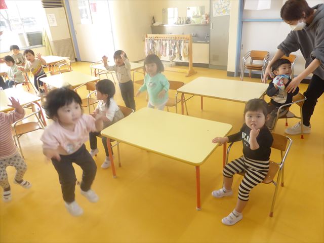 朝の会の歌の様子をお届けします!まずはみんなでアンパンマンの手遊び。先生のお手本をよく見て、上手にまねっこしてアンパンマンのキャラクターに変身できました!「むすんでひらいて」の歌では、ウサギや飛行機やカエルに変身して、お部屋をお散歩♪音楽に合わせてたくさん体を動かして、とても楽しそうでした(
