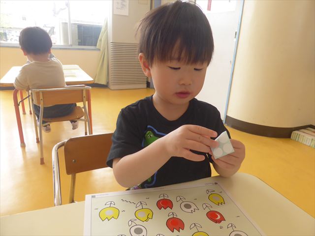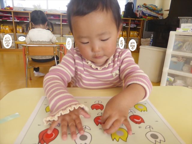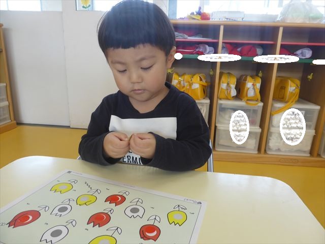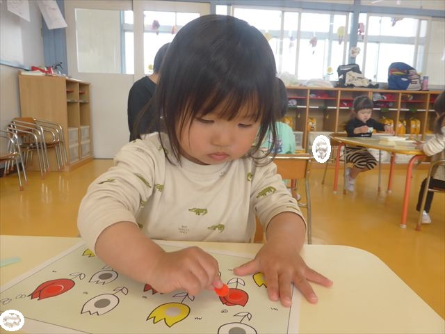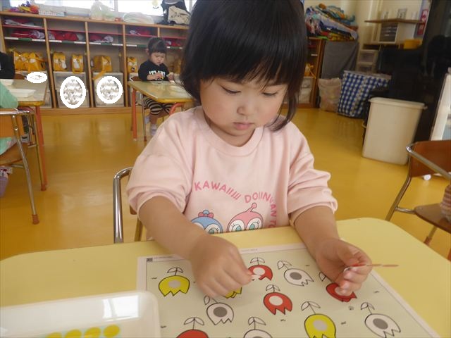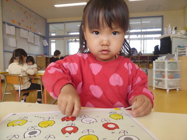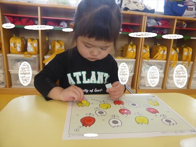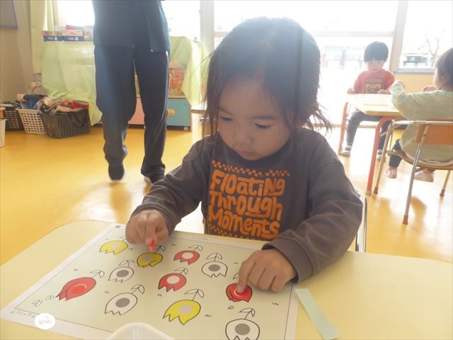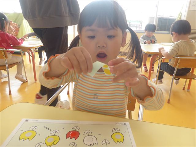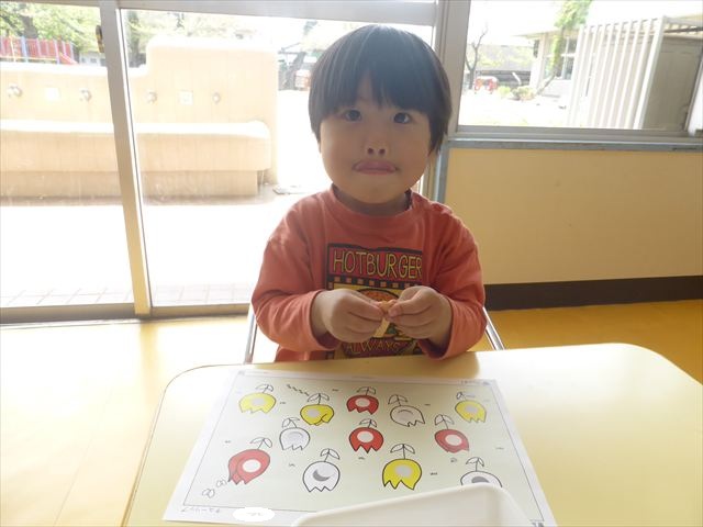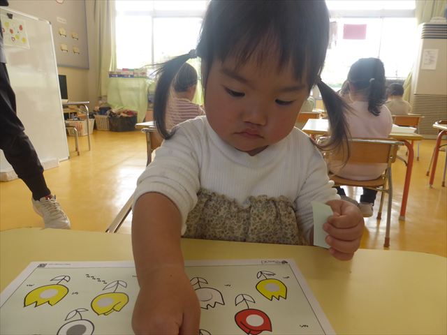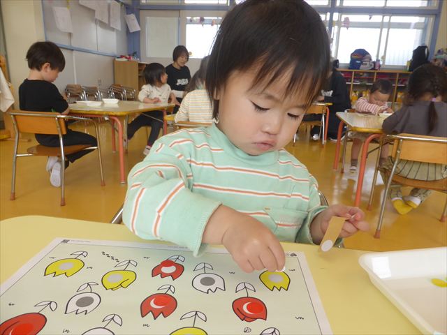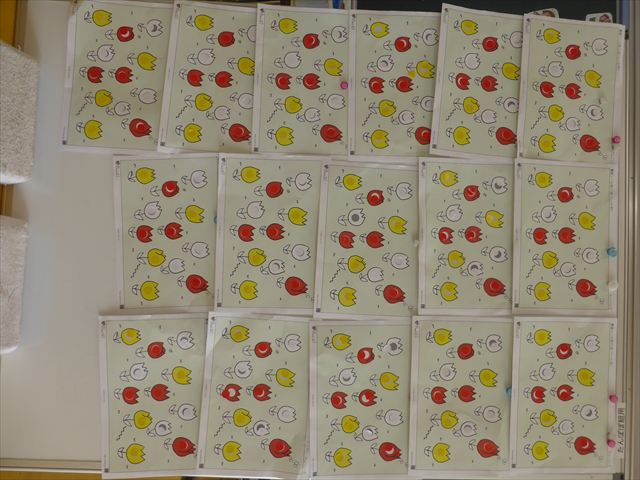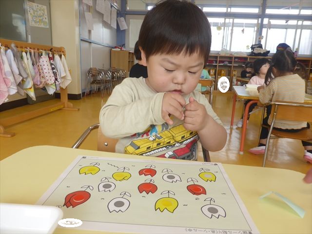 シール遊びをしました。赤白黄色のチューリップに○があるので、同じ色のシールを貼れるかチャレンジ!みんなシールをよく見て、同じ色のチューリップに貼ることができました。ホワイトボードに貼り、チューリップ畑の完成です(^_^)最後はみんなで「チューリップ」の歌を歌いました♪今日持ち帰りましたので、ぜひご覧ください!