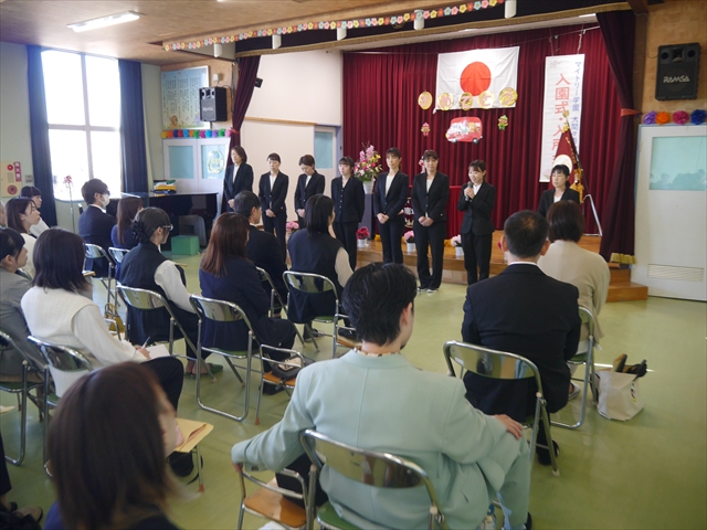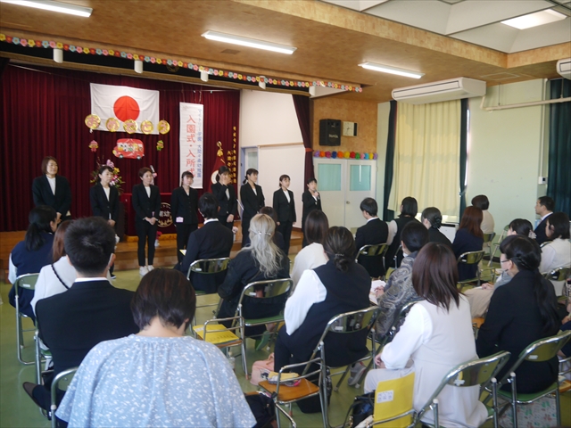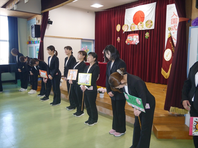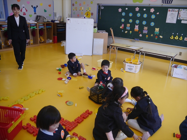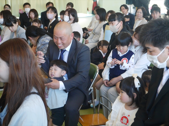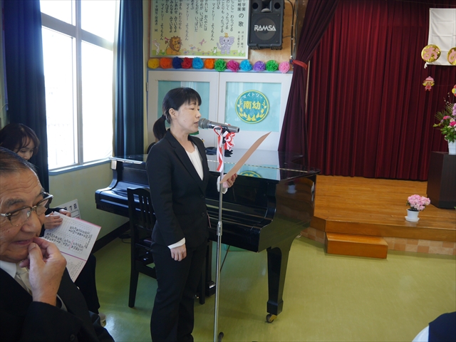始業式では、園長先生から「みんな一つ学年が上がり、年長さん、年中さんになりました。新しい学年が始まり、いろいろ期待したり、わくわくどきどきしたり、心配したりすることがあるかもしれないけど、大丈夫!大間々南幼稚園の先生はいい先生ばかりで、みんなをいっぱい応援してくれるから安心して下さい。そして友達もいい子ばかりだから、楽しい1年になります。だから、とにかくみんなは元気に登園して、友だちと仲良くいっぱい遊んで、いろいろなことに逃げずに自分からどんどん取り組んで頑張っていって下さい。」と話しがありました。子どもたちは元気に「はい!」と答えてくれました。みんな期待してますよ!そして、「みんなが進級したお祝いに明日は、早速遠足をします。いい天気の中、菜の花畑や鹿田山を散策していっぱい遊んで、美味しいお弁当を食べようと思います。」と話をしたら、子どもたちは大喜びでした。お母さん、お父さん、明日美味しい「手作り弁当」をよろしくお願いします。m(_ _)m そのあと、担任・職員紹介がありましたが、詳細は園だより第1号をご覧下さい。m(_ _)m
